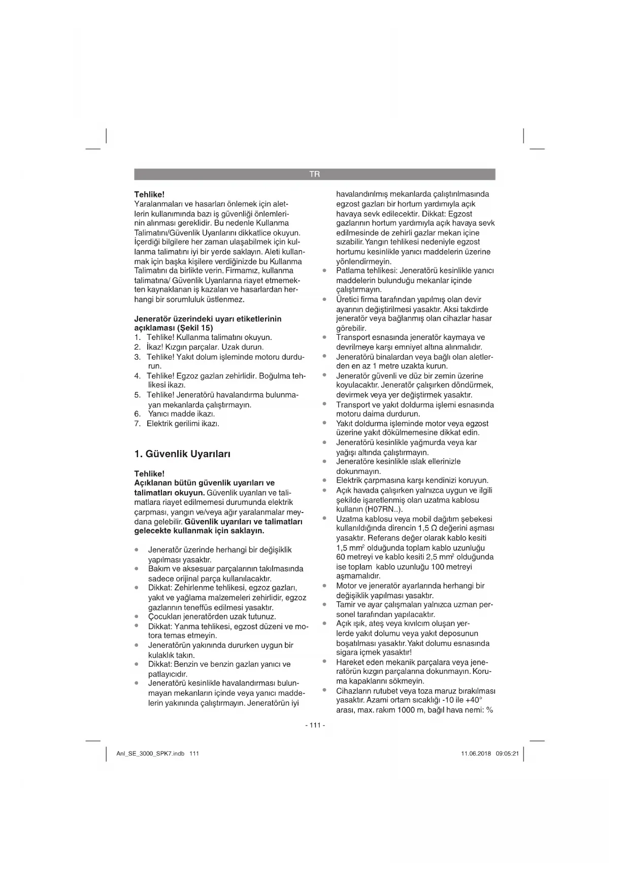 Tehlike! Yaralanmaları ve hasarları önlemek için alet- lerin kullanımında bazı iş güvenliği önlemleri- nin alınması gereklidir. Bu nedenle Kullanma Talimatını/Güvenlik Uyarılarını dikkatlice okuyun. İçerdiği bilgilere her zaman ulaşabilmek için kul- lanma talimatını iyi bir yerde saklayın. Aleti kullan- mak için başka kişilere verdiğinizde bu Kullanma Talimatını da birlikte verin. Firmamız, kullanma talimatına/ Güvenlik Uyarılarına riayet etmemek- ten kaynaklanan iş kazaları ve hasarlardan her- hangi bir sorumluluk üstlenmez. Jeneratör üzerindeki uyarı etiketlerinin açıklaması (Şekil 15)