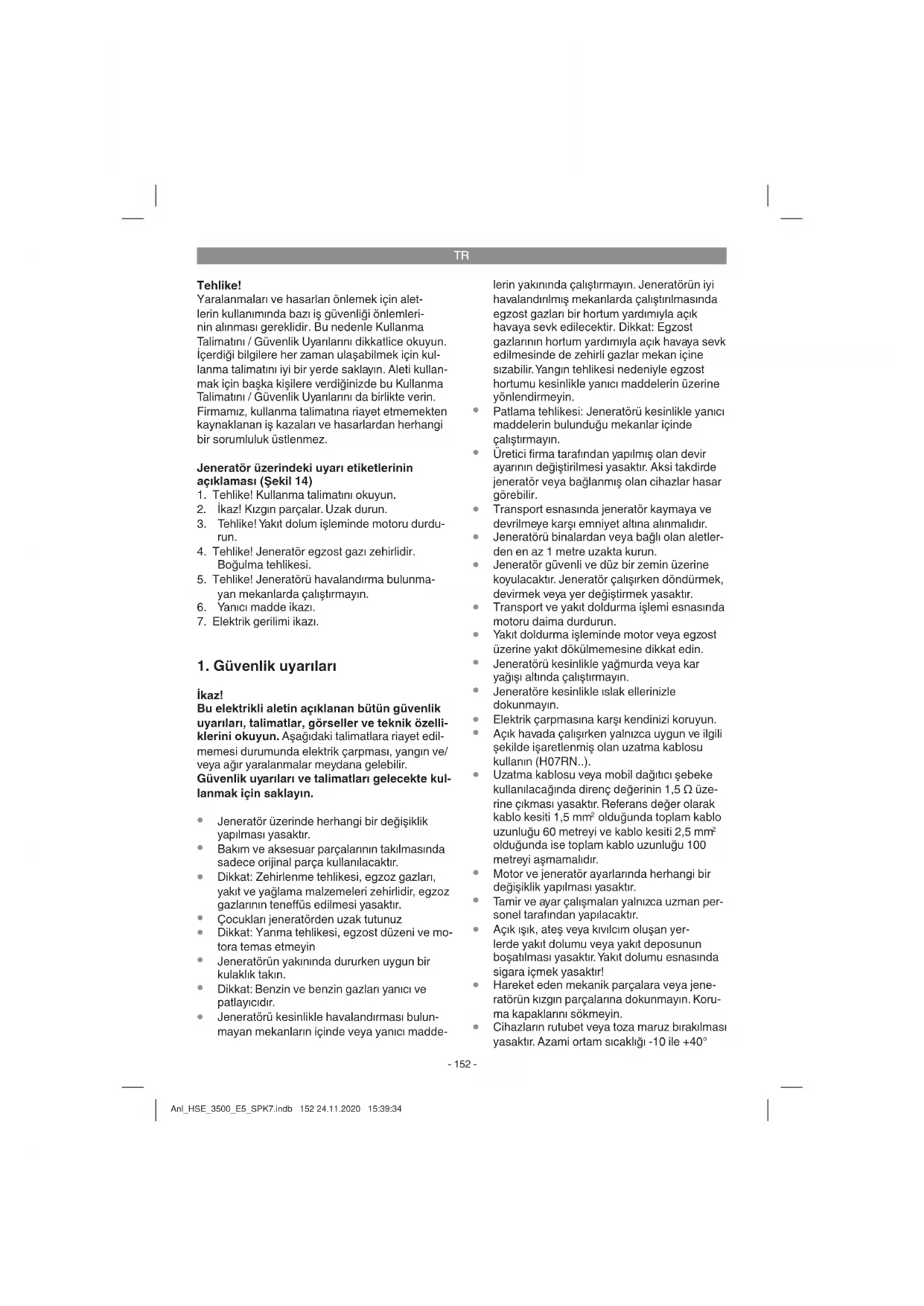 Jeneratörü evin elektrik şebekesine bağlamayınız, aksi taktirde jeneratör veya ev- deki diğer elektrikli aletler zarar görebilir. Uyarı: Bazı elektrikli el aletlerinin (dekupaj tes- teresi, matkap vs. ) cereyan sarfi yatı zor çalışma şartlarında çalıştırıldığında, tip etiketinde belirtilen cereyan sarfi yatından daha yüksektir. Bazı elektrikli cihazlar (örneğin televizyon, bilgisa- yar, ...) jeneratör ile çalıştırılmamalıdır. Anl_HSE_3500_E5_SPK7.indb 155 24.11.2020 15:39:35TR