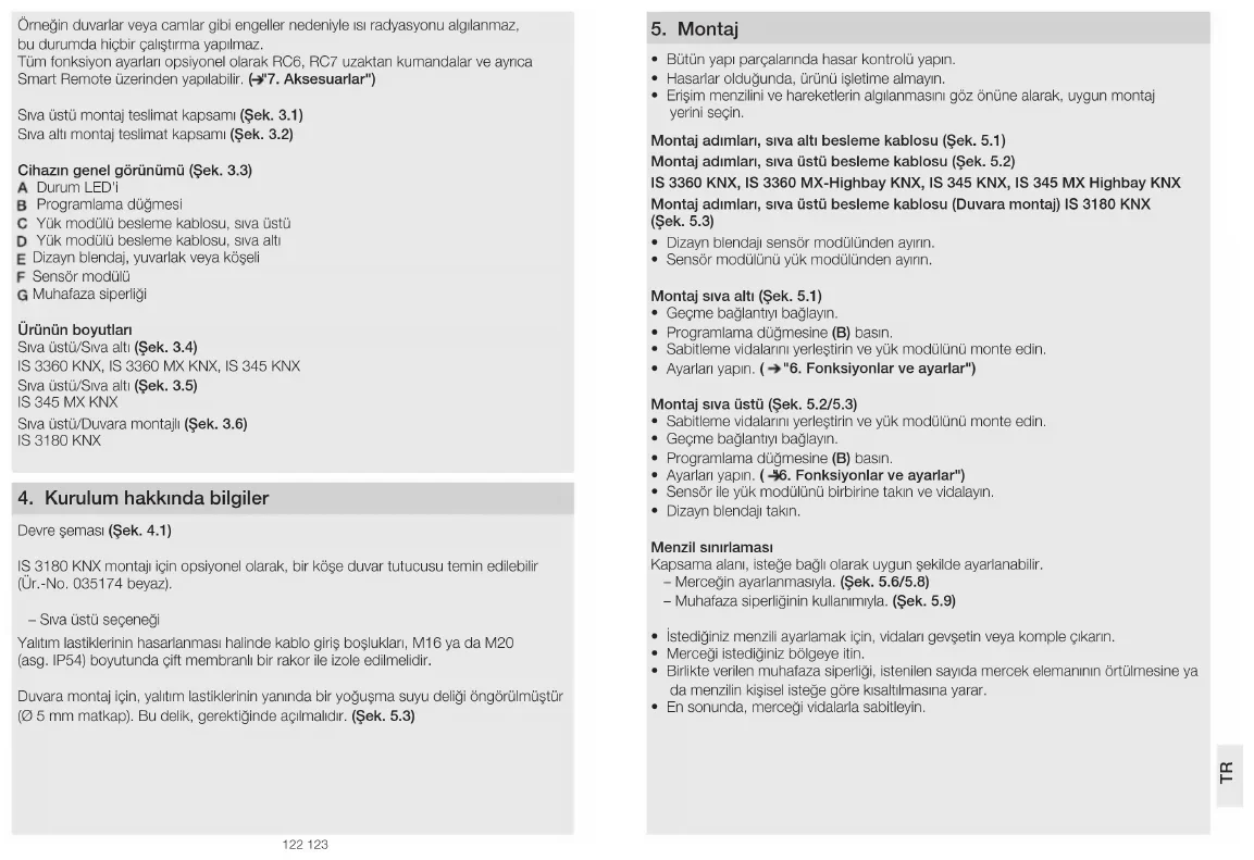 Dokümandaki metin kısımlarına gönderme 2 Genel güvenlik uyarıları Sensör üzerindeki tüm çalışmalardan önce, elektrik beslemesini kesin!• Kurulum sadece teknik personel tarafından, VDE 08 29 (DIN EN 5000 90) gelenek-sel kurulum talimatları uyarınca gerçekleştirilebilir.• Alçak gerilimli ürünlerin bulunduğu bir ortamda yapılan usulüne aykırı bir montaj işlemi, sağlığa veya maddi değerlere yönelik zararlara yol açabilir.• Bu cihaz, düşük gerilim çevrimlerine bağlanmak üzere tasarlanmış olması nedeniy-le, asla alçak gerilime (230 V AC) bağlanmamalıdır.• Sadece orijinal yedek parçalar kullanın.• Onarımlar sadece, uzman atölyeler tarafından gerçekleştirilebilir. 3 IS3360, IS3360 MX, IS345, IS 345 MX, IS3180 KNX Amacına uygun kullanım – IS3360MXKNX ve IS345MXKNX, iç mekanda tavana montaj için uygundur. – IS3360KNX ve IS345KNX, iç ve dış mekanda tavana montaj için uygundur. – IS3180KNX, iç ve dış mekanda duvara montaj için uygundur. – Sıva altı seçenekleri sadece, iç mekanda tavana montaj için uygundur.Kızıl ötesi sensör, ışığın otomatik olarak açılması için kullanılır. Öngörülmüş olan sabo-taj güvenliğinin bulunmayışı nedeniyle cihaz, özel hırsız alarmı sistemlerinde kullanıma uygun değildir. Hareket dedektörü, hareket eden bedenlerden (insanlar, hayvanlar, vb.) yayılan görünmez ısı radyasyonunu algılayan piro sensörlerle donatılmıştır. Kaydedilen bu ısı radyasyonu elektronik forma dönüştürülür ve buna bağlı bulunan bir kullanıcı cihaz (örn. bir lamba) çalıştırılır. Ek olarak, dahili bir kırmızı LED yanar.