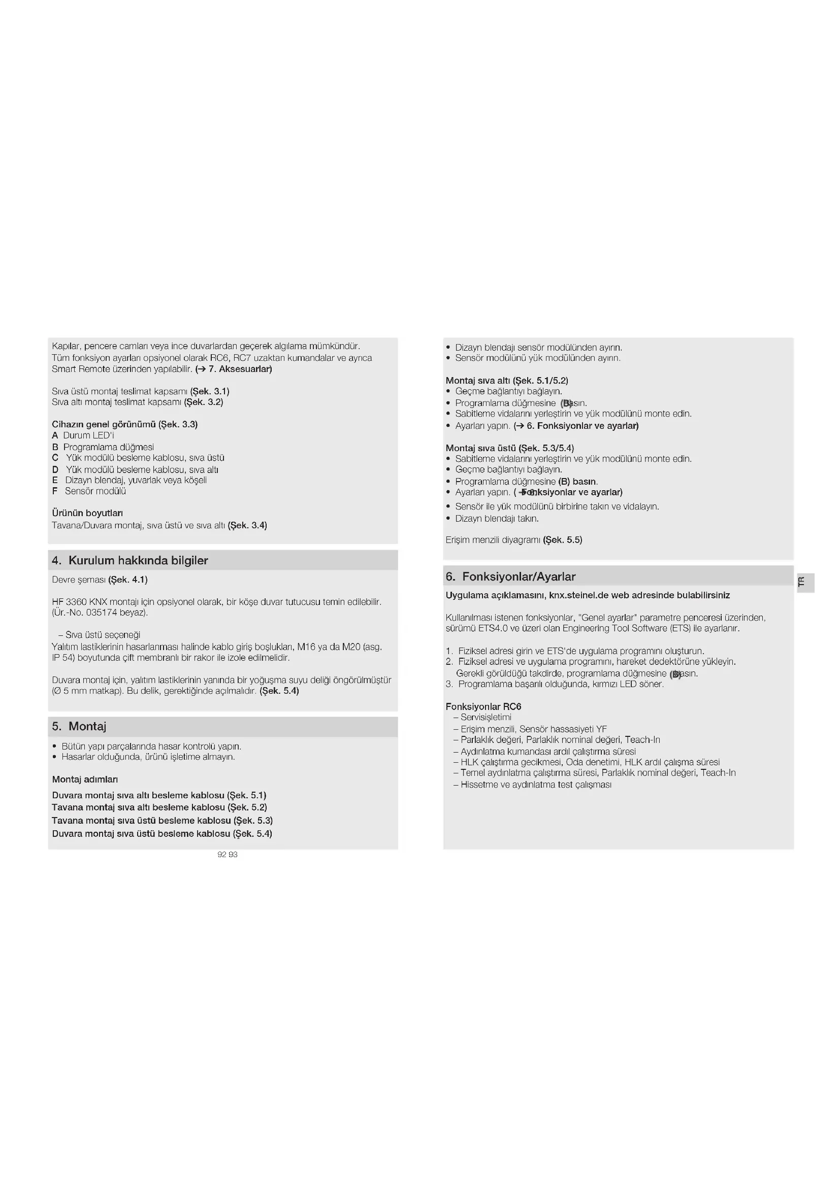 TR92 93 Kapılar, pencere camları veya ince duvarlardan geçerek algılama mümkündür. Tüm fonksiyon ayarları opsiyonel olarak RC6, RC7 uzaktan kumandalar ve ayrıca Smart Remote üzerinden yapılabilir. (➔ 7 Aksesuarlar) Sıva üstü montaj teslimat kapsamı (Şek31) Sıva altı montaj teslimat kapsamı (Şek32) Cihazın genel görünümü (Şek 33) A Durum LED'i B Programlama düğmesi C Yük modülü besleme kablosu, sıva üstü D Yük modülü besleme kablosu, sıva altı E Dizayn blendaj, yuvarlak veya köşeli F Sensör modülü Ürünün boyutları Tavana/Duvara montaj, sıva üstü ve sıva altı (Şek34) 4 Kurulum hakkında bilgiler Devre şeması (Şek41) HF3360KNX montajı için opsiyonel olarak, bir köşe duvar tutucusu temin edilebilir. (Ür.-No. 035174 beyaz). – Sıva üstü seçeneği Yalıtım lastiklerinin hasarlanması halinde kablo giriş boşlukları, M16 ya da M20 (asg. IP54) boyutunda çift membranlı bir rakor ile izole edilmelidir. Duvara montaj için, yalıtım lastiklerinin yanında bir yoğuşma suyu deliği öngörülmüştür (Ø 5mm matkap). Bu delik, gerektiğinde açılmalıdır. (Şek 54) 5 Montaj