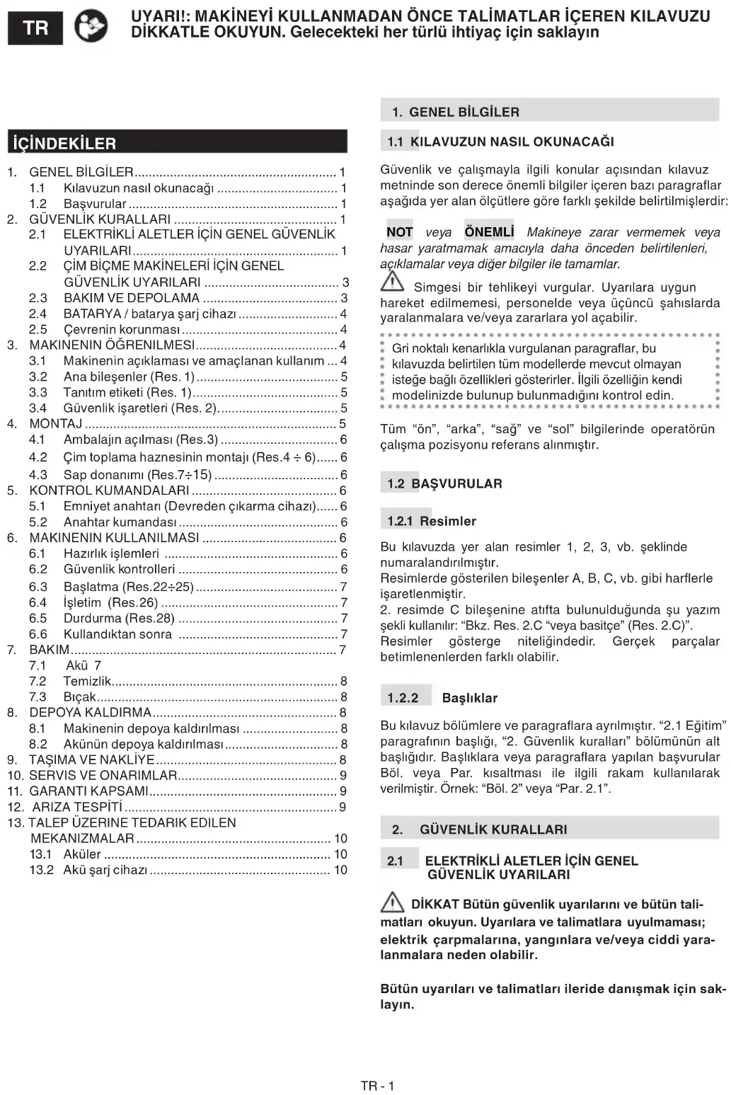 DİKKAT Aşağıda yer alan güvenlik kuralları, makineye bağlı batarya ile batarya şarj cihazının kendi kitapçığında belirtilen güvenlik talimatlarına ektir.
