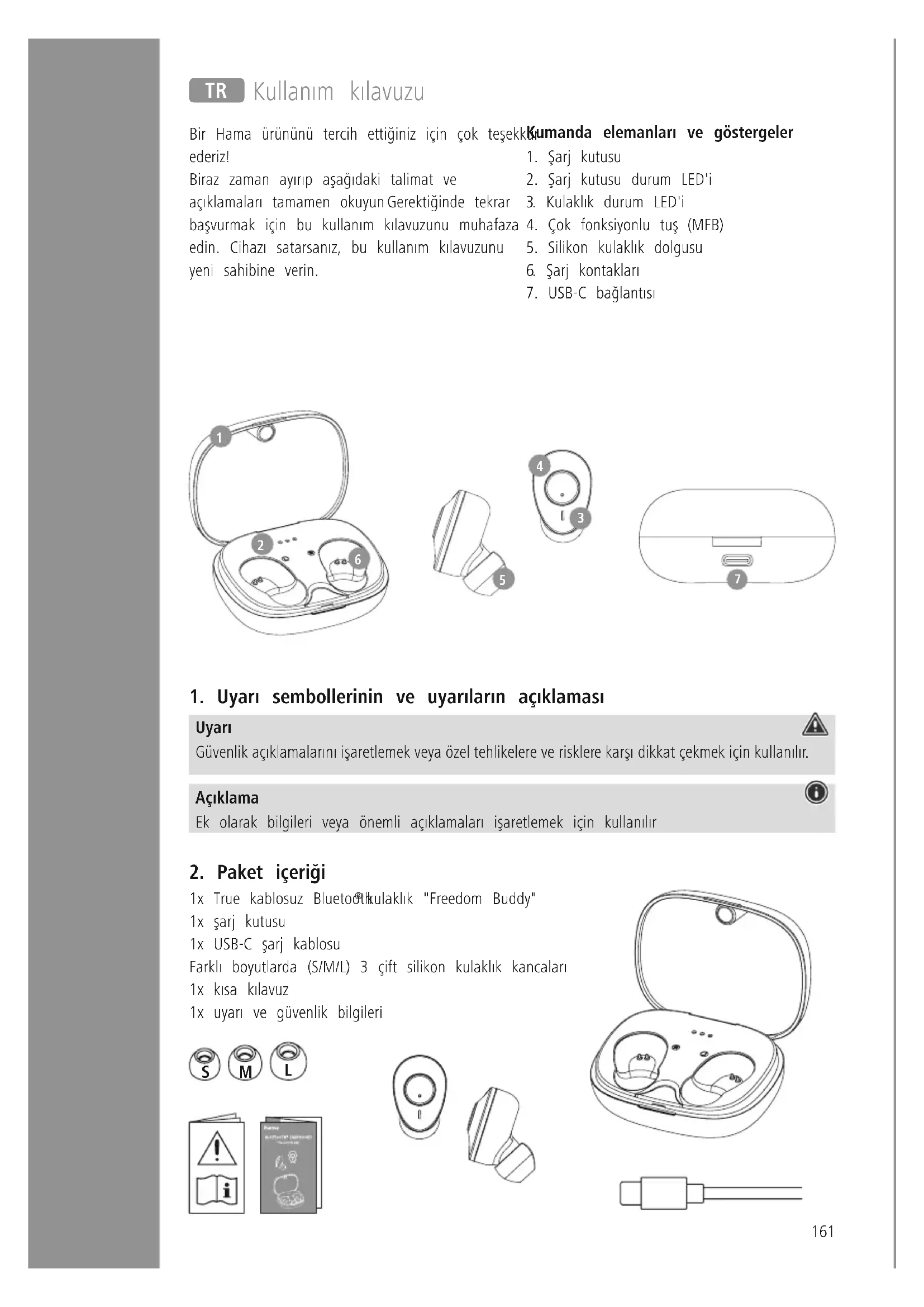kulaklık "Freedom Buddy" 1x şarj kutusu 1x USB-C şarj kablosu Farklı boyutlarda (S/M/L) 3 çift silikon kulaklık kancaları 1x kısa kılavuz 1x uyarı ve güvenlik bilgileri