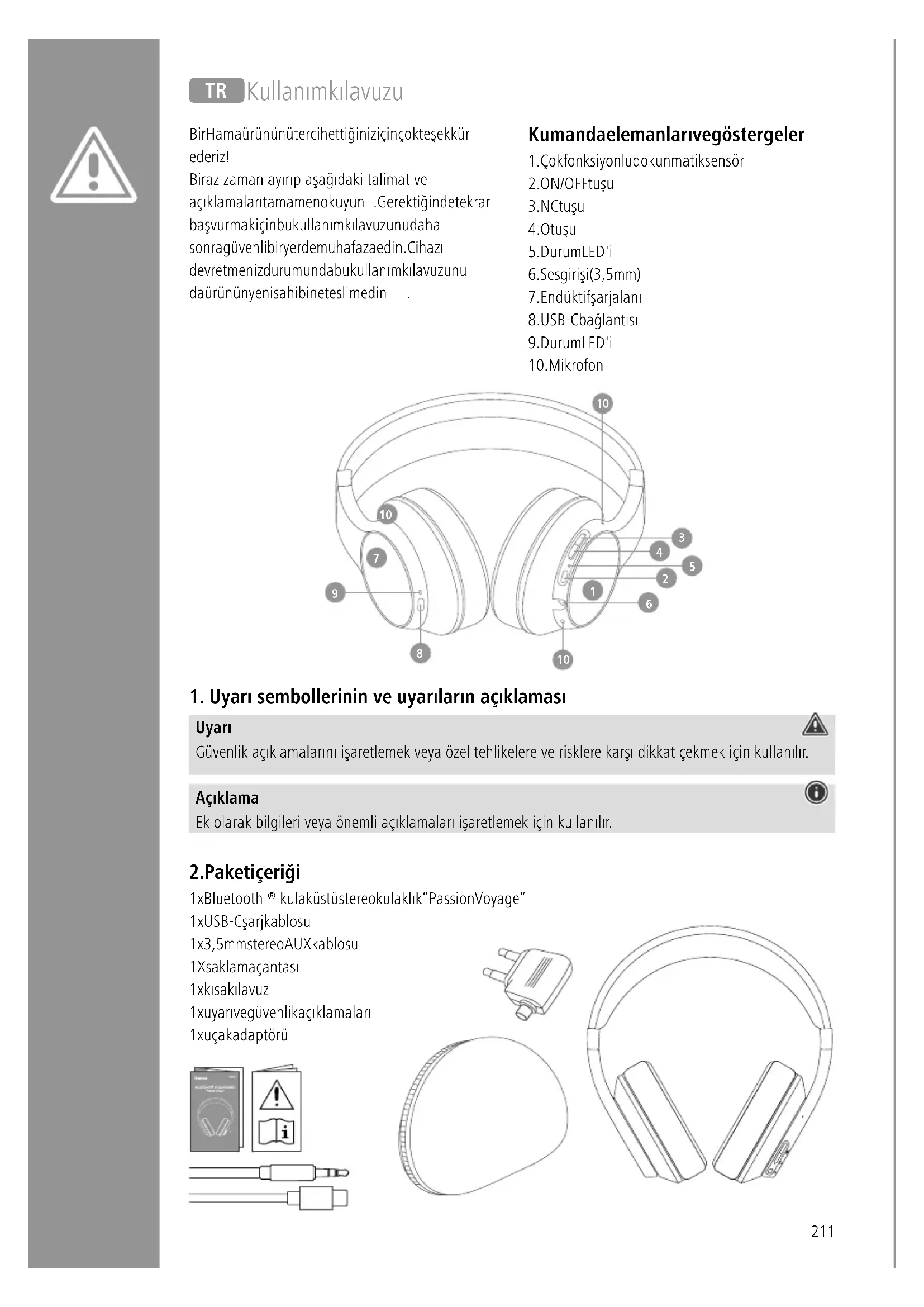 kulak üstü stereo kulaklık “Passion Voyage” 1x USB-C şarj kablosu 1x 3,5mm stereo AUX kablosu 1X saklama çantası 1x kısa kılavuz 1x uyarı ve güvenlik açıklamaları 1x uçak adaptörü T Kullanım kılavuzu Bir Hama ürününü tercih ettiğiniz için çok teşekkür ederiz! Biraz zaman ayırıp aşağıdaki talimat ve açıklamaları tamamen okuyun Gerektiğinde tekrar başvurmak için bu kullanım kılavuzunu daha sonra güvenli bir yerde muhafaza edin Cihazı devretmeniz durumunda bu kullanım kılavuzunu da ürünün yeni sahibine teslim edin