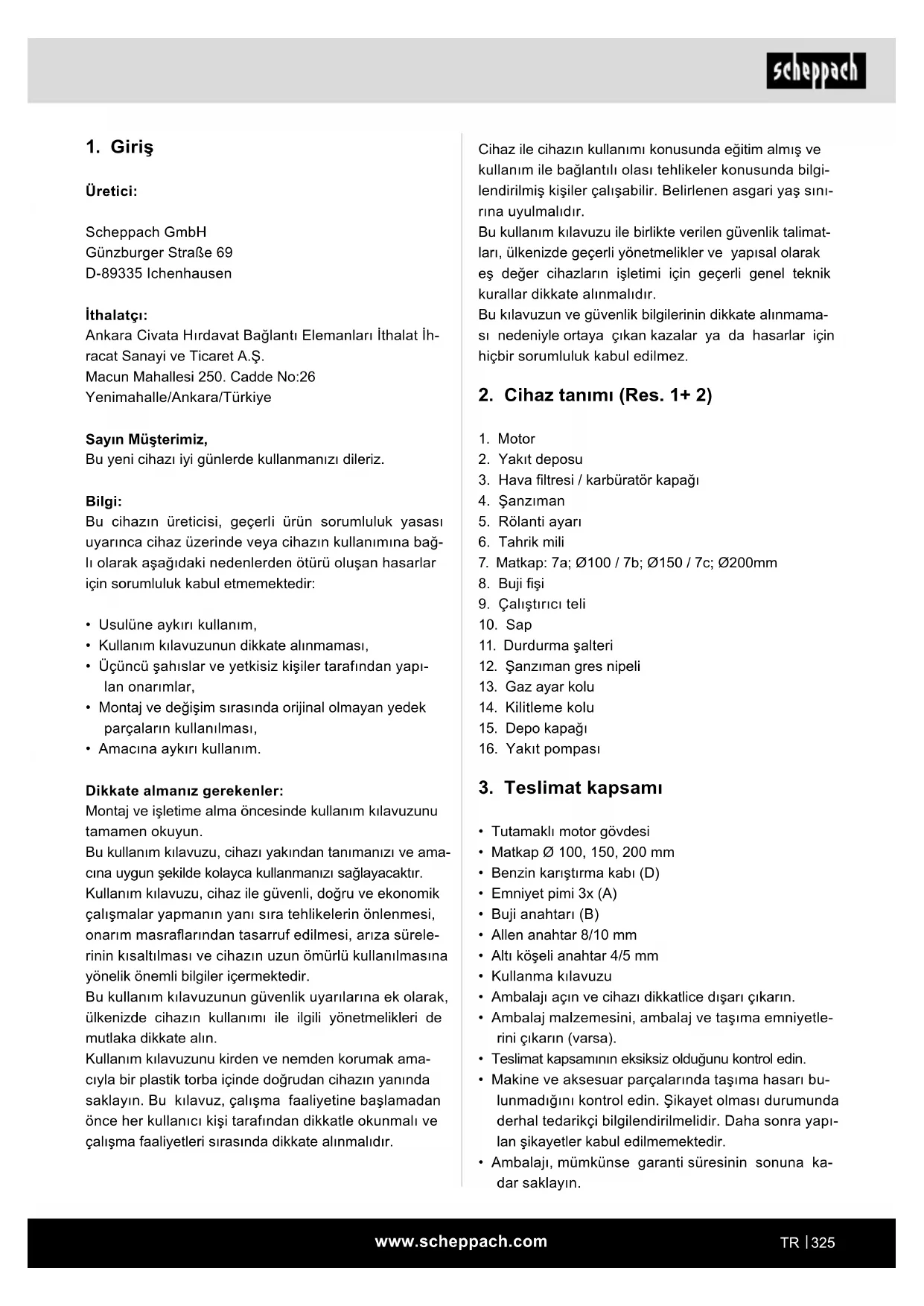 Üretici: Scheppach GmbH Günzburger Straße 69 D-89335 Ichenhausen İthalatçı: Ankara Civata Hırdavat Bağlantı Elemanları İthalat İh- racat Sanayi ve Ticaret A.Ş. Macun Mahallesi 250. Cadde No:26 Yenimahalle/Ankara/Türkiye Sayın Müşterimiz, Bu yeni cihazı iyi günlerde kullanmanızı dileriz. Bilgi: Bu cihazın üreticisi, geçerli ürün sorumluluk yasası uyarınca cihaz üzerinde veya cihazın kullanımına bağ- lı olarak aşağıdaki nedenlerden ötürü oluşan hasarlar için sorumluluk kabul etmemektedir: