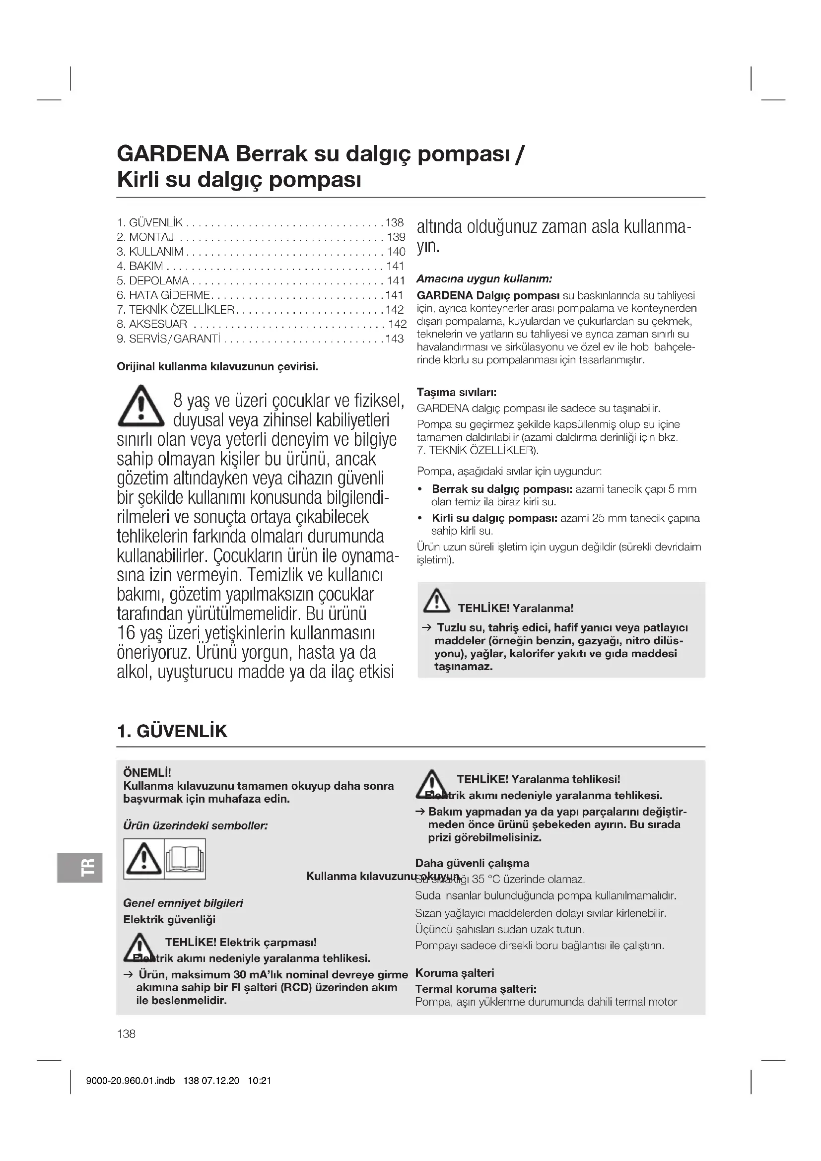 Orijinal kullanma kılavuzunun çevirisi. 8 yaş ve üzeri çocuklar ve fiziksel, duyusal veya zihinsel kabiliyetleri sınırlı olan veya yeterli deneyim ve bilgiye sahip olmayan kişiler bu ürünü, ancak gözetim altındayken veya cihazın güvenli bir şekilde kullanımı konusunda bilgilendi- rilmeleri ve sonuçta ortaya çıkabilecek tehlikelerin farkında olmaları durumunda kullanabilirler. Çocukların ürün ile oynama- sına izin vermeyin. Temizlik ve kullanıcı bakımı, gözetim yapılmaksızın çocuklar tarafından yürütülmemelidir. Bu ürünü 16yaş üzeri yetişkinlerin kullanmasını öneriyoruz. Ürünü yorgun, hasta ya da alkol, uyuşturucu madde ya da ilaç etkisi altında olduğunuz zaman asla kullanma- yın. Amacına uygun kullanım: GARDENA Dalgıç pompası su baskınlarında su tahliyesi için, ayrıca konteynerler arası pompalama ve konteynerden dışarı pompalama, kuyulardan ve çukurlardan su çekmek, teknelerin ve yatların su tahliyesi ve ayrıca zaman sınırlı su havalandırması ve sirkülasyonu ve özel ev ile hobi bahçele- rinde klorlu su pompalanması için tasarlanmıştır. Taşıma sıvıları: GARDENA dalgıç pompası ile sadece su taşınabilir. Pompa su geçirmez şekilde kapsüllenmiş olup su içine tamamen daldırılabilir (azami daldırma derinliği için bkz.