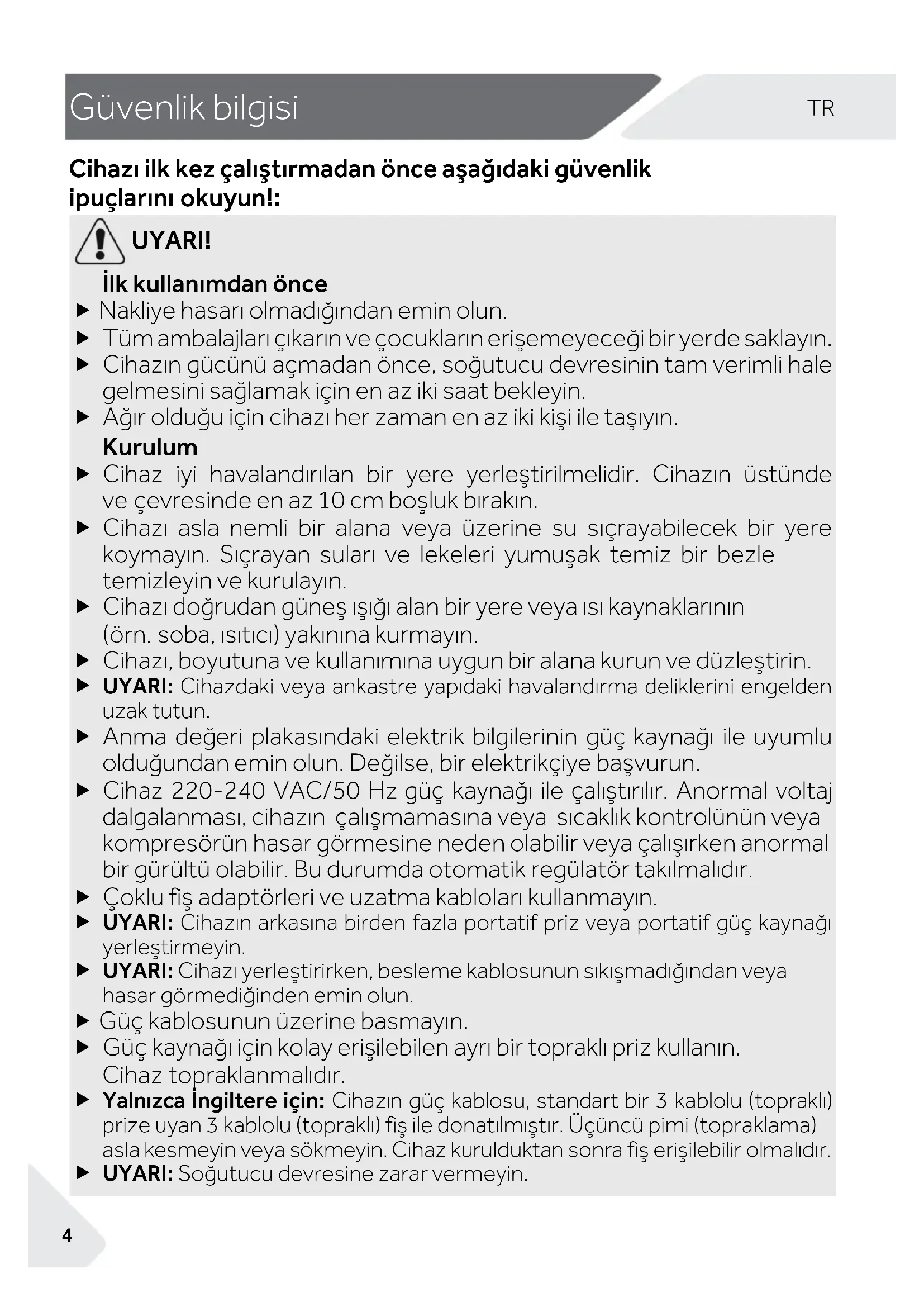 UYARI! İlk kullanımdan önce Nakliye hasarı olmadığından emin olun. Tüm ambalajları çıkarın ve çocukların erişemeyeceği bir yerde saklayın. Cihazın gücünü açmadan önce, soğutucu devresinin tam verimli hale gelmesini sağlamak için en az iki saat bekleyin. Ağır olduğu için cihazı her zaman en az iki kişi ile taşıyın. Kurulum Cihaz iyi havalandırılan bir yere yerleştirilmelidir. Cihazın üstünde ve çevresinde en az 10 cm boşluk bırakın. Cihazı asla nemli bir alana veya üzerine su sıçrayabilecek bir yere koymayın. Sıçrayan suları ve lekeleri yumuşak temiz bir bezle temizleyin ve kurulayın. Cihazı doğrudan güneş ışığı alan bir yere veya ısı kaynaklarının (örn. soba, ısıtıcı) yakınına kurmayın. Cihazı, boyutuna ve kullanımına uygun bir alana kurun ve düzleştirin. UYARI: Cihazdaki veya ankastre yapıdaki havalandırma deliklerini engelden uzak tutun. Anma değeri plakasındaki elektrik bilgilerinin güç kaynağı ile uyumlu olduğundan emin olun. Değilse, bir elektrikçiye başvurun. Cihaz 220-240 VAC/50 Hz güç kaynağı ile çalıştırılır. Anormal voltaj dalgalanması, cihazın çalışmamasına veya sıcaklık kontrolünün veya kompresörün hasar görmesine neden olabilir veya çalışırken anormal bir gürültü olabilir. Bu durumda otomatik regülatör takılmalıdır. Çoklu fiş adaptörleri ve uzatma kabloları kullanmayın. UYARI: Cihazın arkasına birden fazla portatif priz veya portatif güç kaynağı yerleştirmeyin. UYARI: Cihazı yerleştirirken, besleme kablosunun sıkışmadığından veya hasar görmediğinden emin olun. Güç kablosunun üzerine basmayın. Güç kaynağı için kolay erişilebilen ayrı bir topraklı priz kullanın. Cihaz topraklanmalıdır. Yalnızca İngiltere için: Cihazın güç kablosu, standart bir 3 kablolu (topraklı) prize uyan 3 kablolu (topraklı) fiş ile donatılmıştır. Üçüncü pimi (topraklama) asla kesmeyin veya sökmeyin. Cihaz kurulduktan sonra fiş erişilebilir olmalıdır. UYARI: Soğutucu devresine zarar vermeyin.5