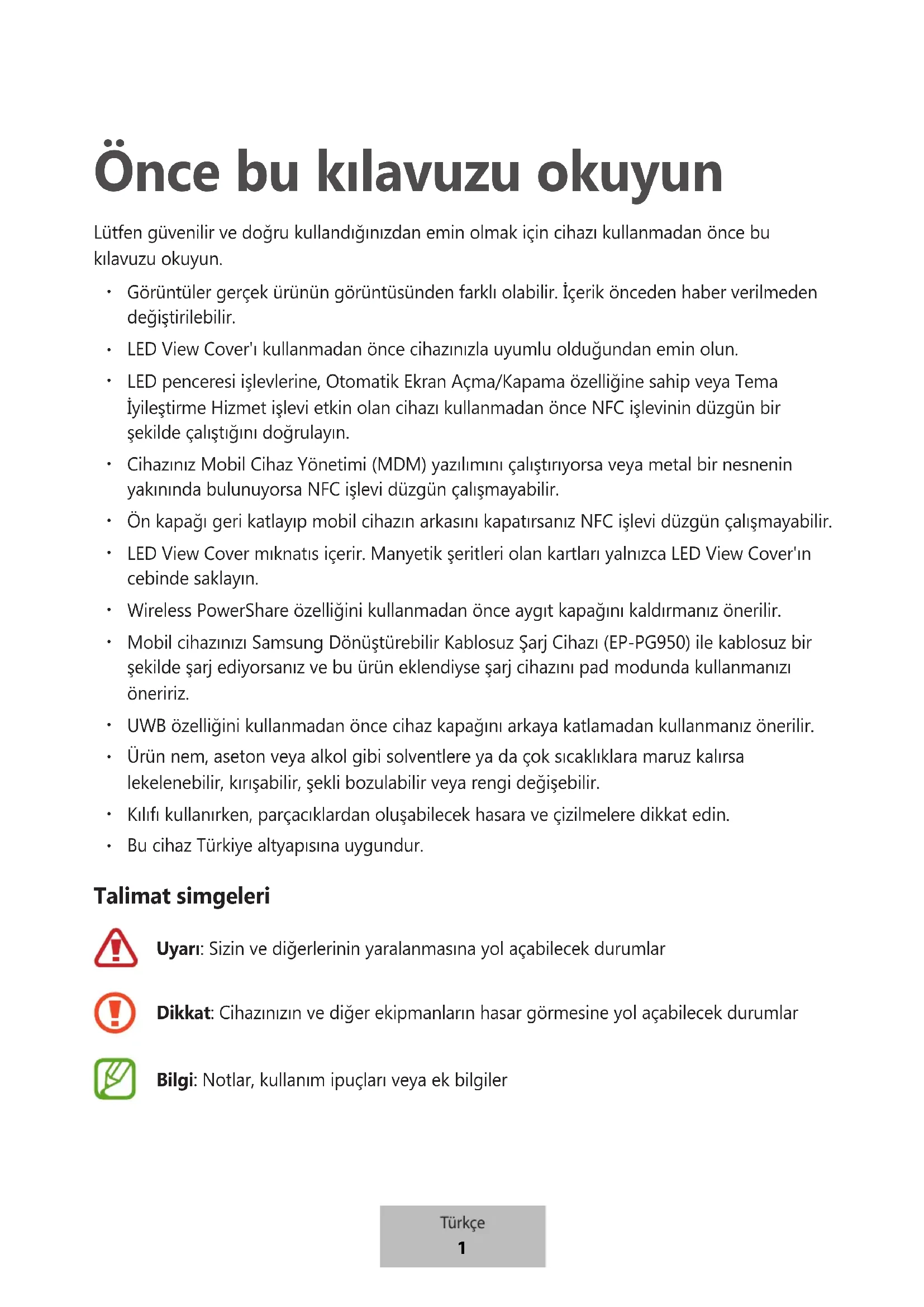 Aksesuarlar üzerine dokunup daha sonra LED simge düzenleyici özelliğini kullanabilirsiniz. LED View Cover'ı mobil cihaza taktığınızda görünen LED simge editörü uygulamasını kullanabilirsiniz. Türkçe 6Samsung Çağrı Merkezi : 444 77 11 Üretici Firma: SAMSUNG ELECTRONICS CO., LTD 443-742 129, SAMSUNG-RO, YEONGTONG-GU SUWON KYONGGI-DO SOUTH KOREA Tel: +82-2-2255-0114 İthalatçı Firma: Samsung Electronics İstanbul Paz. ve Tic. Ltd. Şti Adres: Defterdar Mah. Otakçılar Cad. Sinpaş Flatofis Apt. No: 78/46 Eyüpsultan/İSTANBUL TÜRKİYE Tel:+90 212 467 0600 Telif hakkı Telif hakkı © 2020 Samsung Electronics Co., Ltd. Bu kılavuz uluslararası telif hakkı kanunları ile korunmaktadır. Bu kullanım kılavuzunun hiçbir kısmı çoğaltılamaz, dağıtılamaz, tercüme edilemez veya elektronik veya mekanik olarak herhangi bir şekilde aktarılamaz ve bunlara fotokopi çekme, kaydetme veya herhangi bir bilgi depolama ve alma sistemine saklama dahildir. Ticari Markalar