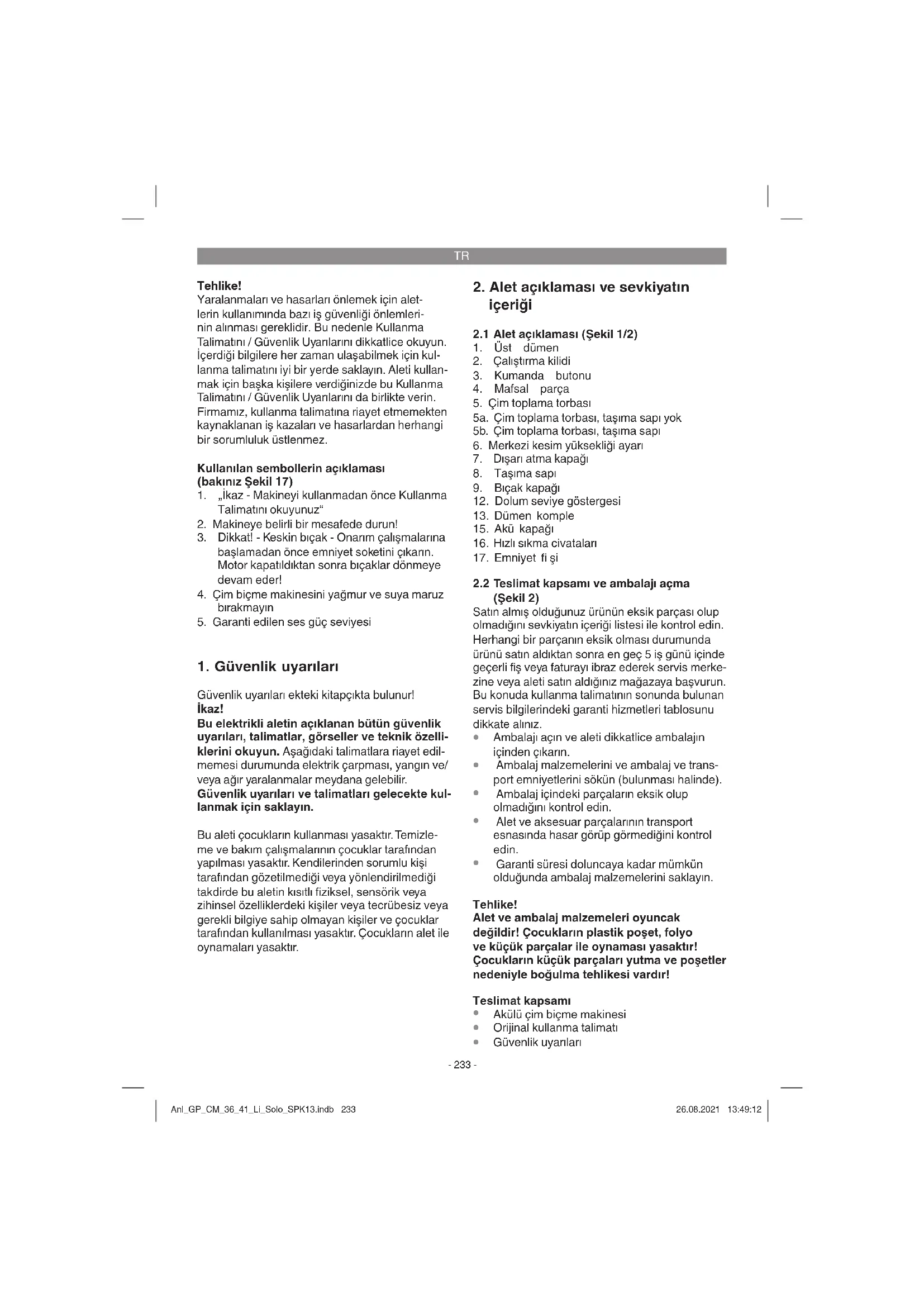 hasarları. İkaz! Bu alet işletme esnasında elektro manyetik alan oluşturur. Bu manyetik alan bazı du- rumlarda aktif veya pasif medikal implantları etkileyebilir. Ciddi yaralanmaları veya ölüm Anl_GP_CM_36_41_Li_Solo_SPK13.indb 234Anl_GP_CM_36_41_Li_Solo_SPK13.indb 234 26.08.2021 13:49:1226.08.2021 13:49:12TR