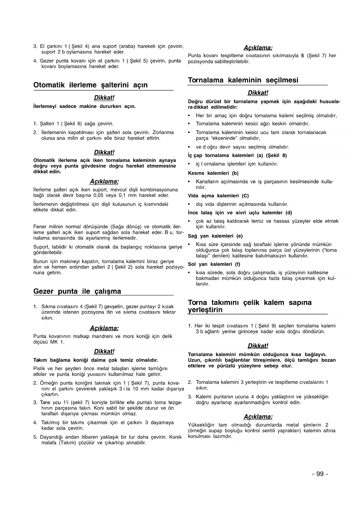 olursa ana milin el çarkını elle biraz hareket ettirin. Dikkat! Otomatik ilerleme açık iken tornalama kaleminin aynaya do¤ru veya punta gövdesine do¤ru hareket etmemesine dikkat edin. Açıklama: ‹lerleme flalteri açık iken suport, mevcut diflli kombinasyonuna ba¤lı olarak devir baflına 0,05 veya 0,1 mm hareket eder. ‹lerlemenin de¤ifltirilmesi için diflli kutusunun iç kısmındaki etikete dikkat edin. Fener milinin normal dönüflünde (Sa¤a dönüfl) ve otomatik iler- leme flalteri açık iken suport sa¤dan sola hareket eder.Bu, tor- nalama esnasında da ayarlanmıfl ilerlemedir. Suport, tabiidir ki otomatik olarak da bafllangıç noktasına geriye gönderilebilir. Bunun için makineyi kapatın, tornalama kalemini biraz geriye alın ve hemen ardından flalteri 2(fiekil 2) sola hareket pozisyo- nuna getirin. Gezer punta ile çalıflma