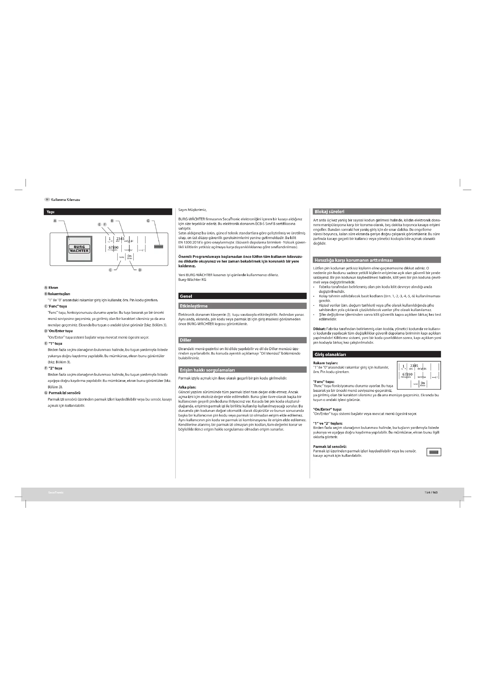 Kullanma Kılavuzu Ekran Rakam tuşları "1" ile "0" arasındaki rakamlar giriş için kullanılır, örn. Pin kodu girerken. "Func" tuşu "Func" tuşu, fonksiyonunuzu duruma uyarlar. Bu tuşa basarak ya bir önceki menü seviyesine geçersiniz, ya girilmiş olan bir karakteri silersiniz ya da ana menüye geçersiniz. Ekranda bu tuşun o andaki işlevi görünür (bkz. Bölüm 3). "On/Enter tuşu "On/Enter" tuşu sistemi başlatır veya mevcut menü ögesini seçer. "1" tuşu Birden fazla seçim olanağının bulunması halinde, bu tuşun yardımıyla listede yukarıya doğru kaydırma yapılabilir. Bu mümkünse, ekran bunu görüntüler (bkz. Bölüm 3). "2" tuşu Birden fazla seçim olanağının bulunması halinde, bu tuşun yardımıyla listede aşağıya doğru kaydırma yapılabilir. Bu mümkünse, ekran bunu görüntüler (bkz. Bölüm 3). Parmak izi sensörü Parmak izi sensörü üzerinden parmak izleri kaydedilebilir veya bu sensör, kasayı açmak için kullanılabilir. Yapı Sayın Müşterimiz, BURG-WÄCHTER firmasının SecuTronic elektroniğini içeren bir kasayı aldığınız için size teşekkür ederiz. Bu elektronik donanım ECB•S Sınıf B sertifikasına sahiptir. Satın aldığınız bu ürün, güncel teknik standartlara göre geliştirilmiş ve üretilmiş olup, en üst düzey güvenlik gereksinimlerini yenine getirmektedir. Bu kilit EN 1300:2018'e göre onaylanmıştır. (Güvenli depolama birimleri - Yüksek güven- likli kilitlerin yetkisiz açılmaya karşı dayanıklılıklarına göre sınıandırılması). Önemli: Programlamaya başlamadan önce lütfen tüm kullanım kılavuzu- nu dikkatle okuyunuz ve her zaman bakabilmek için korunaklı bir yere kaldırınız. Yeni BURG-WÄCHTER kasanızı iyi günlerde kullanmanızı dileriz. Burg-Wächter KG Etkinleştirme Diller Elektronik donanım klavyenin
