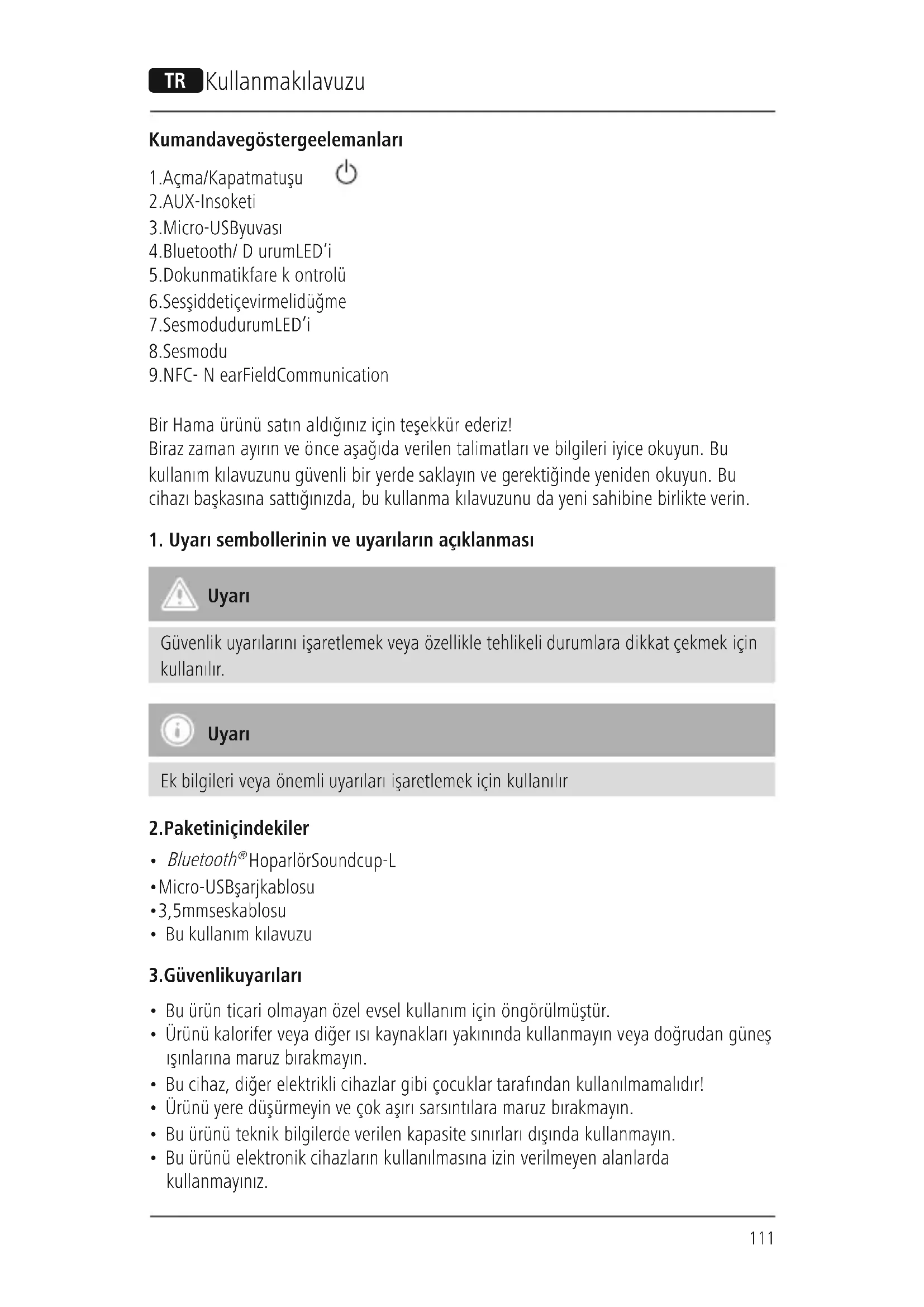 Bir Hama ürünü satınaldığınıziçin teşekkür ederiz! Biraz zaman ayırınveönce aşağıda verilen talimatları ve bilgileri iyice okuyun. Bu kullanımkılavuzunu güvenli bir yerde saklayınvegerektiğinde yeniden okuyun. Bu cihazı başkasına sattığınızda, bu kullanma kılavuzunu da yeni sahibine birlikte verin.