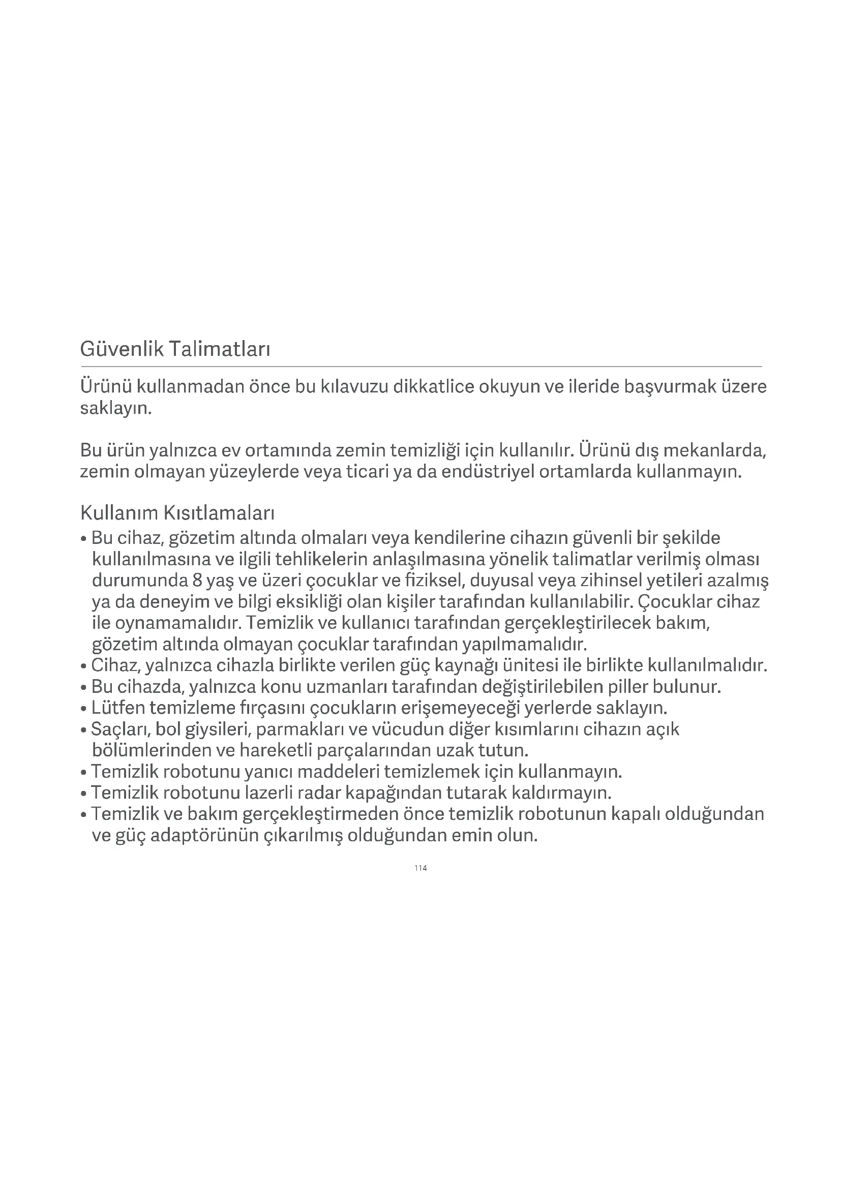 - Temizlik ve bakım gerçekleştirmeden önce temizlik robotunun kapalı olduğundan ve güç adaptörünün çıkarılmış olduğundan emin olun. Ürünü kullanmadan önce bu kılavuzu dikkatlice okuyun ve ileride başvurmak üzere saklayın. Bu ürün yalnızca ev ortamında zemin temizliği için kullanılır. Ürünü dış mekanlarda, zemin olmayan yüzeylerde veya ticari ya da endüstriyel ortamlarda kullanmayın.115