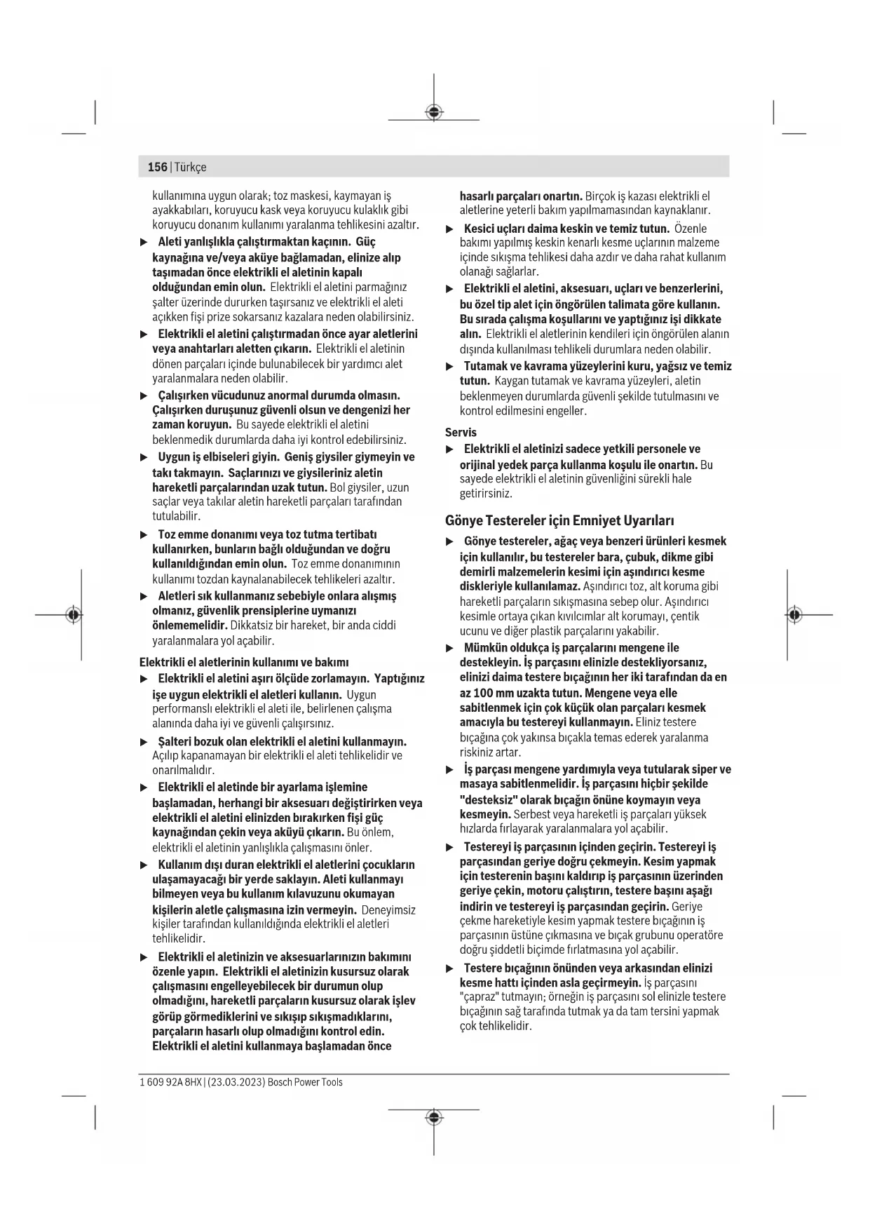 Μην ρίχνετε τα ηλεκτρικά εργαλεία στα απορρίμ- ματα του σπιτιού σας! Μόνο για χώρες τηςΕΕ: Σύμφωνα με την Ευρωπαϊκή Οδηγία 2012/19/ΕΕ σχετικά με τις παλιές ηλεκτρικές και ηλεκτρονικές συσκευές και τη μετα- φορά της οδηγίας αυτής σε εθνικό δίκαιο τα άχρηστα ηλεκτρι- κά εργαλεία πρέπει να συλλέγονται ξεχωριστά για να επανα- χρησιμοποιηθούν με τρόπο φιλικό προς το περιβάλλον. Σε περίπτωση μη ενδεδειγμένης απόσυρσης οι ηλεκτρικές και ηλεκτρονικές συσκευές λόγω ενδεχομένης παρουσίας επικίν- δυνων ουσιών μπορούν να έχουν επιβλαβείς επιπτώσεις στο περιβάλλον και στην ανθρώπινη υγεία. Türkçe Güvenlik talimatı Elektrikli El Aletleri İçin Genel Güvenlik Uyarıları UYARI Bu elektrikli el aletiyle birlikte gelen tüm güvenlik uyarılarını, talimatları, resim ve açıklamaları okuyun. Aşağıda bulunan talimatlara uyulmaması halinde elektrik çarpmalarına, yangınlara ve/veya ağır yaralanmalara neden olabilir. Bütün uyarıları ve talimat hükümlerini ileride kullanmak üzere saklayın. Uyarı ve talimat hükümlerinde kullanılan "elektrikli el aleti" terimi, akım şebekesine bağlı (elektrikli) aletlerle akü ile çalışan aletleri (akülü) kapsamaktadır. Çalışma yeri güvenliği u Çalıştığınız yeri temiz tutun ve iyi aydınlatın. Dağınık veya karanlık alanlar kazalara davetiye çıkarır. u Yakınında patlayıcı maddeler, yanıcı sıvı, gaz veya tozların bulunduğu yerlerde elektrikli el aleti ile çalışmayın. Elektrikli el aletleri, toz veya buharların tutuşmasına neden olabilecek kıvılcımlar çıkarırlar. u Elektrikli el aleti ile çalışırken çocukları ve etraftaki kişileri uzakta tutun. Dikkatiniz dağılacak olursa aletin kontrolünü kaybedebilirsiniz. Elektrik güvenliği u Elektrikli el aletinin fişi prize uymalıdır. Fişi hiçbir zaman değiştirmeyin. Korumalı (topraklanmış) elektrikli el aletleri ile birlikte adaptör fiş kullanmayın. Değiştirilmemiş fiş ve uygun priz elektrik çarpma tehlikesini azaltır. u Borular, kalorifer petekleri, ısıtıcılar ve buzdolapları gibi topraklanmış yüzeylerle vücudunuzun temas etmesinden kaçının. Vücudunuz topraklandığı anda büyük bir elektrik çarpma tehlikesi ortaya çıkar. u Elektrikli el aletlerini yağmur altında veya nemli ortamlarda bırakmayın. Suyun elektrikli el aleti içine sızması elektrik çarpma tehlikesini artırır. u Kabloya zarar vermeyin. Elektrikli el aletini kablosundan tutarak taşımayın, kabloyu kullanarak çekmeyin veya kablodan çekerek fişi çıkarmayın. Kabloyu ateş, yanıcı ve/veya keskin ve hareket eden maddelerden uzak tutun. Hasarlı veya dolaşmış kablo elektrik çarpma tehlikesini artırır. u Bir elektrikli el aleti ile açık havada çalışırken mutlaka açık havada kullanılmaya uygun uzatma kablosu kullanın. Açık havada kullanılmaya uygun uzatma kablosunun kullanılması elektrik çarpma tehlikesini azaltır. u Elektrikli el aletinin nemli ortamlarda çalıştırılması şartsa mutlaka kaçak akım koruma rölesi kullanın. Kaçak akım koruma rölesi şalterinin kullanımı elektrik çarpma tehlikesini azaltır. Kişilerin Güvenliği u Dikkatli olun, ne yaptığınıza dikkat edin, elektrikli el aleti ile işinizi makul bir tempo ve yöntemle yürütün. Yorgunsanız, kullandığınız hapların, ilaçların veya alkolün etkisinde iseniz elektrikli el aletini kullanmayın. Elektrikli el aletini kullanırken bir anki dikkatsizlik önemli yaralanmalara neden olabilir. u Daima kişisel koruyucu donanım kullanın. Daima koruyucu gözlük kullanın. Elektrikli el aletinin türü ve Bosch Power Tools 1 609 92A 8HX | (23.03.2023)156 | Türkçe kullanımına uygun olarak; toz maskesi, kaymayan iş ayakkabıları, koruyucu kask veya koruyucu kulaklık gibi koruyucu donanım kullanımı yaralanma tehlikesini azaltır. u Aleti yanlışlıkla çalıştırmaktan kaçının. Güç kaynağına ve/veya aküye bağlamadan, elinize alıp taşımadan önce elektrikli el aletinin kapalı olduğundan emin olun. Elektrikli el aletini parmağınız şalter üzerinde dururken taşırsanız ve elektrikli el aleti açıkken fişi prize sokarsanız kazalara neden olabilirsiniz. u Elektrikli el aletini çalıştırmadan önce ayar aletlerini veya anahtarları aletten çıkarın. Elektrikli el aletinin dönen parçaları içinde bulunabilecek bir yardımcı alet yaralanmalara neden olabilir. u Çalışırken vücudunuz anormal durumda olmasın. Çalışırken duruşunuz güvenli olsun ve dengenizi her zaman koruyun. Bu sayede elektrikli el aletini beklenmedik durumlarda daha iyi kontrol edebilirsiniz. u Uygun iş elbiseleri giyin. Geniş giysiler giymeyin ve takı takmayın. Saçlarınızı ve giysileriniz aletin hareketli parçalarından uzak tutun. Bol giysiler, uzun saçlar veya takılar aletin hareketli parçaları tarafından tutulabilir. u Toz emme donanımı veya toz tutma tertibatı kullanırken, bunların bağlı olduğundan ve doğru kullanıldığından emin olun. Toz emme donanımının kullanımı tozdan kaynalanabilecek tehlikeleri azaltır. u Aletleri sık kullanmanız sebebiyle onlara alışmış olmanız, güvenlik prensiplerine uymanızı önlememelidir. Dikkatsiz bir hareket, bir anda ciddi yaralanmalara yol açabilir. Elektrikli el aletlerinin kullanımı ve bakımı u Elektrikli el aletini aşırı ölçüde zorlamayın. Yaptığınız işe uygun elektrikli el aletleri kullanın. Uygun performanslı elektrikli el aleti ile, belirlenen ça
