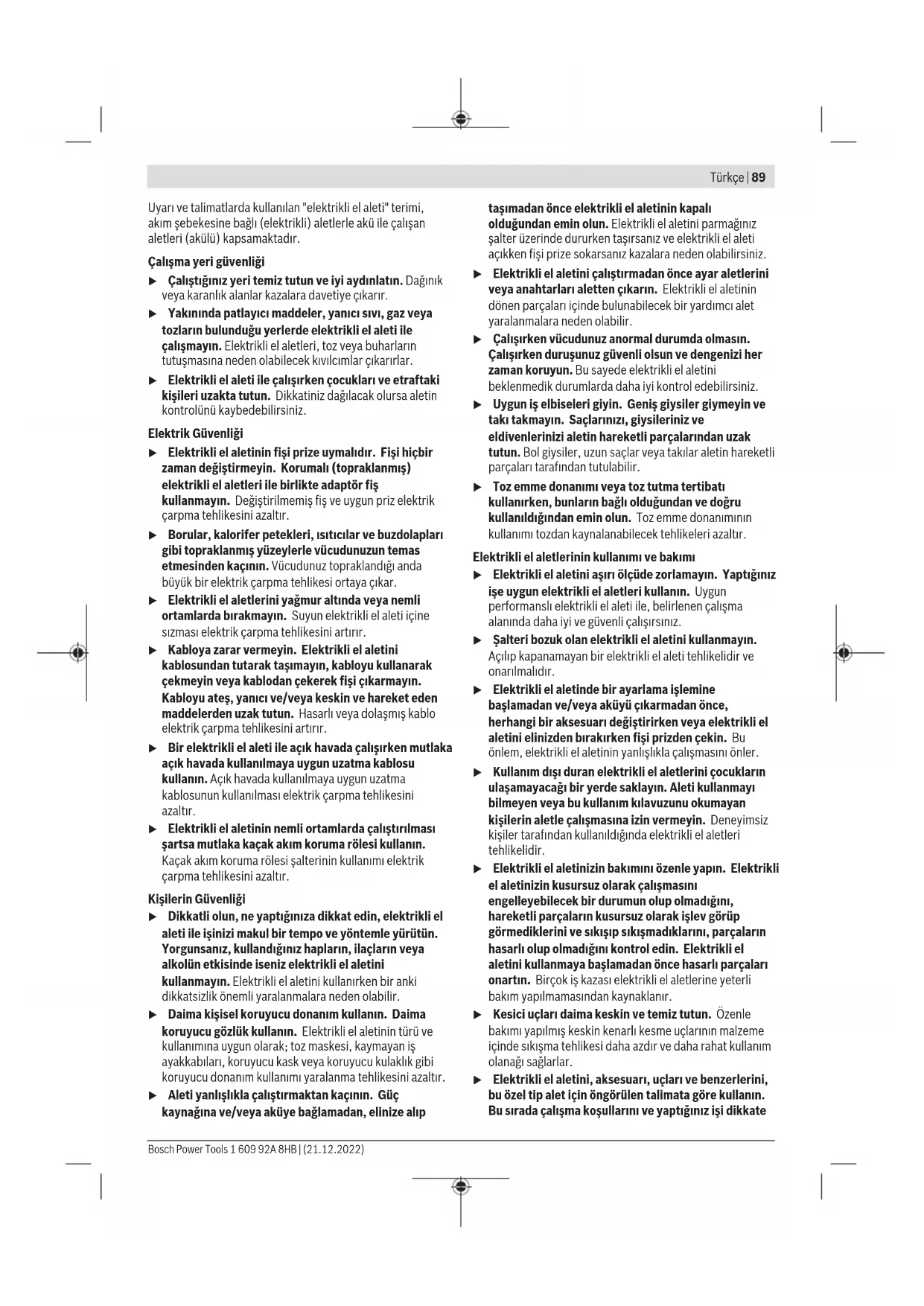 Τα ηλεκτρικά εργαλεία, οι μπαταρίες, τα εξαρτή- ματα και οι συσκευασίες πρέπει να ανακυκλώνο- νται με τρόπο φιλικό προς το περιβάλλον. Μην ρίχνετε τα ηλεκτρικά εργαλεία και τις μπατα- ρίες στα απορρίμματα του σπιτιού σας! Μόνο για χώρες τηςΕΕ: Σύμφωνα με την Ευρωπαϊκή οδηγία 2012/19/ΕΕ σχετικά με τις παλιές ηλεκτρικές και ηλεκτρονικές συσκευές και τη μετα- φορά της οδηγίας αυτής σε εθνικό δίκαιο τα άχρηστα ηλεκτρι- κά εργαλεία και σύμφωνα με την Ευρωπαϊκή οδηγία 2006/66/ΕΚ οι χαλασμένες ή χρησιμοποιημένες μπαταρίες πρέπει να συλλέγονται ξεχωριστά, για να ανακυκλωθούν με τρόπο φιλικό προς το περιβάλλον. Σε περίπτωση μη ενδεδειγμένης απόσυρσης οι ηλεκτρικές και ηλεκτρονικές συσκευές λόγω ενδεχομένης παρουσίας επικίν- δυνων ουσιών μπορούν να έχουν επιβλαβείς επιπτώσεις στο περιβάλλον και στην ανθρώπινη υγεία. Μπαταρίες/Επαναφορτιζόμενες μπαταρίες: Li-Ion: Προσέξτε παρακαλώ τις υποδείξεις στην ενότητα Μεταφορά (βλέπε «Μεταφορά», Σελίδα88). Türkçe Güvenlik talimatı Elektrikli El Aletleri İçin Genel Güvenlik Uyarıları UYARI Bütün güvenlik uyarılarını ve talimatları okuyun. Açıklanan uyarılara ve talimatlara uyulmadığı takdirde elektrik çarpmalarına, yangınlara ve/veya ağır yaralanmalara neden olunabilir. Bütün uyarıları ve talimatları ileride kullanmak üzere saklayın. 1 609 92A 8HB | (21.12.2022) Bosch Power ToolsTürkçe | 89 Uyarı ve talimatlarda kullanılan "elektrikli el aleti" terimi, akım şebekesine bağlı (elektrikli) aletlerle akü ile çalışan aletleri (akülü) kapsamaktadır. Çalışma yeri güvenliği u Çalıştığınız yeri temiz tutun ve iyi aydınlatın. Dağınık veya karanlık alanlar kazalara davetiye çıkarır. u Yakınında patlayıcı maddeler, yanıcı sıvı, gaz veya tozların bulunduğu yerlerde elektrikli el aleti ile çalışmayın. Elektrikli el aletleri, toz veya buharların tutuşmasına neden olabilecek kıvılcımlar çıkarırlar. u Elektrikli el aleti ile çalışırken çocukları ve etraftaki kişileri uzakta tutun. Dikkatiniz dağılacak olursa aletin kontrolünü kaybedebilirsiniz. Elektrik Güvenliği u Elektrikli el aletinin fişi prize uymalıdır. Fişi hiçbir zaman değiştirmeyin. Korumalı (topraklanmış) elektrikli el aletleri ile birlikte adaptör fiş kullanmayın. Değiştirilmemiş fiş ve uygun priz elektrik çarpma tehlikesini azaltır. u Borular, kalorifer petekleri, ısıtıcılar ve buzdolapları gibi topraklanmış yüzeylerle vücudunuzun temas etmesinden kaçının. Vücudunuz topraklandığı anda büyük bir elektrik çarpma tehlikesi ortaya çıkar. u Elektrikli el aletlerini yağmur altında veya nemli ortamlarda bırakmayın. Suyun elektrikli el aleti içine sızması elektrik çarpma tehlikesini artırır. u Kabloya zarar vermeyin. Elektrikli el aletini kablosundan tutarak taşımayın, kabloyu kullanarak çekmeyin veya kablodan çekerek fişi çıkarmayın. Kabloyu ateş, yanıcı ve/veya keskin ve hareket eden maddelerden uzak tutun. Hasarlı veya dolaşmış kablo elektrik çarpma tehlikesini artırır. u Bir elektrikli el aleti ile açık havada çalışırken mutlaka açık havada kullanılmaya uygun uzatma kablosu kullanın. Açık havada kullanılmaya uygun uzatma kablosunun kullanılması elektrik çarpma tehlikesini azaltır. u Elektrikli el aletinin nemli ortamlarda çalıştırılması şartsa mutlaka kaçak akım koruma rölesi kullanın. Kaçak akım koruma rölesi şalterinin kullanımı elektrik çarpma tehlikesini azaltır. Kişilerin Güvenliği u Dikkatli olun, ne yaptığınıza dikkat edin, elektrikli el aleti ile işinizi makul bir tempo ve yöntemle yürütün. Yorgunsanız, kullandığınız hapların, ilaçların veya alkolün etkisinde iseniz elektrikli el aletini kullanmayın. Elektrikli el aletini kullanırken bir anki dikkatsizlik önemli yaralanmalara neden olabilir. u Daima kişisel koruyucu donanım kullanın. Daima koruyucu gözlük kullanın. Elektrikli el aletinin türü ve kullanımına uygun olarak; toz maskesi, kaymayan iş ayakkabıları, koruyucu kask veya koruyucu kulaklık gibi koruyucu donanım kullanımı yaralanma tehlikesini azaltır. u Aleti yanlışlıkla çalıştırmaktan kaçının. Güç kaynağına ve/veya aküye bağlamadan, elinize alıp taşımadan önce elektrikli el aletinin kapalı olduğundan emin olun. Elektrikli el aletini parmağınız şalter üzerinde dururken taşırsanız ve elektrikli el aleti açıkken fişi prize sokarsanız kazalara neden olabilirsiniz. u Elektrikli el aletini çalıştırmadan önce ayar aletlerini veya anahtarları aletten çıkarın. Elektrikli el aletinin dönen parçaları içinde bulunabilecek bir yardımcı alet yaralanmalara neden olabilir. u Çalışırken vücudunuz anormal durumda olmasın. Çalışırken duruşunuz güvenli olsun ve dengenizi her zaman koruyun. Bu sayede elektrikli el aletini beklenmedik durumlarda daha iyi kontrol edebilirsiniz. u Uygun iş elbiseleri giyin. Geniş giysiler giymeyin ve takı takmayın. Saçlarınızı, giysileriniz ve eldivenlerinizi aletin hareketli parçalarından uzak tutun. Bol giysiler, uzun saçlar veya takılar aletin hareketli parçaları tarafından tutulabilir. u Toz emme donanımı ve