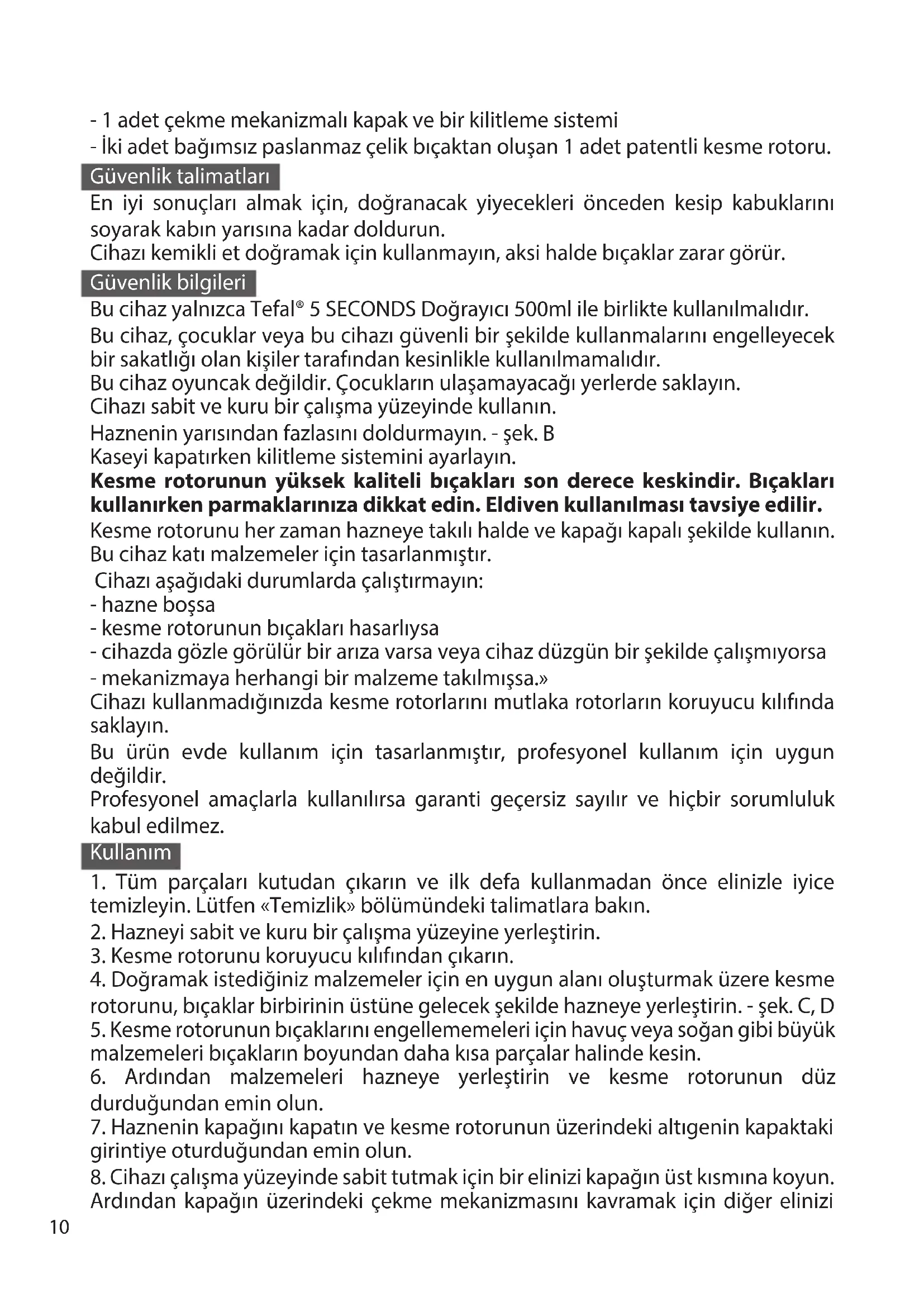 Tefal® 5 seconds doğrayıcı’yı satın aldığınız için tebrikler. Bu manuel doğrayıcı aşağıdaki parçaları içerir: şek. A Bu manuel doğrayıcı aşağıdaki parçaları içerir: şek. A - 1 adet 500 ml kapasiteli kayma önleyici hazne10 - 1 adet çekme mekanizmalı kapak ve bir kilitleme sistemi - İki adet bağımsız paslanmaz çelik bıçaktan oluşan 1 adet patentli kesme rotoru. Güvenlik talimatları En iyi sonuçları almak için, doğranacak yiyecekleri önceden kesip kabuklarını soyarak kabın yarısına kadar doldurun. Cihazı kemikli et doğramak için kullanmayın, aksi halde bıçaklar zarar görür. Güvenlik bilgileri Bu cihaz yalnızca Tefal® 5 SECONDS Doğrayıcı 500ml ile birlikte kullanılmalıdır. Bu cihaz, çocuklar veya bu cihazı güvenli bir şekilde kullanmalarını engelleyecek bir sakatlığı olan kişiler tarafından kesinlikle kullanılmamalıdır. Bu cihaz oyuncak değildir. Çocukların ulaşamayacağı yerlerde saklayın. Cihazı sabit ve kuru bir çalışma yüzeyinde kullanın. Haznenin yarısından fazlasını doldurmayın. - şek. B Kaseyi kapatırken kilitleme sistemini ayarlayın. Kesme rotorunun yüksek kaliteli bıçakları son derece keskindir. Bıçakları kullanırken parmaklarınıza dikkat edin. Eldiven kullanılması tavsiye edilir. Kesme rotorunu her zaman hazneye takılı halde ve kapağı kapalı şekilde kullanın. Bu cihaz katı malzemeler için tasarlanmıştır. Cihazı aşağıdaki durumlarda çalıştırmayın: - hazne boşsa - kesme rotorunun bıçakları hasarlıysa - cihazda gözle görülür bir arıza varsa veya cihaz düzgün bir şekilde çalışmıyorsa - mekanizmaya herhangi bir malzeme takılmışsa.» Cihazı kullanmadığınızda kesme rotorlarını mutlaka rotorların koruyucu kılıfında saklayın. Bu ürün evde kullanım için tasarlanmıştır, profesyonel kullanım için uygun değildir. Profesyonel amaçlarla kullanılırsa garanti geçersiz sayılır ve hiçbir sorumluluk kabul edilmez. Kullanım