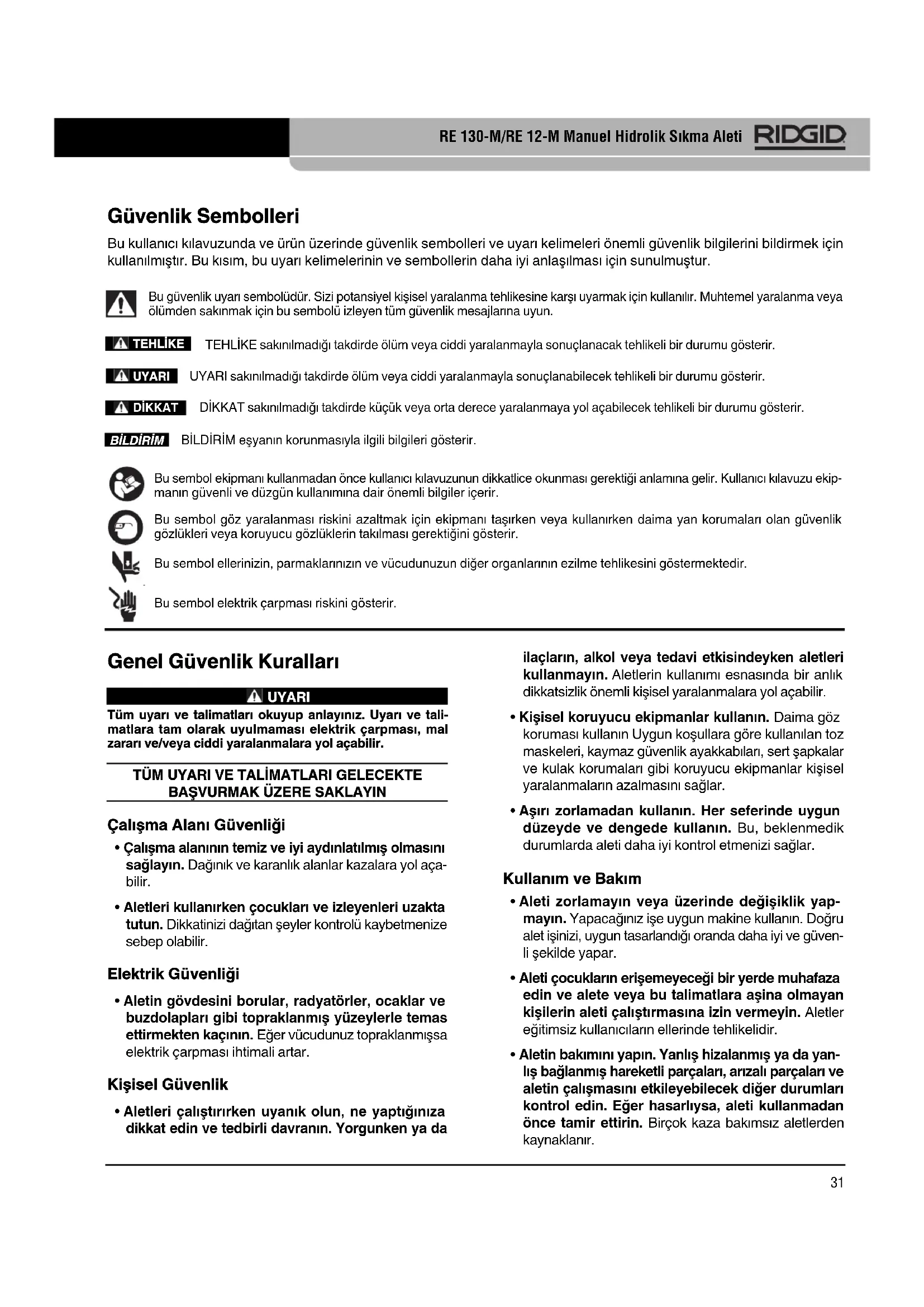 - Aletinizi sadece orijinal yedek parçaları kullanan bir RIDGID Bağımsız Servis Merkezi'nde servis ettirin. Bu, aletin güvenliğinin devamlılığını sağlayacaktır. Özel Güvenlik Bilgileri UYARI Bu bölüm makineye özel önemli güvenlik bilgileri içerir. Elektrik çarpması veya ciddi yaralanma riskini azaltmak için sıkma aletinizi kullanmadan önce bu önlemleri dikkatlice okuyun. BU TALİMATLARI SAKLAYIN! Bu kılavuzun operatör tarafından kullanılabilmesi amacıyla makineyle birlikte muhafaza edilmesi için aletin taşındığı çan- taya bir bölme ilave edilmiştir. Manuel Hidrolik Sıkma Aleti Emniyeti