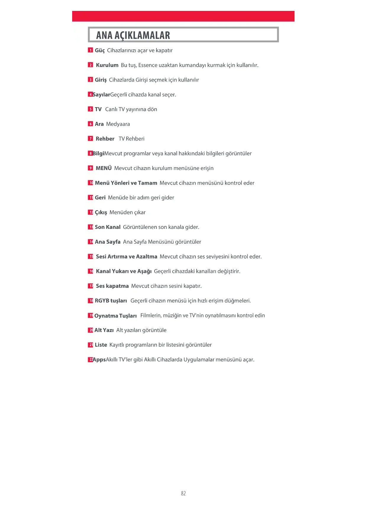 Kurulum Bu tuş, Essence uzaktan kumandayı kurmak için kullanılır.