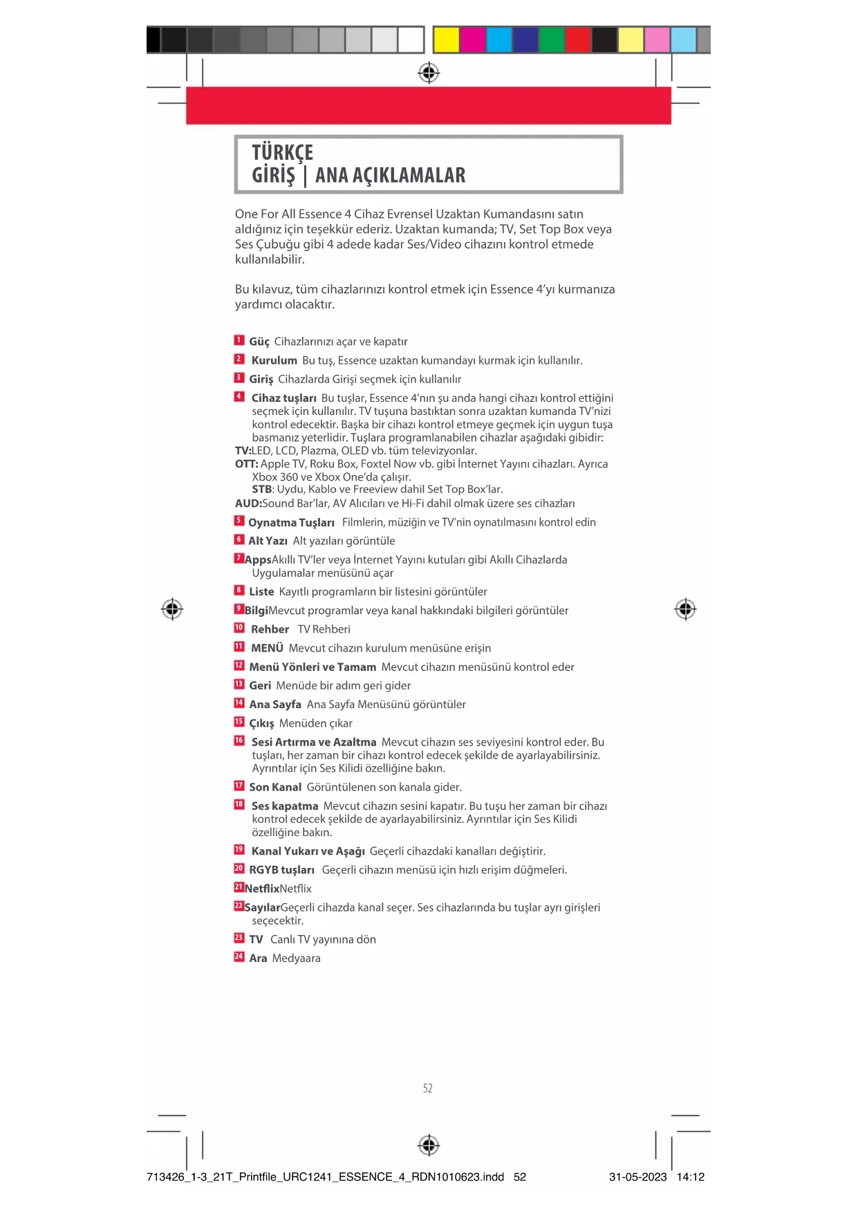 - Beklenmeyen şekilde çalışan bir veya daha fazla tuş mevcutsa, adım 2’den tekrar başlayın – uzaktan kumanda hafızada bulunan bir sonraki kod ile başlayacaktır. KURULUM SIMPLESET (BASİT AYAR) 713426_1-3_21T_Printfile_URC1241_ESSENCE_4_RDN1010623.indd 53713426_1-3_21T_Printfile_URC1241_ESSENCE_4_RDN1010623.indd 53 31-05-2023 14:1231-05-2023 14:1254 KURULUM KODLA KURULUM Basit Ayar özelliğinde cihazınızın markası listelenmiyorsa kodları tek tek deneyerek kurulum yapabilirsiniz. Bunu yapmak için öncelikle markanızı Kod Listesinde bulun. Kodlar marka ve cihaza göre ve popülerlik sırasına göre listelenmiştir.