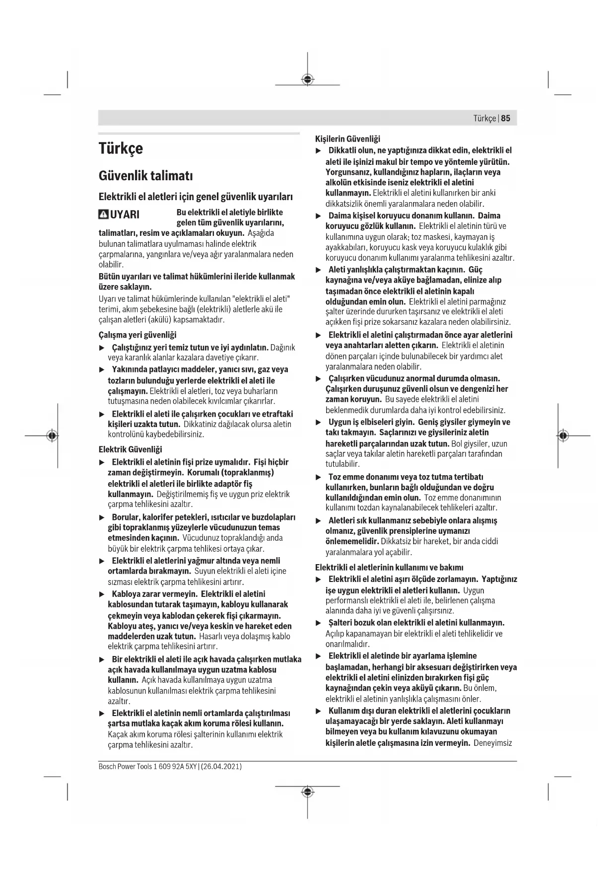 Τα ηλεκτρικά εργαλεία, οι μπαταρίες, τα εξαρτήματα και οι συσκευασίες πρέπει να ανακυκλώνονται με τρόπο φιλικό προς το περιβάλλον. Μην ρίχνετε τα ηλεκτρικά εργαλεία και τις μπαταρίες στα απορρίμματα του σπιτιού σας! Μόνο για χώρες τηςΕΕ: Σύμφωνα με την Ευρωπαϊκή οδηγία 2012/19/ΕΕ τα άχρηστα ηλεκτρικά εργαλεία και σύμφωνα με την Ευρωπαϊκή οδηγία 2006/66/ΕΚ οι χαλασμένες ή χρησιμοποιημένες μπαταρίες πρέπει να συλλέγονται ξεχωριστά για να ανακυκλωθούν με τρόπο φιλικό προς το περιβάλλον. Μπαταρίες/Επαναφορτιζόμενες μπαταρίες: Li-Ion: Προσέξτε παρακαλώ τις υποδείξεις στην ενότητα Μεταφορά (βλέπε «Μεταφορά», Σελίδα84). Συντήρηση και καθαρισμός u Αφαιρείτε την μπαταρία από το ηλεκτρικό εργαλείο πριν από κάθε εργασία στο ηλεκτρικό εργαλείο (π.χ. συντήρηση, αλλαγή εξαρτημάτων κλπ.) καθώς και κατά την μεταφορά του και τη φύλαξή του. Σε περίπτωση αθέλητης ενεργοποίησης του διακόπτη ON/OFF υπάρχει κίνδυνος τραυματισμού. u Να διατηρείτε το ηλεκτρικό εργαλείο και τις σχισμές αερισμού πάντοτε σε καθαρή κατάσταση για να μπορείτε να εργάζεσθε καλά και με ασφάλεια. Αντικατάσταση ψηκτρών (βλέπεεικόναD) Ελέγχετε το μήκος ψηκτρών περίπου κάθε 2–3 μήνες και αλλάζετε και τις δύο ψήκτρες, εάν είναι απαραίτητο. Μην αλλάξετε ποτέ μόνο μια ψήκτρα! Υπόδειξη: Χρησιμοποιείτε ψήκτρες προμηθευμένες μόνο από τη Bosch, που προορίζονται για το προϊόν σας. – Λύστε τα καπάκια (14) με ένα κατάλληλο κατσαβίδι. – Αλλάξτε τις υπό τάση ελατηρίου ευρισκόμενες ψήκτρες (13) και βιδώστε πάλι τα καπάκια. 1 609 92A 5XY | (26.04.2021) Bosch Power ToolsTürkçe | 85 Türkçe Güvenlik talimatı Elektrikli el aletleri için genel güvenlik uyarıları UYARI Bu elektrikli el aletiyle birlikte gelen tüm güvenlik uyarılarını, talimatları, resim ve açıklamaları okuyun. Aşağıda bulunan talimatlara uyulmaması halinde elektrik çarpmalarına, yangınlara ve/veya ağır yaralanmalara neden olabilir. Bütün uyarıları ve talimat hükümlerini ileride kullanmak üzere saklayın. Uyarı ve talimat hükümlerinde kullanılan "elektrikli el aleti" terimi, akım şebekesine bağlı (elektrikli) aletlerle akü ile çalışan aletleri (akülü) kapsamaktadır. Çalışma yeri güvenliği u Çalıştığınız yeri temiz tutun ve iyi aydınlatın. Dağınık veya karanlık alanlar kazalara davetiye çıkarır. u Yakınında patlayıcı maddeler, yanıcı sıvı, gaz veya tozların bulunduğu yerlerde elektrikli el aleti ile çalışmayın. Elektrikli el aletleri, toz veya buharların tutuşmasına neden olabilecek kıvılcımlar çıkarırlar. u Elektrikli el aleti ile çalışırken çocukları ve etraftaki kişileri uzakta tutun. Dikkatiniz dağılacak olursa aletin kontrolünü kaybedebilirsiniz. Elektrik Güvenliği u Elektrikli el aletinin fişi prize uymalıdır. Fişi hiçbir zaman değiştirmeyin. Korumalı (topraklanmış) elektrikli el aletleri ile birlikte adaptör fiş kullanmayın. Değiştirilmemiş fiş ve uygun priz elektrik çarpma tehlikesini azaltır. u Borular, kalorifer petekleri, ısıtıcılar ve buzdolapları gibi topraklanmış yüzeylerle vücudunuzun temas etmesinden kaçının. Vücudunuz topraklandığı anda büyük bir elektrik çarpma tehlikesi ortaya çıkar. u Elektrikli el aletlerini yağmur altında veya nemli ortamlarda bırakmayın. Suyun elektrikli el aleti içine sızması elektrik çarpma tehlikesini artırır. u Kabloya zarar vermeyin. Elektrikli el aletini kablosundan tutarak taşımayın, kabloyu kullanarak çekmeyin veya kablodan çekerek fişi çıkarmayın. Kabloyu ateş, yanıcı ve/veya keskin ve hareket eden maddelerden uzak tutun. Hasarlı veya dolaşmış kablo elektrik çarpma tehlikesini artırır. u Bir elektrikli el aleti ile açık havada çalışırken mutlaka açık havada kullanılmaya uygun uzatma kablosu kullanın. Açık havada kullanılmaya uygun uzatma kablosunun kullanılması elektrik çarpma tehlikesini azaltır. u Elektrikli el aletinin nemli ortamlarda çalıştırılması şartsa mutlaka kaçak akım koruma rölesi kullanın. Kaçak akım koruma rölesi şalterinin kullanımı elektrik çarpma tehlikesini azaltır. Kişilerin Güvenliği u Dikkatli olun, ne yaptığınıza dikkat edin, elektrikli el aleti ile işinizi makul bir tempo ve yöntemle yürütün. Yorgunsanız, kullandığınız hapların, ilaçların veya alkolün etkisinde iseniz elektrikli el aletini kullanmayın. Elektrikli el aletini kullanırken bir anki dikkatsizlik önemli yaralanmalara neden olabilir. u Daima kişisel koruyucu donanım kullanın. Daima koruyucu gözlük kullanın. Elektrikli el aletinin türü ve kullanımına uygun olarak; toz maskesi, kaymayan iş ayakkabıları, koruyucu kask veya koruyucu kulaklık gibi koruyucu donanım kullanımı yaralanma tehlikesini azaltır. u Aleti yanlışlıkla çalıştırmaktan kaç