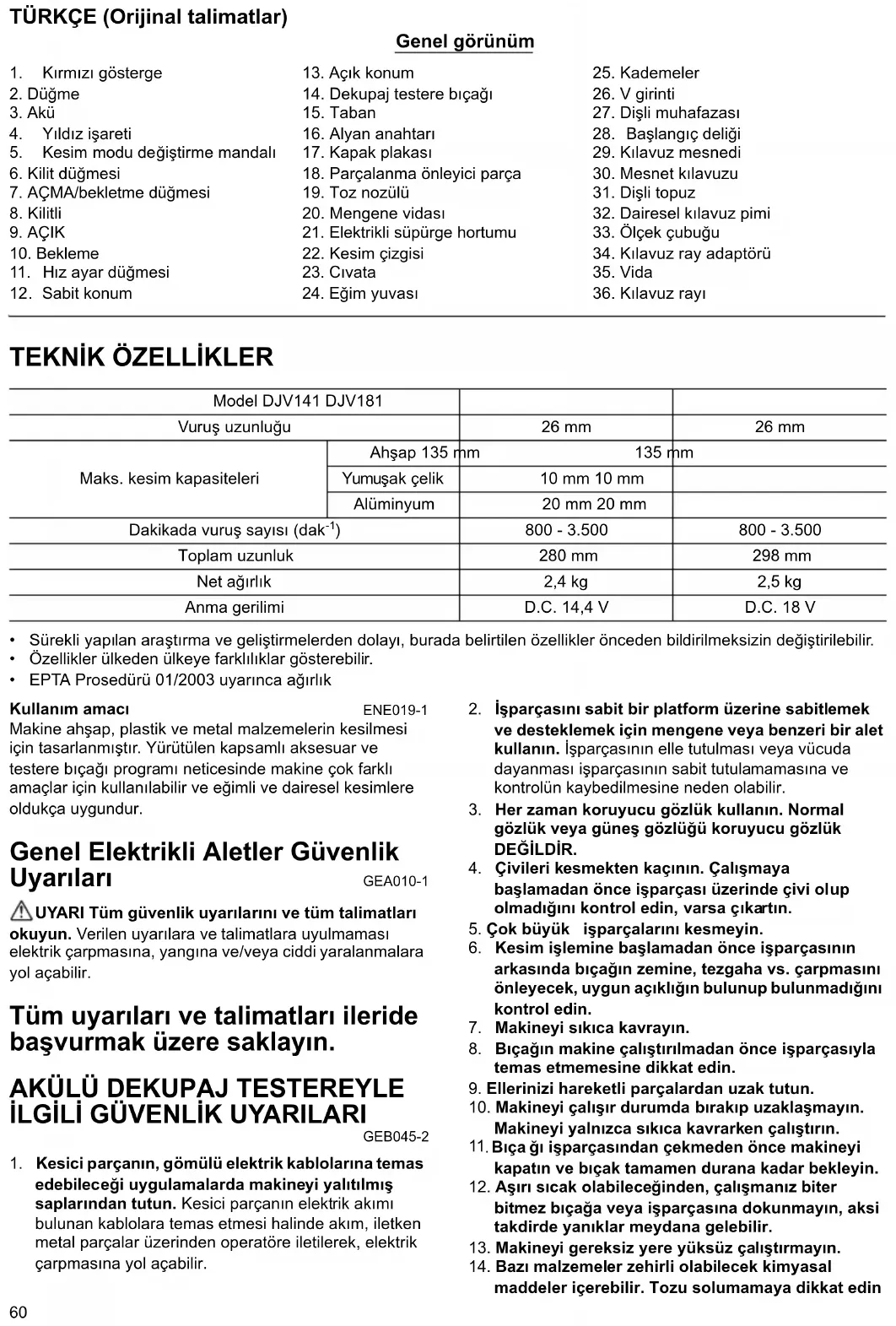 - EPTA Prosedürü 01/2003 uyarınca ağırlık Kullanım amacı ENE019-1 Makine ahşap, plastik ve metal malzemelerin kesilmesi için tasarlanmıştır. Yürütülen kapsamlı aksesuar ve testere bıçağı programı neticesinde makine çok farklı amaçlar için kullanılabilir ve eğimli ve dairesel kesimlere oldukça uygundur. Genel Elektrikli Aletler Güvenlik Uyarıları GEA010-1 UYARI Tüm güvenlik uyarılarını ve tüm talimatları okuyun. Verilen uyarılara ve talimatlara uyulmaması elektrik çarpmasına, yangına ve/veya ciddi yaralanmalara yol açabilir. Tüm uyarıları ve talimatları ileride başvurmak üzere saklayın.