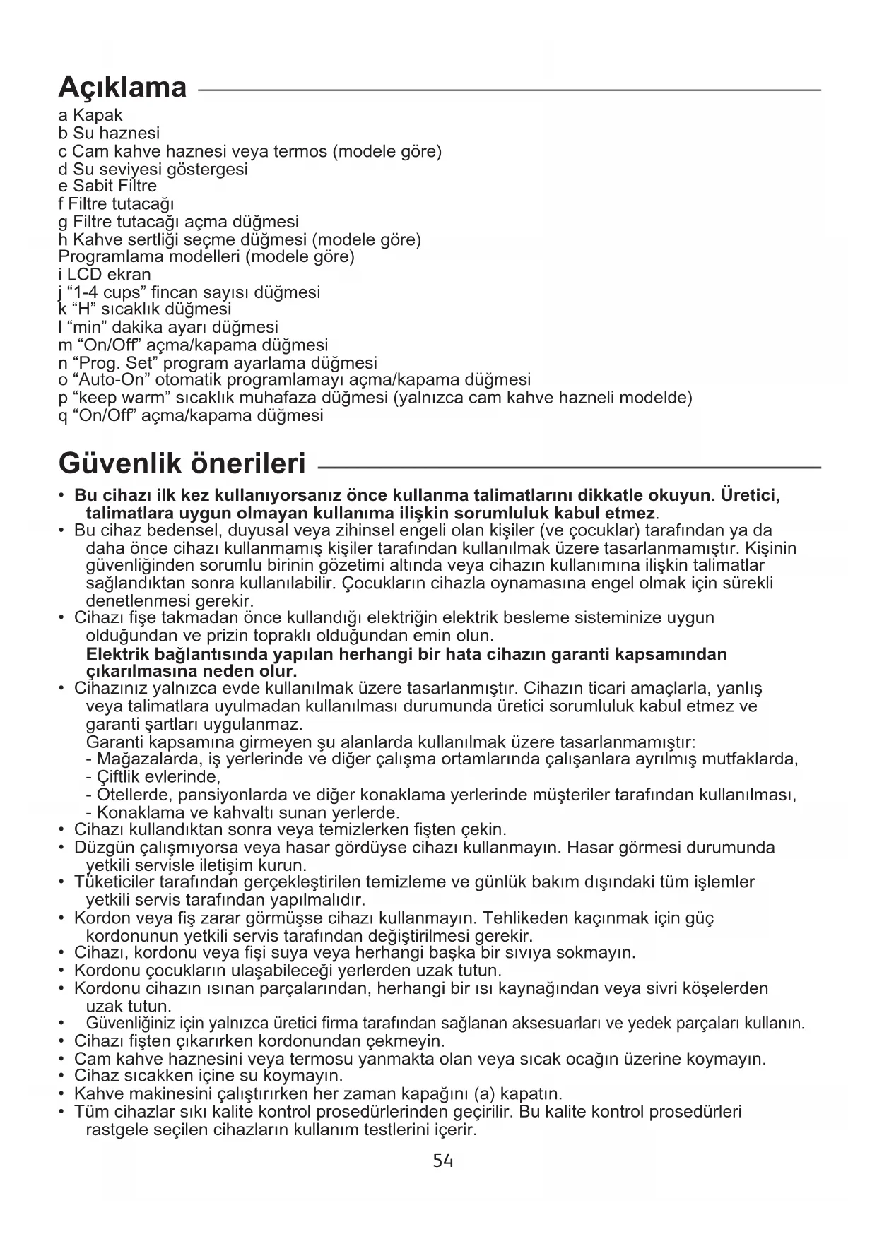 ELAçıklama a Kapak b Su haznesi c Cam kahve haznesi veya termos (modele göre) d Su seviyesi göstergesi e Sabit Filtre f Filtre tutacağı g Filtre tutacağı açma düğmesi h Kahve sertliği seçme düğmesi (modele göre) Programlama modelleri (modele göre) i LCD ekran j “1-4 cups” fincan sayısı düğmesi k “H” sıcaklık düğmesi l “min” dakika ayarı düğmesi m “On/Off” açma/kapama düğmesi n “Prog. Set” program ayarlama düğmesi o “Auto-On” otomatik programlamayı açma/kapama düğmesi p “keep warm” sıcaklık muhafaza düğmesi (yalnızca cam kahve hazneli modelde) q “On/Off” açma/kapama düğmesi Güvenlik önerileri