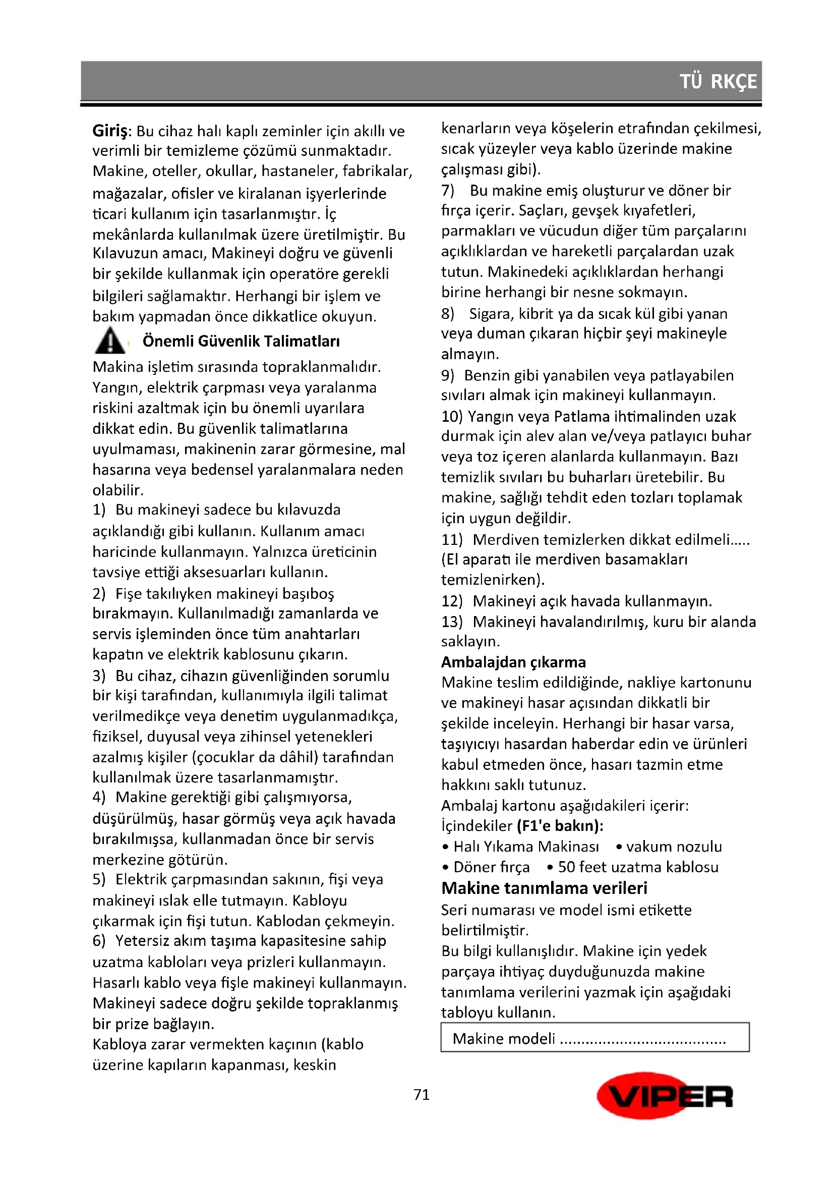- Döner fırça • 50 feet uzatma kablosu Makine tanımlama verileri Seri numarası ve model ismi etikette belirtilmiştir. Bu bilgi kullanışlıdır. Makine için yedek parçaya ihtiyaç duyduğunuzda makine tanımlama verilerini yazmak için aşağıdaki tabloyu kullanın. Makine modeli .......................................TÜ RKÇE