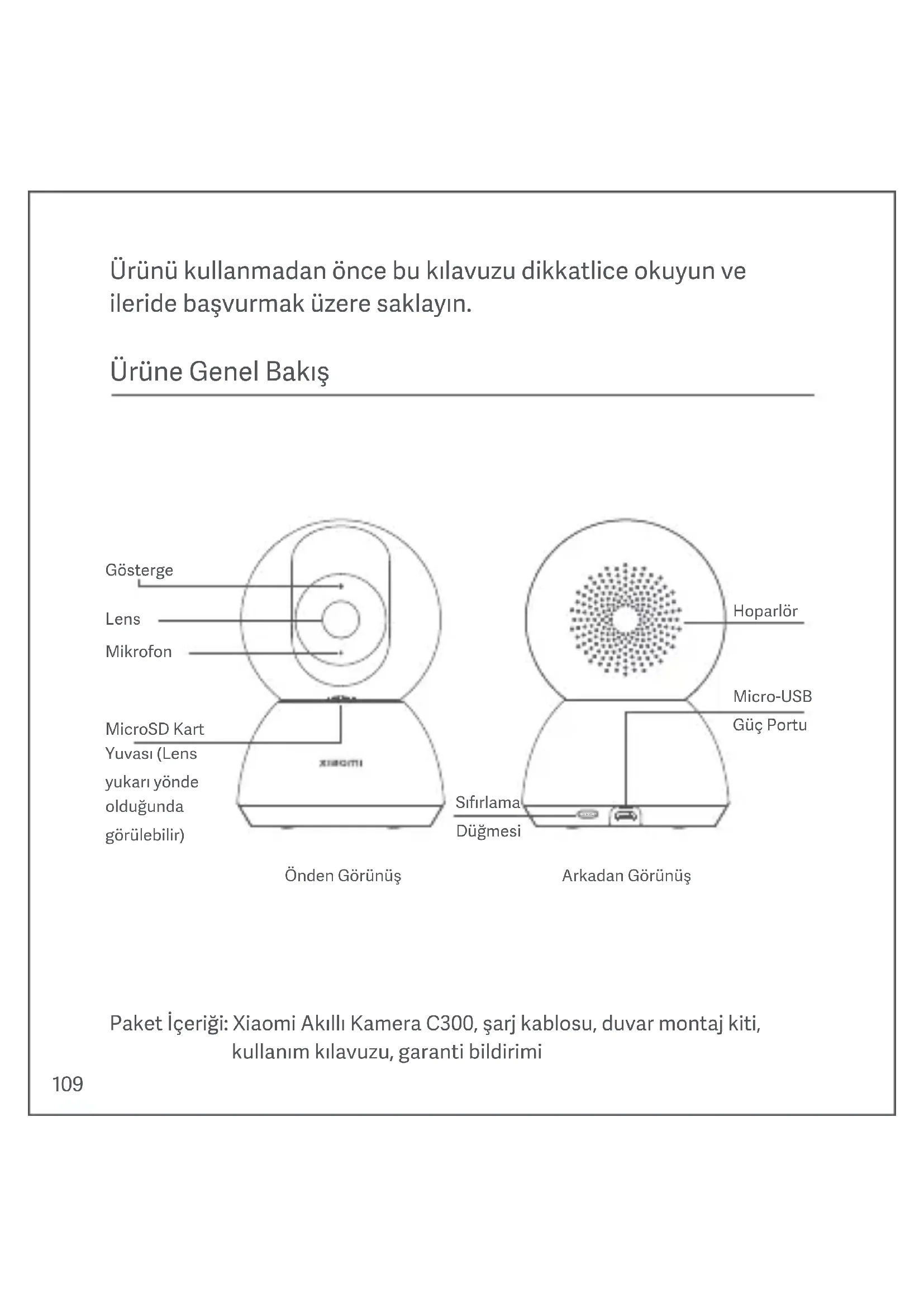moc.im.www ่ีทูดดรปโ มิตเมÜrüne Genel Bakış Hoparlör Gösterge Lens Mikrofon SIFIRLA Ürünü kullanmadan önce bu kılavuzu dikkatlice okuyun ve ileride başvurmak üzere saklayın. MicroSD Kart Yuvası (Lens yukarı yönde olduğunda görülebilir) Micro-USB Güç Portu Sıfırlama Düğmesi Önden Görünüş Arkadan Görünüş Paket İçeriği: Xiaomi Akıllı Kamera C300, şarj kablosu, duvar montaj kiti, kullanım kılavuzu, garanti bildirimi 1092. Delinmiş her bir deliğe plastik bir dübel takın. Kurulum