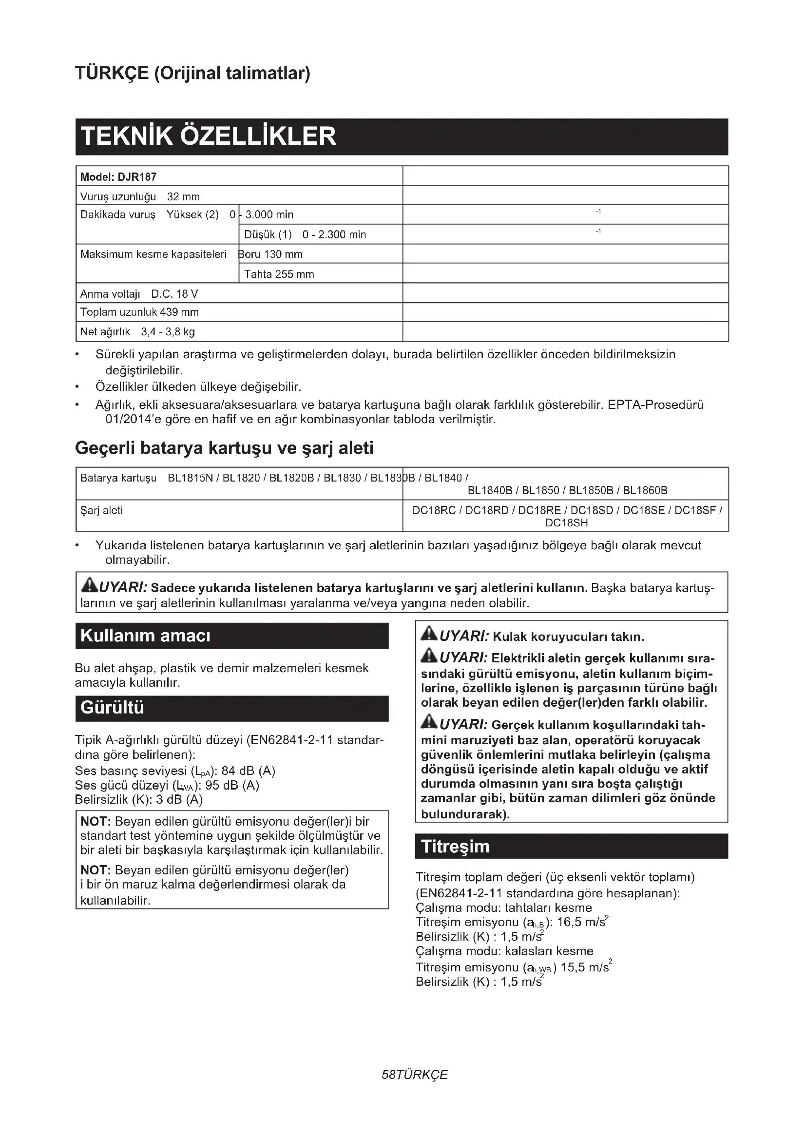 - Yukarıdalistelenenbataryakartuşlarınınveşarjaletlerininbazılarıyaşadığınızbölgeyebağlıolarakmevcut olmayabilir. UYARI: Sadece yukarıda listelenen batarya kartuşlarını ve şarj aletlerini kullanın.Başkabataryakartuş- larınınveşarjaletlerininkullanılmasıyaralanmave/veyayangınanedenolabilir. Kullanım amacı Bualetahşap,plastikvedemirmalzemelerikesmek amacıylakullanılır. Gürültü TipikA-ağırlıklıgürültüdüzeyi(EN62841-2-11standar- dınagörebelirlenen): Sesbasınçseviyesi(L