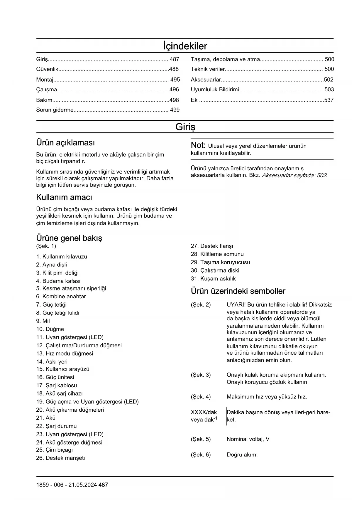 - Ek Giriş Ürün açıklaması Bu ürün, elektrikli motorlu ve aküyle çalışan bir çim biçici/çalı tırpanıdır. Kullanım sırasında güvenliğiniz ve verimliliği artırmak için sürekli olarak çalışmalar yapılmaktadır. Daha fazla bilgi için lütfen servis bayinizle görüşün. Kullanım amacı Ürünü çim bıçağı veya budama kafası ile değişik türdeki yeşillikleri kesmek için kullanın. Ürünü çim budama ve çim temizleme işleri dışında kullanmayın. Not: Ulusal veya yerel düzenlemeler ürünün kullanımını kısıtlayabilir. Ürünü yalnızca üretici tarafından onaylanmış aksesuarlarla kullanın. Bkz. Aksesuarlar sayfada: 502 p. 537
