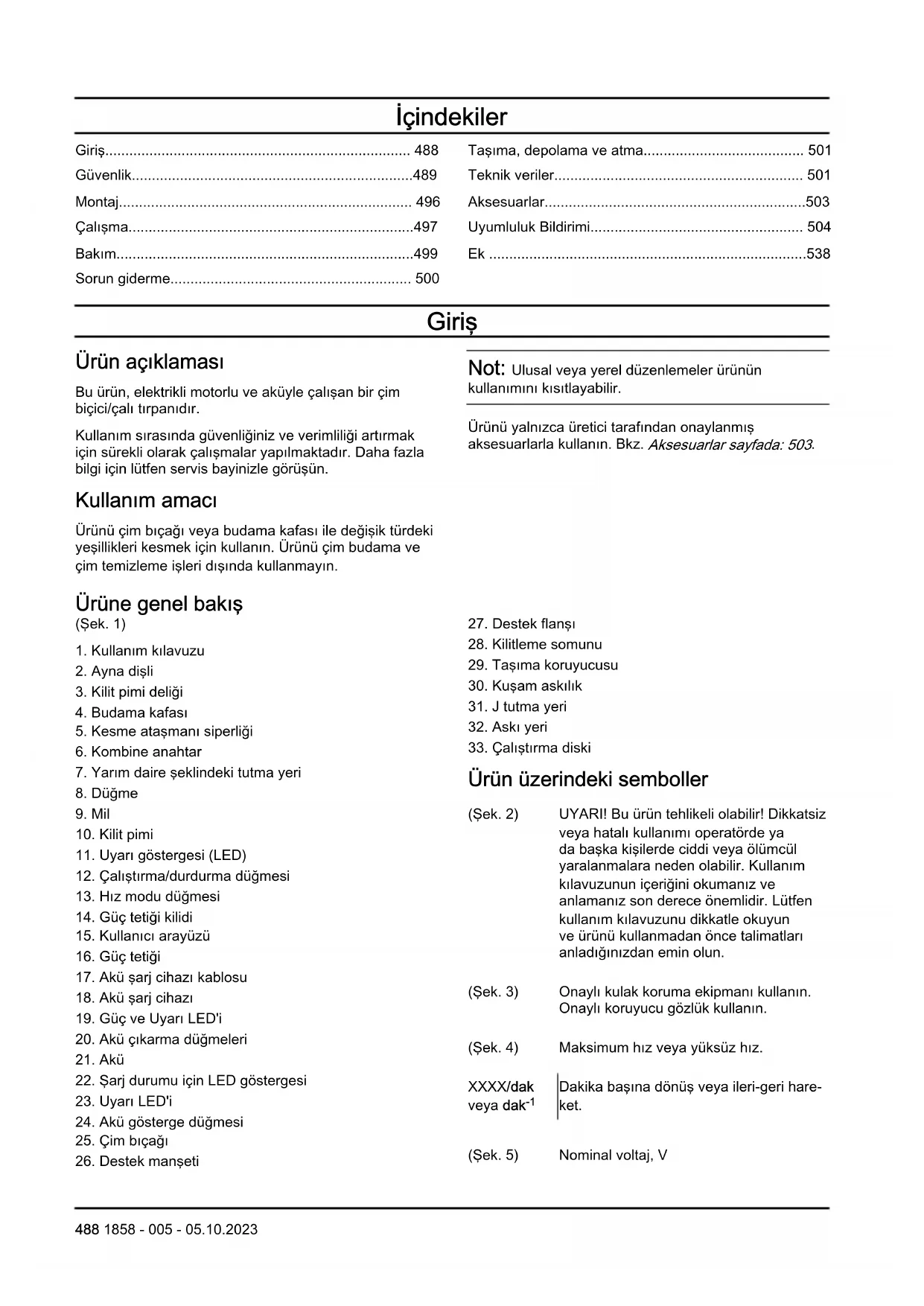 Dakika başına dönüş veya ileri-geri hare- ket. (Şek. 5) Nominal voltaj, V 488 1858 - 005 - 05.10.2023(Şek. 6) Doğru akım. (Şek. 7) Ürün, geçerli AT direktiflerine uygundur. (Şek. 8) Bu ürün yürürlükteki Birleşik Krallık yönetmeliklerine uygundur. (Şek. 9) Onaylı koruyucu eldiven kullanın. (Şek. 10) Ağır işler için elverişli, kaymaya dirençli botlar kullanın. (Şek. 11) Bıçak saplanmasına karşı dikkatli olun. (Şek. 12) Ürün veya ambalajı üzerinde bulunan semboller, bu ürünün evsel atık olarak değerlendirilemeyeceğini belirtir. Bu ürün uygun bir geri dönüşüm tesisine gönderilmelidir. (Şek. 13) Ataşman, geriye sıçrayabilecek nesneleri güçlü bir şekilde fırlatabilir. Bu, önerilen güvenlik donanımı kullanılmazsa ciddi göz yaralanmalarına neden olabilir. (Şek. 14) Bakımdan önce akünün bağlantısını kesin. (Şek. 15) Ürünün su sıçramasına karşı koruması bulunur. (Şek. 16) Vücudunuzun tüm bölümlerini sıcak yüzeylerden uzak tutun. (Şek. 17) AB ve BK direktifleri ile düzenlemeleri ve Yeni Güney Galler mevzuatı "Çevre Koruma Operasyonları (Gürültü Kontrolü) Yönetmeliği 2017" uyarınca çevreye yayılan gürültü emisyonları etiketi. Ürünün garantili ses gücü düzeyi Teknik veriler sayfada: 501
