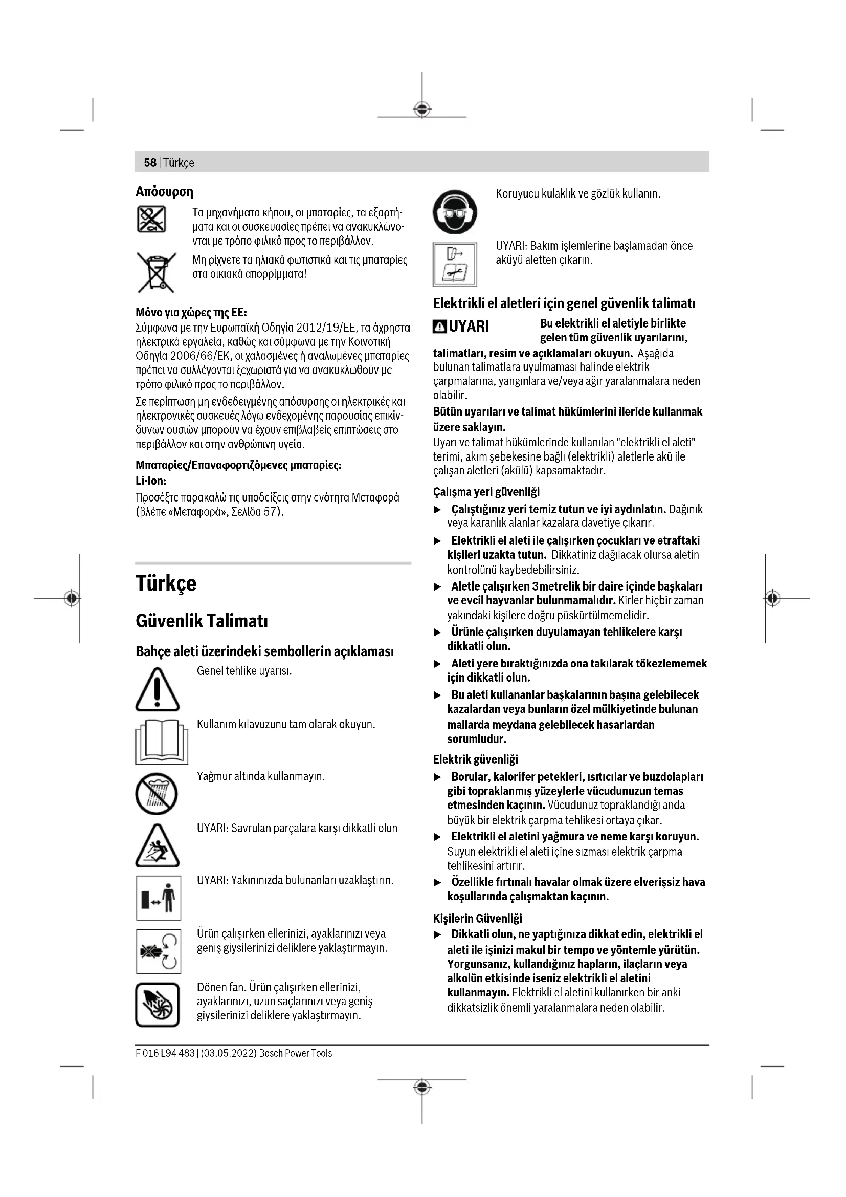 Τα μηχανήματα κήπου, οι μπαταρίες, τα εξαρτή- ματα και οι συσκευασίες πρέπει να ανακυκλώνο- νται με τρόπο φιλικό προς το περιβάλλον. Μη ρίχνετε τα ηλιακά φωτιστικά και τις μπαταρίες στα οικιακά απορρίμματα! Μόνο για χώρες τηςΕΕ: Σύμφωνα με την Ευρωπαϊκή Οδηγία 2012/19/EE, τα άχρηστα ηλεκτρικά εργαλεία, καθώς και σύμφωνα με την Κοινοτική Οδηγία 2006/66/EΚ, οι χαλασμένες ή αναλωμένες μπαταρίες πρέπει να συλλέγονται ξεχωριστά για να ανακυκλωθούν με τρόπο φιλικό προς το περιβάλλον. Σε περίπτωση μη ενδεδειγμένης απόσυρσης οι ηλεκτρικές και ηλεκτρονικές συσκευές λόγω ενδεχομένης παρουσίας επικίν- δυνων ουσιών μπορούν να έχουν επιβλαβείς επιπτώσεις στο περιβάλλον και στην ανθρώπινη υγεία. Μπαταρίες/Επαναφορτιζόμενες μπαταρίες: Li-Ion: Προσέξτε παρακαλώ τις υποδείξεις στην ενότητα Μεταφορά (βλέπε «Μεταφορά», Σελίδα57). Türkçe Güvenlik Talimatı Bahçe aleti üzerindeki sembollerin açıklaması Genel tehlike uyarısı. Kullanım kılavuzunu tam olarak okuyun. Yağmur altında kullanmayın. UYARI: Savrulan parçalara karşı dikkatli olun UYARI: Yakınınızda bulunanları uzaklaştırın. Ürün çalışırken ellerinizi, ayaklarınızı veya geniş giysilerinizi deliklere yaklaştırmayın. Dönen fan. Ürün çalışırken ellerinizi, ayaklarınızı, uzun saçlarınızı veya geniş giysilerinizi deliklere yaklaştırmayın. Koruyucu kulaklık ve gözlük kullanın. UYARI: Bakım işlemlerine başlamadan önce aküyü aletten çıkarın. Elektrikli el aletleri için genel güvenlik talimatı UYARI Bu elektrikli el aletiyle birlikte gelen tüm güvenlik uyarılarını, talimatları, resim ve açıklamaları okuyun. Aşağıda bulunan talimatlara uyulmaması halinde elektrik çarpmalarına, yangınlara ve/veya ağır yaralanmalara neden olabilir. Bütün uyarıları ve talimat hükümlerini ileride kullanmak üzere saklayın. Uyarı ve talimat hükümlerinde kullanılan "elektrikli el aleti" terimi, akım şebekesine bağlı (elektrikli) aletlerle akü ile çalışan aletleri (akülü) kapsamaktadır. Çalışma yeri güvenliği u Çalıştığınız yeri temiz tutun ve iyi aydınlatın. Dağınık veya karanlık alanlar kazalara davetiye çıkarır. u Elektrikli el aleti ile çalışırken çocukları ve etraftaki kişileri uzakta tutun. Dikkatiniz dağılacak olursa aletin kontrolünü kaybedebilirsiniz. u Aletle çalışırken 3 metrelik bir daire içinde başkaları ve evcil hayvanlar bulunmamalıdır. Kirler hiçbir zaman yakındaki kişilere doğru püskürtülmemelidir. u Ürünle çalışırken duyulamayan tehlikelere karşı dikkatli olun. u Aleti yere bıraktığınızda ona takılarak tökezlememek için dikkatli olun. u Bu aleti kullananlar başkalarının başına gelebilecek kazalardan veya bunların özel mülkiyetinde bulunan mallarda meydana gelebilecek hasarlardan sorumludur. Elektrik güvenliği u Borular, kalorifer petekleri, ısıtıcılar ve buzdolapları gibi topraklanmış yüzeylerle vücudunuzun temas etmesinden kaçının. Vücudunuz topraklandığı anda büyük bir elektrik çarpma tehlikesi ortaya çıkar. u Elektrikli el aletini yağmura ve neme karşı koruyun. Suyun elektrikli el aleti içine sızması elektrik çarpma tehlikesini artırır. u Özellikle fırtınalı havalar olmak üzere elverişsiz hava koşullarında çalışmaktan kaçının. Kişilerin Güvenliği u Dikkatli olun, ne yaptığınıza dikkat edin, elektrikli el aleti ile işinizi makul bir tempo ve yöntemle yürütün. Yorgunsanız, kullandığınız hapların, ilaçların veya alkolün etkisinde iseniz elektrikli el aletini kullanmayın. Elektrikli el aletini kullanırken bir anki dikkatsizlik önemli yaralanmalara neden olabilir. F 016 L94 483 | (03.05.2022) Bosch Power ToolsTürkçe | 59 u Daima kişisel koruyucu donanım kullanın. Daima koruyucu gözlük kullanın. Elektrikli el aletinin türü ve kullanımına uygun olarak; toz maskesi, kaymayan iş ayakkabıları, koruyucu kask veya koruyucu kulaklık gibi koruyucu donanım kullanımı yaralanma tehlikesini azaltır. u Uygun iş elbiseleri giyin. Geniş giysiler giymeyin ve takı takmayın. Saçlarınızı ve giysileriniz aletin hareketli parçalarından uzak tutun. Bol giysiler, uzun saçlar veya takılar aletin hareketli parçaları tarafından tutulabilir. u Çalışırken vücudunuz anormal durumda olmasın. Çalışırken duruşunuz güvenli olsun ve dengenizi her zaman koruyun. Bu sayede elektrikli el aletini beklenmedik durumlarda daha iyi kontrol edebilirsiniz. u Ürünle birlikte koşmayın. u Ürünü daima bel yüksekliğinde kullanın. u Aletleri sık kullanmanız sebebiyle onlara alışmış olmanız, güvenlik prensiplerine uymanızı önlememelidir. Dikkatsiz bir hareket, bir anda ciddi yaralanmalara yol açabilir. Elektrikli el aletlerinin kullanımı ve bakımı u Ürünü sadece meme takılı durumda çalıştırın. u Bütün soğutma havası deliklerini temiz tutun. u Özellikle soğuk havalarda ürünü düşük devir sayısı ile başlatın. Düşük sıcaklıklarda yüksek devir sayısı seçildiği takdirde, ürünün seçilenden daha düşük devir sayısı ile başlaması ve sonra yavaşça seçilen devir sayısına ulaşması mümkündür. u Bahçe aleti kapandıktan sonra da birkaç saniye serbest dönüşte hareket eder (hava akımının sürmesi nedeni
