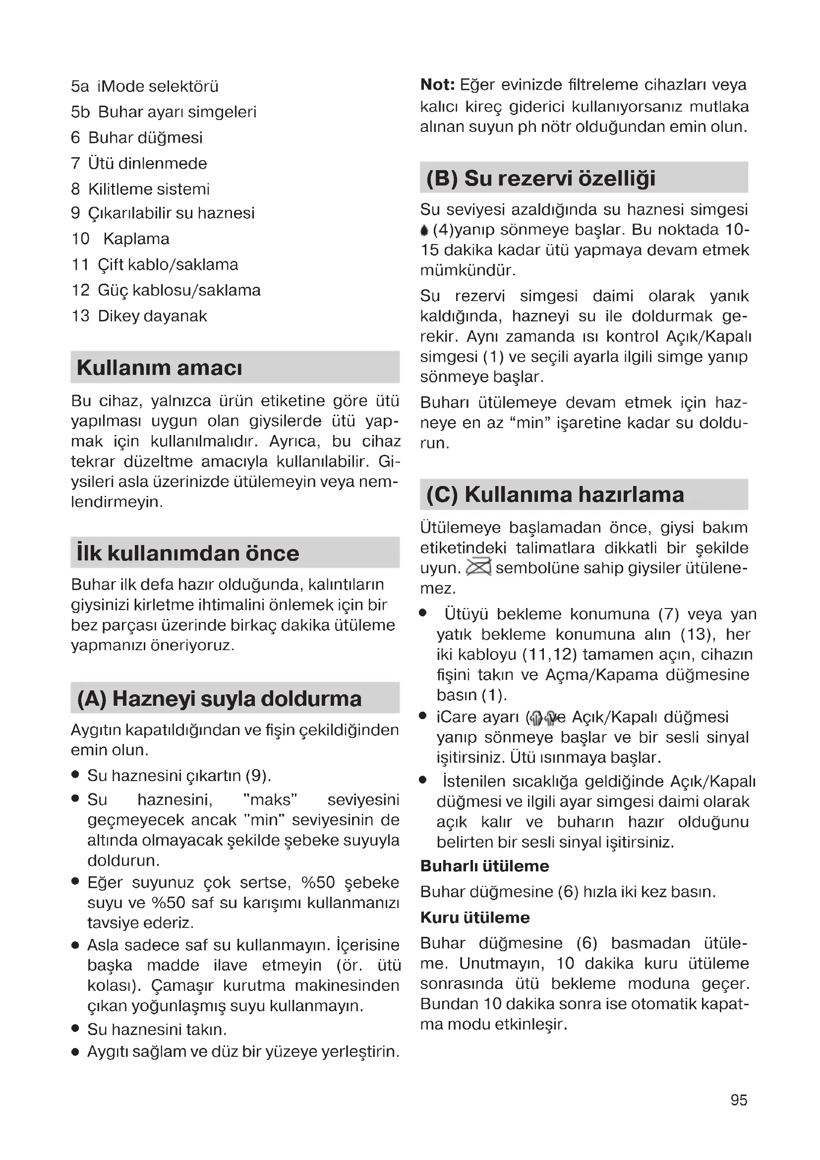 Açıklama 1 Açma/Kapama düğmesi/simgesi 2 Takviye düğmesi/simgesi (sadece belirli modellerde) 3 FastClean hızlı temizleme düğmesi/sim- gesi 4 Su haznesi simgesi 5712812451_IS72xx_INT.indd 945712812451_IS72xx_INT.indd 94 08.11.21 08:3008.11.21 08:3095 5a iMode selektörü 5b Buhar ayarı simgeleri 6 Buhar düğmesi 7 Ütü dinlenmede 8 Kilitleme sistemi 9 Çıkarılabilir su haznesi 10 Kaplama 11 Çift kablo/saklama 12 Güç kablosu/saklama 13 Dikey dayanak Kullanım amacı Bu cihaz, yalnızca ürün etiketine göre ütü yapılması uygun olan giysilerde ütü yap- mak için kullanılmalıdır. Ayrıca, bu cihaz tekrar düzeltme amacıyla kullanılabilir. Gi- ysileri asla üzerinizde ütülemeyin veya nem- lendirmeyin. İlk kullanımdan önce Buhar ilk defa hazır olduğunda, kalıntıların giysinizi kirletme ihtimalini önlemek için bir bez parçası üzerinde birkaç dakika ütüleme yapmanızı öneriyoruz. (A) Hazneyi suyla doldurma Aygıtın kapatıldığından ve fişin çekildiğinden emin olun.