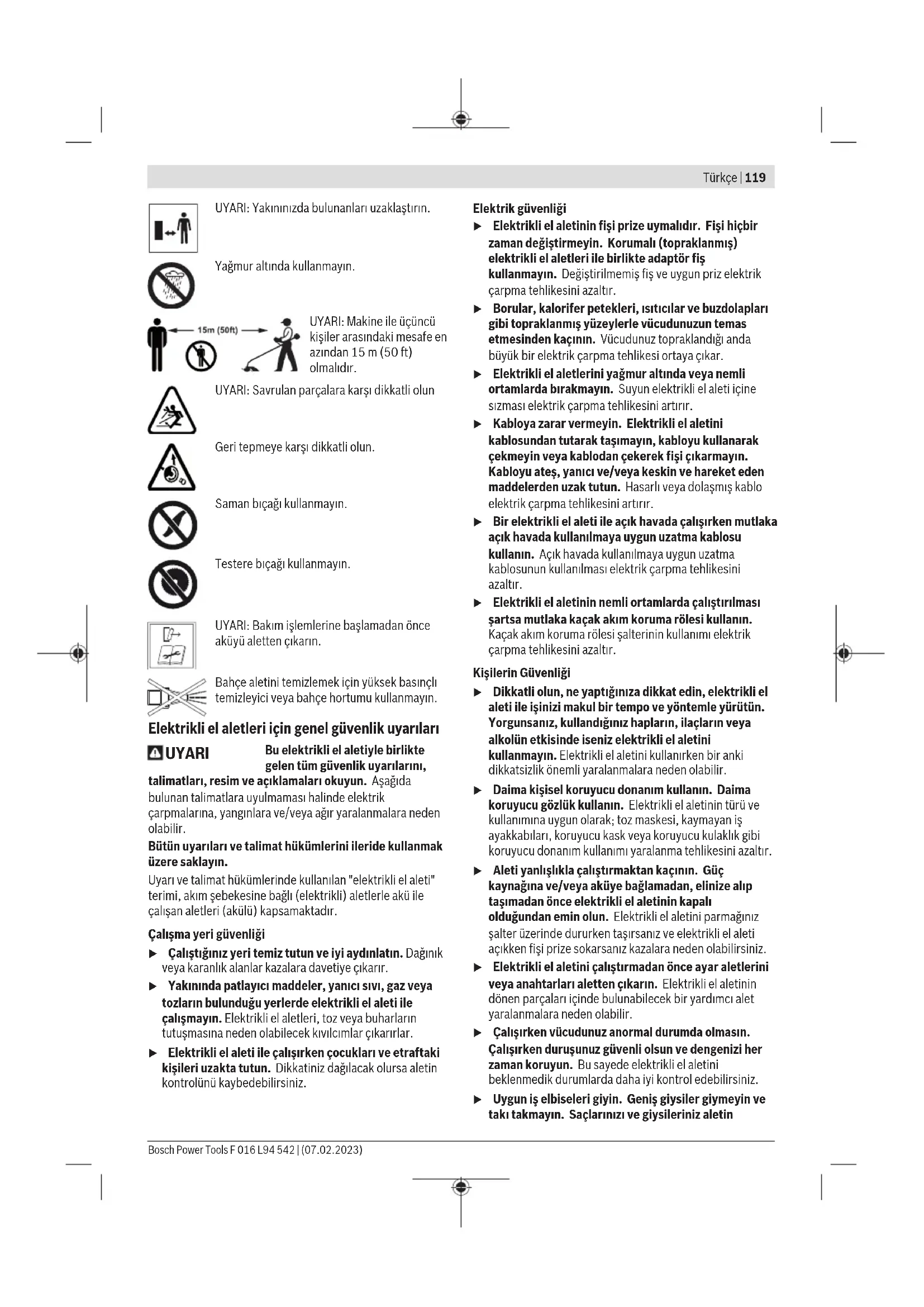 Τα μηχανήματα κήπου, οι μπαταρίες, τα εξαρτή- ματα και οι συσκευασίες πρέπει να ανακυκλώνο- νται με τρόπο φιλικό προς το περιβάλλον. Μη ρίχνετε τα ηλιακά φωτιστικά και τις μπαταρίες στα οικιακά απορρίμματα! Μόνο για χώρες τηςΕΕ: Σύμφωνα με την Ευρωπαϊκή Οδηγία 2012/19/EE, τα άχρηστα ηλεκτρικά εργαλεία, καθώς και σύμφωνα με την Κοινοτική Οδηγία 2006/66/EΚ, οι χαλασμένες ή αναλωμένες μπαταρίες πρέπει να συλλέγονται ξεχωριστά για να ανακυκλωθούν με τρόπο φιλικό προς το περιβάλλον. Σε περίπτωση μη ενδεδειγμένης απόσυρσης οι ηλεκτρικές και ηλεκτρονικές συσκευές λόγω ενδεχομένης παρουσίας επικίν- δυνων ουσιών μπορούν να έχουν επιβλαβείς επιπτώσεις στο περιβάλλον και στην ανθρώπινη υγεία. Μπαταρίες/Επαναφορτιζόμενες μπαταρίες: Li-Ion: Προσέξτε παρακαλώ τις υποδείξεις στην ενότητα Μεταφορά (βλέπε «Μεταφορά», Σελίδα118). Türkçe Güvenlik Talimatı Bahçe aleti üzerindeki sembollerin açıklaması Genel tehlike uyarısı. Kullanım kılavuzunu tam olarak okuyun. Koruyucu gözlük, kulaklık ve kask kullanın. Kaymayan iş ayakkabıları kullanın. Güvenli iş eldivenleri kullanın. F 016 L94 542 | (07.02.2023) Bosch Power ToolsTürkçe | 119 UYARI: Yakınınızda bulunanları uzaklaştırın. Yağmur altında kullanmayın. UYARI: Makine ile üçüncü kişiler arasındaki mesafe en azından 15 m (50 ft) olmalıdır. UYARI: Savrulan parçalara karşı dikkatli olun Geri tepmeye karşı dikkatli olun. Saman bıçağı kullanmayın. Testere bıçağı kullanmayın. UYARI: Bakım işlemlerine başlamadan önce aküyü aletten çıkarın. Bahçe aletini temizlemek için yüksek basınçlı temizleyici veya bahçe hortumu kullanmayın. Elektrikli el aletleri için genel güvenlik uyarıları UYARI Bu elektrikli el aletiyle birlikte gelen tüm güvenlik uyarılarını, talimatları, resim ve açıklamaları okuyun. Aşağıda bulunan talimatlara uyulmaması halinde elektrik çarpmalarına, yangınlara ve/veya ağır yaralanmalara neden olabilir. Bütün uyarıları ve talimat hükümlerini ileride kullanmak üzere saklayın. Uyarı ve talimat hükümlerinde kullanılan "elektrikli el aleti" terimi, akım şebekesine bağlı (elektrikli) aletlerle akü ile çalışan aletleri (akülü) kapsamaktadır. Çalışma yeri güvenliği u Çalıştığınız yeri temiz tutun ve iyi aydınlatın. Dağınık veya karanlık alanlar kazalara davetiye çıkarır. u Yakınında patlayıcı maddeler, yanıcı sıvı, gaz veya tozların bulunduğu yerlerde elektrikli el aleti ile çalışmayın. Elektrikli el aletleri, toz veya buharların tutuşmasına neden olabilecek kıvılcımlar çıkarırlar. u Elektrikli el aleti ile çalışırken çocukları ve etraftaki kişileri uzakta tutun. Dikkatiniz dağılacak olursa aletin kontrolünü kaybedebilirsiniz. Elektrik güvenliği u Elektrikli el aletinin fişi prize uymalıdır. Fişi hiçbir zaman değiştirmeyin. Korumalı (topraklanmış) elektrikli el aletleri ile birlikte adaptör fiş kullanmayın. Değiştirilmemiş fiş ve uygun priz elektrik çarpma tehlikesini azaltır. u Borular, kalorifer petekleri, ısıtıcılar ve buzdolapları gibi topraklanmış yüzeylerle vücudunuzun temas etmesinden kaçının. Vücudunuz topraklandığı anda büyük bir elektrik çarpma tehlikesi ortaya çıkar. u Elektrikli el aletlerini yağmur altında veya nemli ortamlarda bırakmayın. Suyun elektrikli el aleti içine sızması elektrik çarpma tehlikesini artırır. u Kabloya zarar vermeyin. Elektrikli el aletini kablosundan tutarak taşımayın, kabloyu kullanarak çekmeyin veya kablodan çekerek fişi çıkarmayın. Kabloyu ateş, yanıcı ve/veya keskin ve hareket eden maddelerden uzak tutun. Hasarlı veya dolaşmış kablo elektrik çarpma tehlikesini artırır. u Bir elektrikli el aleti ile açık havada çalışırken mutlaka açık havada kullanılmaya uygun uzatma kablosu kullanın. Açık havada kullanılmaya uygun uzatma kablosunun kullanılması elektrik çarpma tehlikesini azaltır. u Elektrikli el aletinin nemli ortamlarda çalıştırılması şartsa mutlaka kaçak akım koruma rölesi kullanın. Kaçak akım koruma rölesi şalterinin kullanımı elektrik çarpma tehlikesini azaltır. Kişilerin Güvenliği u Dikkatli olun, ne yaptığınıza dikkat edin, elektrikli el aleti ile işinizi makul bir tempo ve yöntemle yürütün. Yorgunsanız, kullandığınız hapların, ilaçların veya alkolün etkisinde iseniz elektrikli el aletini kullanmayın. Elektrikli el aletini kullanırken bir anki dikkatsizlik önemli yaralanmalara neden olabilir. u Daima kişisel koruyucu donanım kullanın. Daima koruyucu gözlük kullanın. Elektrikli el aletinin türü ve kullanımına uygun olarak; toz maskesi, kaymayan iş ayakkabıları, koruyucu kask veya koruyucu kulaklık gibi koruyucu donanım kullanımı yaralanma tehlikesini azaltır. u Aleti yanlışlıkla çalıştırmaktan kaçının. Güç kaynağına ve/veya aküye bağlamadan, elinize alıp taşımadan önce elektrikli el aletinin kapalı olduğundan emin olun. Elektrikli el aletini parmağınız şalter üzerinde dururken taşırsanız ve elektrikli el aleti açıkken fişi prize sokarsanız kazalara neden olabilirsiniz. u Elektrikli el aletini çalıştırmadan önce ayar aletlerini veya anahtarları aletten çıkarın. Elektrikli el aletinin dönen parçaları i