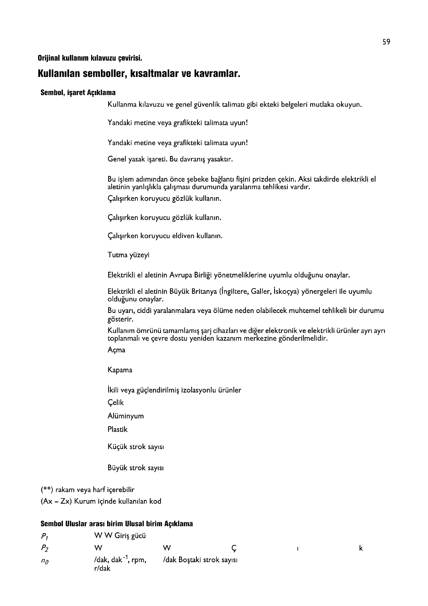 Orijinal kullanım kılavuzu çevirisi. Kullanılan semboller, kısaltmalar ve kavramlar. Sembol, işaret Açıklama Kullanma kılavuzu ve genel güvenlik talimatı gibi ekteki belgeleri mutlaka okuyun. Yandaki metine veya grafikteki talimata uyun! Yandaki metine veya grafikteki talimata uyun! Genel yasak işareti. Bu davranış yasaktır. Bu işlem adımından önce şebeke bağlantı fişini prizden çekin. Aksi takdirde elektrikli el aletinin yanlışlıkla çalışması durumunda yaralanma tehlikesi vardır. Çalışırken koruyucu gözlük kullanın. Çalışırken koruyucu gözlük kullanın. Çalışırken koruyucu eldiven kullanın. Tutma yüzeyi Elektrikli el aletinin Avrupa Birliği yönetmeliklerine uyumlu olduğunu onaylar. Elektrikli el aletinin Büyük Britanya (İngiltere, Galler, İskoçya) yönergeleri ile uyumlu olduğunu onaylar. Bu uyarı, ciddi yaralanmalara veya ölüme neden olabilecek muhtemel tehlikeli bir durumu gösterir. Kullanım ömrünü tamamlamış şarj cihazları ve diğer elektronik ve elektrikli ürünler ayrı ayrı toplanmalı ve çevre dostu yeniden kazanım merkezine gönderilmelidir. Açma Kapama İkili veya güçlendirilmiş izolasyonlu ürünler Çelik Alüminyum Plastik Küçük strok sayısı Büyük strok sayısı (**) rakam veya harf içerebilir (Ax – Zx) Kurum içinde kullanılan kod Sembol Uluslar arası birim Ulusal birim Açıklama