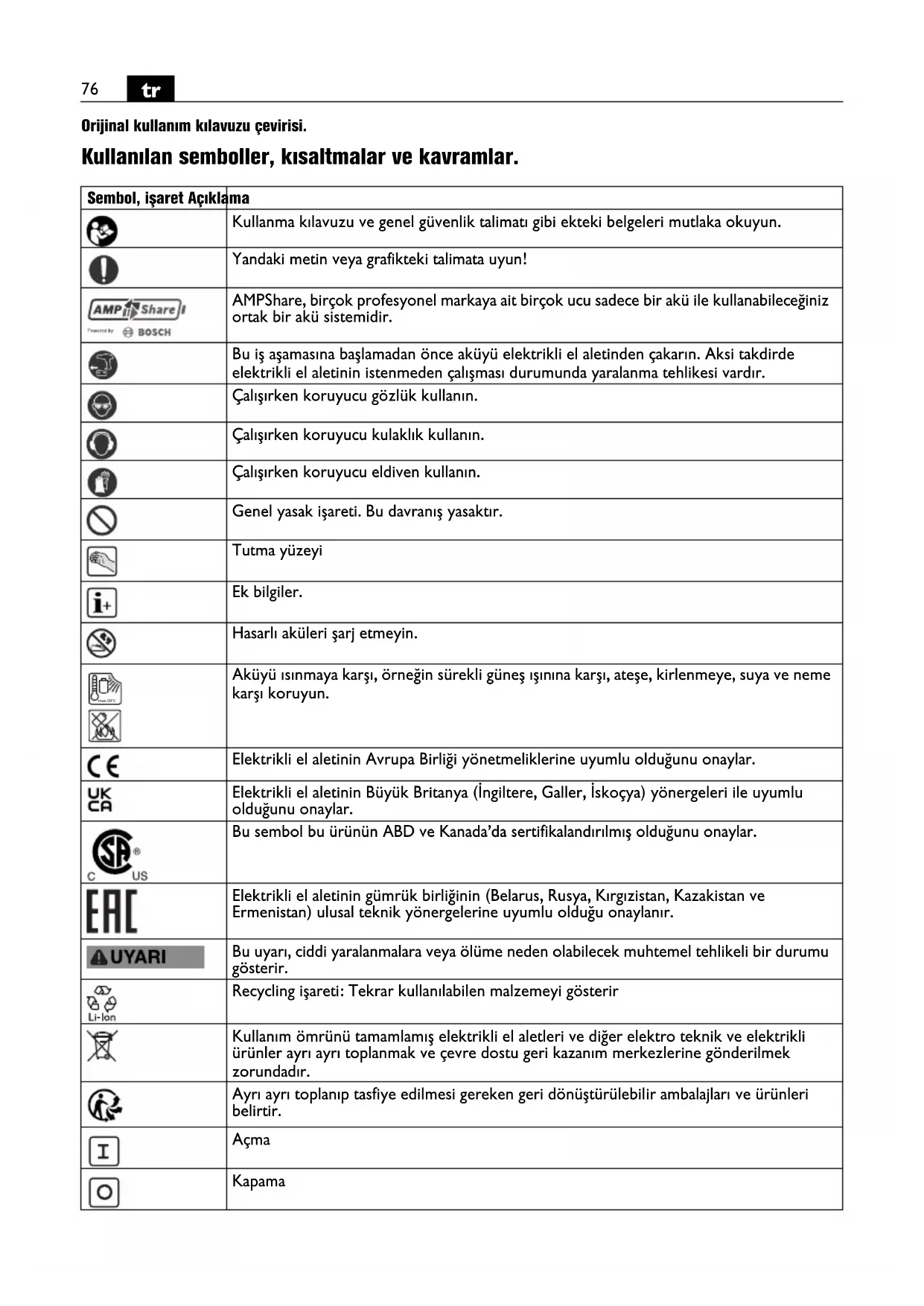 Orijinal kullanım kılavuzu çevirisi. Kullanılan semboller, kısaltmalar ve kavramlar. Sembol, işaret Açıklama Kullanma kılavuzu ve genel güvenlik talimatı gibi ekteki belgeleri mutlaka okuyun. Yandaki metin veya grafikteki talimata uyun! AMPShare, birçok profesyonel markaya ait birçok ucu sadece bir akü ile kullanabileceğiniz ortak bir akü sistemidir. Bu iş aşamasına başlamadan önce aküyü elektrikli el aletinden çakarın. Aksi takdirde elektrikli el aletinin istenmeden çalışması durumunda yaralanma tehlikesi vardır. Çalışırken koruyucu gözlük kullanın. Çalışırken koruyucu kulaklık kullanın. Çalışırken koruyucu eldiven kullanın. Genel yasak işareti. Bu davranış yasaktır. Tutma yüzeyi Ek bilgiler. Hasarlı aküleri şarj etmeyin. Aküyü ısınmaya karşı, örneğin sürekli güneş ışınına karşı, ateşe, kirlenmeye, suya ve neme karşı koruyun. Elektrikli el aletinin Avrupa Birliği yönetmeliklerine uyumlu olduğunu onaylar. Elektrikli el aletinin Büyük Britanya (İngiltere, Galler, İskoçya) yönergeleri ile uyumlu olduğunu onaylar. Bu sembol bu ürünün ABD ve Kanada’da sertifikalandırılmış olduğunu onaylar. Elektrikli el aletinin gümrük birliğinin (Belarus, Rusya, Kırgızistan, Kazakistan ve Ermenistan) ulusal teknik yönergelerine uyumlu olduğu onaylanır. Bu uyarı, ciddi yaralanmalara veya ölüme neden olabilecek muhtemel tehlikeli bir durumu gösterir. Recycling işareti: Tekrar kullanılabilen malzemeyi gösterir Kullanım ömrünü tamamlamış elektrikli el aletleri ve diğer elektro teknik ve elektrikli ürünler ayrı ayrı toplanmak ve çevre dostu geri kazanım merkezlerine gönderilmek zorundadır. Ayrı ayrı toplanıp tasfiye edilmesi gereken geri dönüştürülebilir ambalajları ve ürünleri belirtir. Açma Kapama max.50°C77