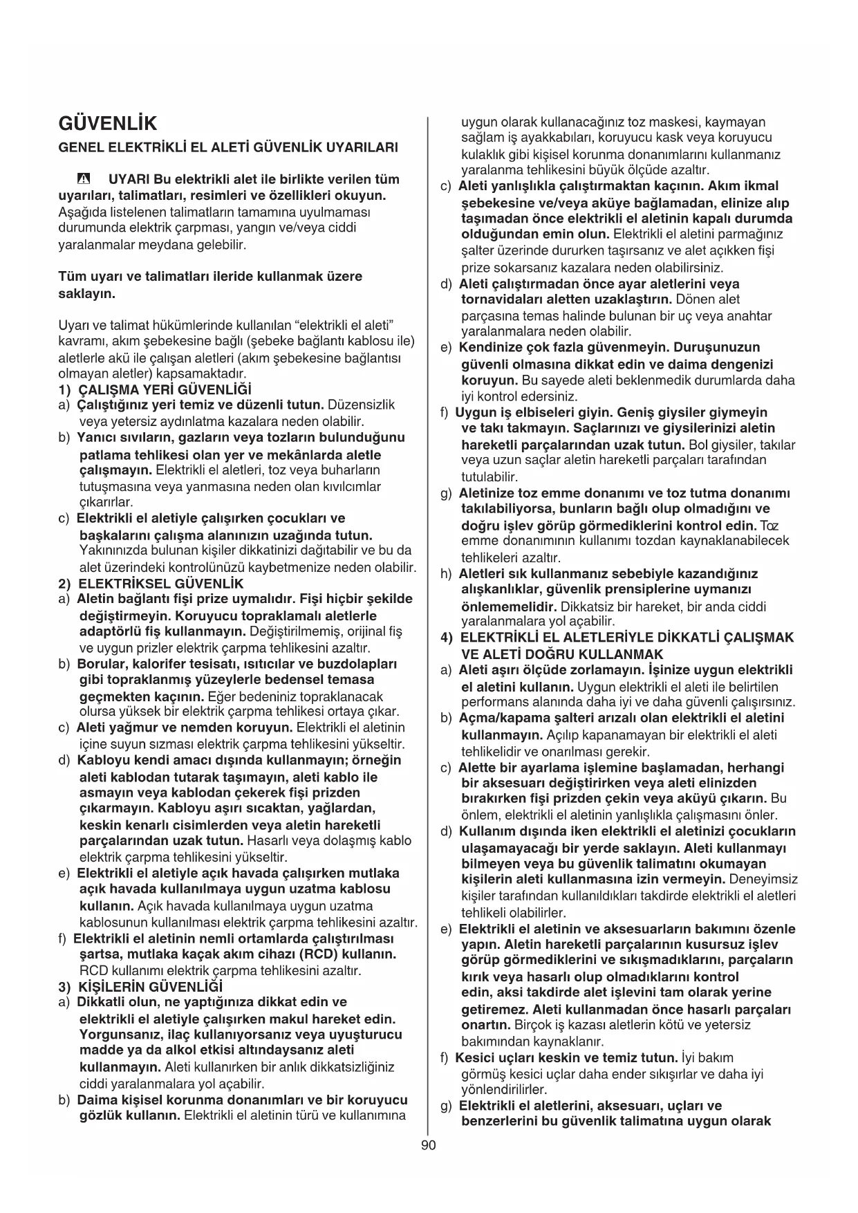 a) Dikkatli olun, ne yaptığınıza dikkat edin ve elektrikli el aletiyle çalışırken makul hareket edin. Yorgunsanız, ilaç kullanıyorsanız veya uyuşturucu madde ya da alkol etkisi altındaysanız aleti kullanmayın. Aleti kullanırken bir anlık dikkatsizliğiniz ciddi yaralanmalara yol açabilir. b) Daima kişisel korunma donanımları ve bir koruyucu gözlük kullanın. Elektrikli el aletinin türü ve kullanımına91