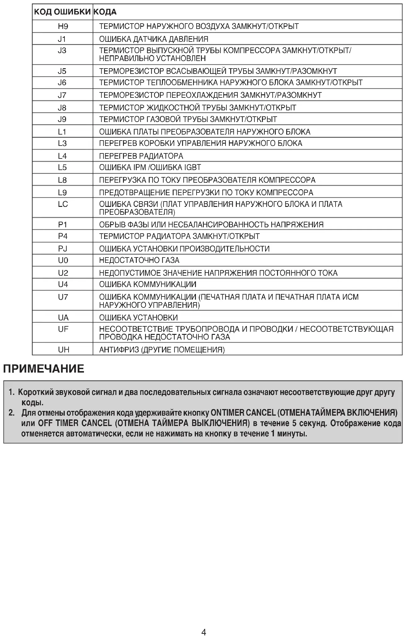 Sıcaklık gösterge bölümleri ilgili kodları gösterir. ON TIMER CANCEL (Zaman Ayarı Açık İptal) düğmesine veya OFF TIMER CANCEL (Zaman Ayarı Kapalı İptal) düğmesi 5 saniye basılı tutulduğunda, sıcaklık gösterge bölümünde “ ” iişareti yanıp sönmeye başlar. Sürekli bir uyarı sesi çıkana kadar ON TIMER CANCEL (Zaman Ayarı Açık İptal) düğmesine veya OFF TIMER CANCEL (Zaman Ayarı Kapalı İptal) düğmesine aralıksız olarak basın. Kod göstergesi aşağıda gösterildiği şekilde değişir ve uzun bir uyarı sesi çıkarak bildirir.