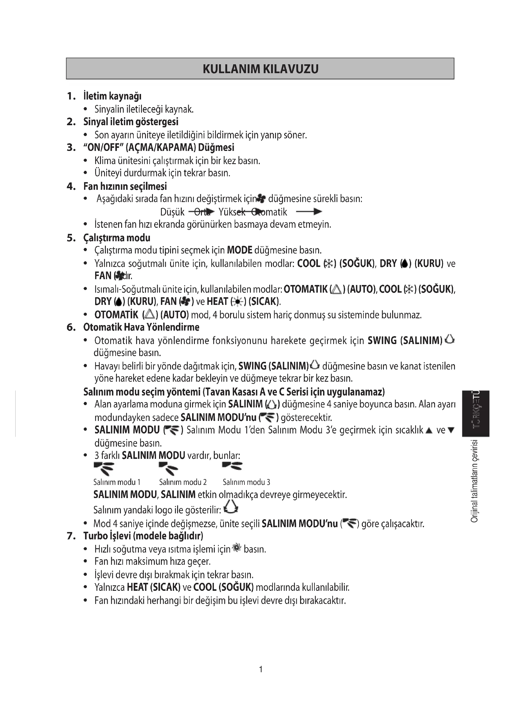 KULLANIM KILAVUZU İletim kaynağı Sinyalin iletileceği kaynak. Sinyal iletim göstergesi Son ayarın üniteye iletildiğini bildirmek için yanıp söner. “ON/OFF” (AÇMA/KAPAMA) Düğmesi Klima ünitesini çalıştırmak için bir kez basın. Üniteyi durdurmak için tekrar basın. Fan hızının seçilmesi Aşağıdaki sırada fan hızını değiştirmek için düğmesine sürekli basın: Düşük Orta Yüksek Otomatik İstenen fan hızı ekranda görünürken basmaya devam etmeyin. Çalıştırma modu Çalıştırma modu tipini seçmek için MODE düğmesine basın. Yalnızca soğutmalı ünite için, kullanılabilen modlar: COOL ( ) (SOĞUK), DRY ( ) (KURU) ve FAN ( )’dır. Isımalı-Soğutmalı ünite için, kullanılabilen modlar: OTOMATIK ( ) (AUTO), COOL ( ) (SOĞUK), DRY ( ) (KURU), FAN ( ) ve HEAT ( ) (SICAK). OTOMATİK ( ) (AUTO) mod, 4 borulu sistem hariç donmuş su sisteminde bulunmaz. Otomatik Hava Yönlendirme Otomatik hava yönlendirme fonksiyonunu harekete geçirmek için SWING (SALINIM) düğmesine basın. Havayı belirli bir yönde dağıtmak için, SWING (SALINIM) düğmesine basın ve kanat istenilen yöne hareket edene kadar bekleyin ve düğmeye tekrar bir kez basın. Salınım modu seçim yöntemi (Tavan Kasası A ve C Serisi için uygulanamaz) Alan ayarlama moduna girmek için SALINIM ( ) düğmesine 4 saniye boyunca basın. Alan ayarı modundayken sadece SALINIM MODU’nu ( ) gösterecektir. SALINIM MODU ( ) Salınım Modu 1’den Salınım Modu 3’e geçirmek için sıcaklık ve düğmesine basın. 3 farklı SALINIM MODU vardır, bunlar: Salınım modu 1 Salınım modu 2 Salınım modu 3 SALINIM MODU, SALINIM etkin olmadıkça devreye girmeyecektir. Salınım yandaki logo ile gösterilir: Mod 4 saniye içinde değişmezse, ünite seçili SALINIM MODU’nu ( ) göre çalışacaktır. Turbo İşlevi (modele bağlıdır) Hızlı soğutma veya ısıtma işlemi için basın. Fan hızı maksimum hıza geçer. İşlevi devre dışı bırakmak için tekrar basın. Yalnızca HEAT (SICAK) ve COOL (SOĞUK) modlarında kullanılabilir. Fan hızındaki herhangi bir değişim bu işlevi devre dışı bırakacaktır.