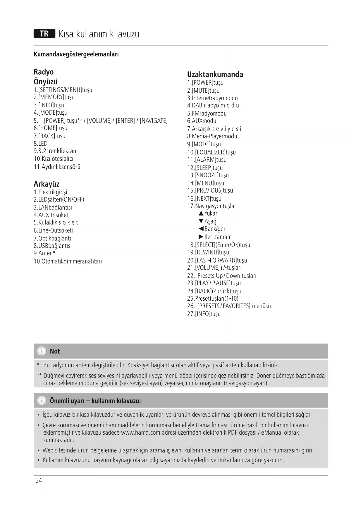 Not *Buradyonunanteni değiştirilebilir.Koaksiyelbağlantısı olan aktif veya pasif anten kullanabilirsiniz. ** Düğmeyi çevirerek ses seviyesini ayarlayabilir veya menü ağacı içerisinde gezinebilirsiniz. Döner düğmeye bastığınızda cihaz bekleme moduna geçirilir (ses seviyesi ayarı)veya seçiminiz onaylanır(navigasyon ayarı). Önemli uyarı –kullanımkılavuzu: