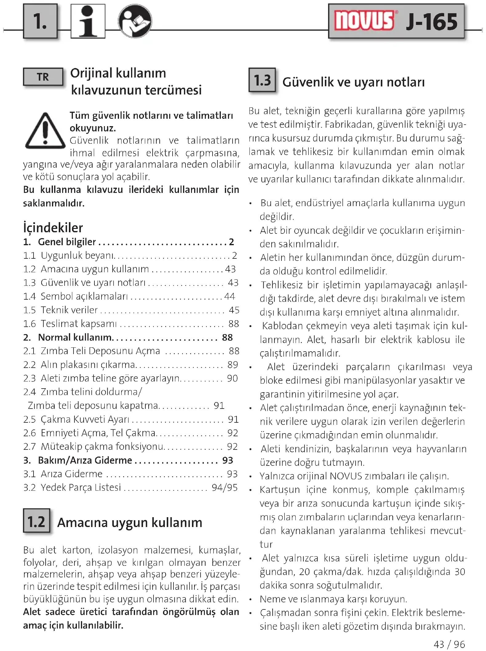 Güvenlik ve uyarı notları Bu alet, tekniğin geçerli kurallarına göre yapılmış ve test edilmiştir. Fabrikadan, güvenlik tekniği uya-rınca kusursuz durumda çıkmıştır. Bu durumu sağ-lamak ve tehlikesiz bir kullanımdan emin olmak amacıyla, kullanma kılavuzunda yer alan notlar ve uyarılar kullanıcı tarafından dikkate alınmalıdır.• Bu alet, endüstriyel amaçlarla kullanıma uygun değildir.• Alet bir oyuncak değildir ve çocukların erişimin-den sakınılmalıdır.• Aletin her kullanımından önce, düzgün durum-da olduğu kontrol edilmelidir. • Tehlikesiz bir işletimin yapılamayacağı anlaşıl-dığı takdirde, alet devre dışı bırakılmalı ve istem dışı kullanıma karşı emniyet altına alınmalıdır.• Kablodan çekmeyin veya aleti taşımak için kul-lanmayın. Alet, hasarlı bir elektrik kablosu ile çalıştırılmamalıdır.• Alet üzerindeki parçaların çıkarılması veya bloke edilmesi gibi manipülasyonlar yasaktır ve garantinin yitirilmesine yol açar.• Alet çalıştırılmadan önce, enerji kaynağının tek-nik verilere uygun olarak izin verilen değerlerin üzerine çıkmadığından emin olunmalıdır.• Aleti kendinizin, başkalarının veya hayvanların üzerine doğru tutmayın.• Yalnızca orijinal NOVUS zımbaları ile çalışın. • Kartuşun içine konmuş, komple çakılmamış veya bir arıza sonucunda kartuşun içinde sıkış-mış olan zımbaların uçlarından veya kenarların-dan kaynaklanan yaralanma tehlikesi mevcut- tur