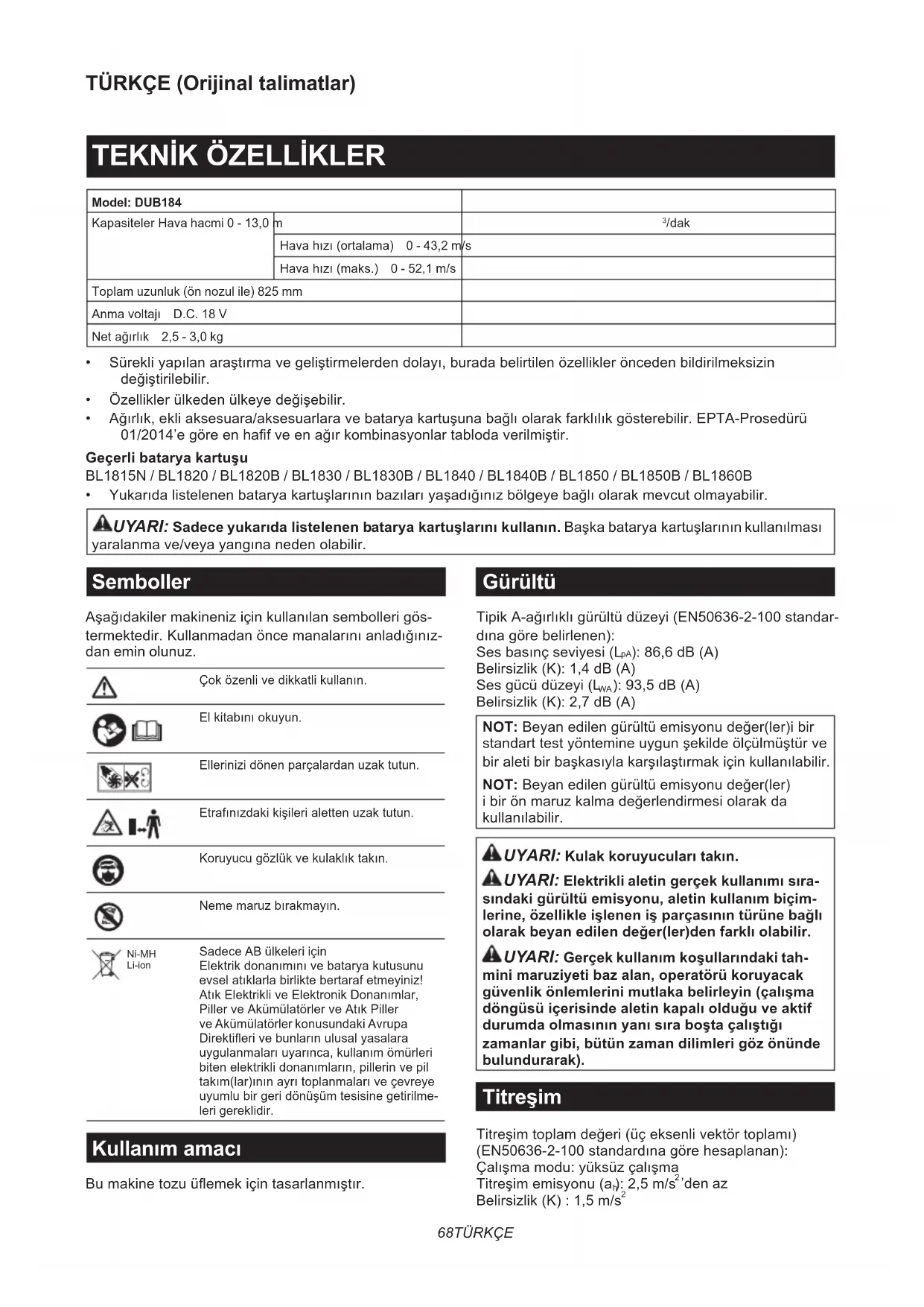 - Ağırlık,ekliaksesuara/aksesuarlaravebataryakartuşunabağlıolarakfarklılıkgösterebilir.EPTA-Prosedürü 01/2014’egöreenhafveenağırkombinasyonlartablodaverilmiştir. Geçerli batarya kartuşu BL1815N / BL1820 / BL1820B / BL1830 / BL1830B / BL1840 / BL1840B / BL1850 / BL1850B / BL1860B