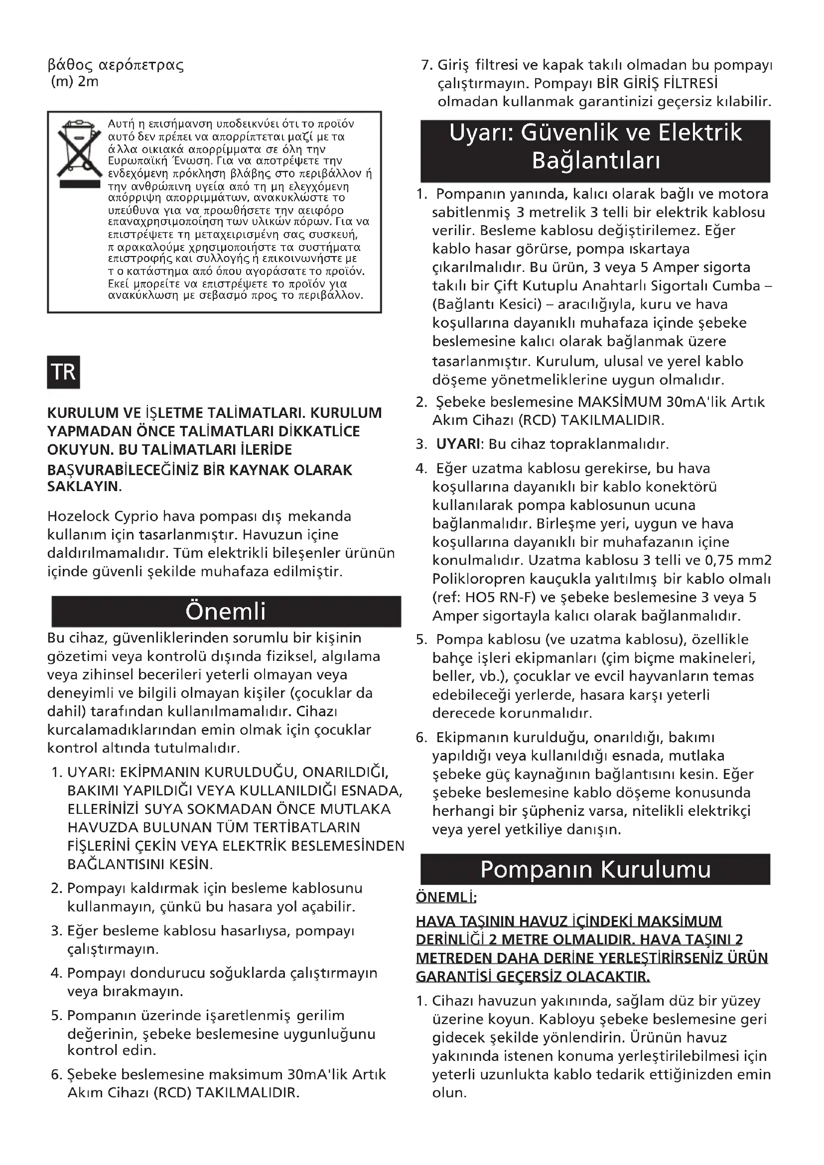üzerine koyun. Kabloyu şebeke beslemesine geri gidecek şekilde yönlendirin. Ürünün havuz yakınında istenen konuma yerleştirilebilmesi için yeterli uzunlukta kablo tedarik ettiğinizden emin olun. Uyarı: Güvenlik ve Elektrik Bağlantıları Pompanın Kurulumu Αυτή ηεπισήμανση υποδεικνύει ότι το προϊόν αυτό δεν πρέπει να απορρίπτεται μαζί με τα