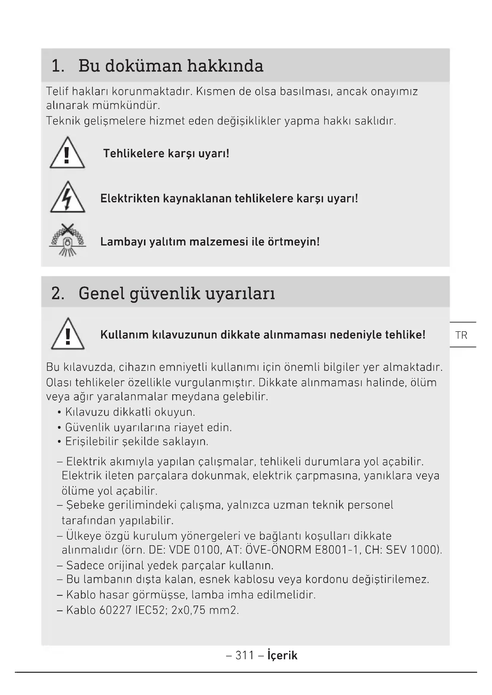 - Erişilebilir şekilde saklayın. – Elektrik akımıyla yapılan çalışmalar, tehlikeli durumlara yol açabilir. Elektrik ileten parçalara dokunmak, elektrik çarpmasına, yanıklara veya ölüme yol açabilir. – Şebeke gerilimindeki çalışma, yalnızca uzman teknik personel tarafından yapılabilir. – Ülkeye özgü kurulum yönergeleri ve bağlantı koşulları dikkate alınmalıdır (örn. DE: VDE0100, AT:ÖVE-ÖNORM E8001-1, CH:SEV1000). – Sadece orijinal yedek parçalar kullanın. – Bu lambanın dışta kalan, esnek kablosu veya kordonu değiştirilemez. – Kablo hasar görmüşse, lamba imha edilmelidir. – Kablo 60227 IEC52; 2x0,75 mm2.– 312 – İçerik