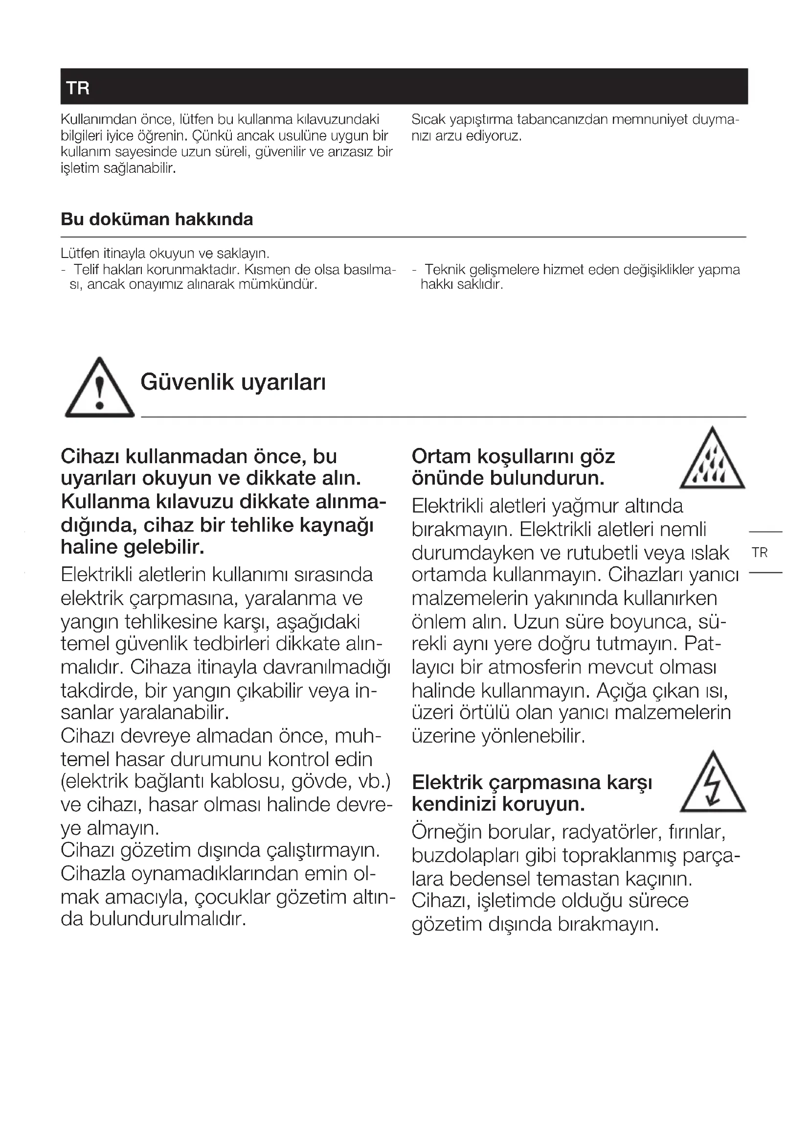 Güvenlik uyarıları Kullanımdan önce, lütfen bu kullanma kılavuzundaki bilgileri iyice öğrenin. Çünkü ancak usulüne uygun bir kullanım sayesinde uzun süreli, güvenilir ve arızasız bir işletim sağlanabilir. Sıcak yapıştırma tabancanızdan memnuniyet duyma- nızı arzu ediyoruz. TROrijinal Kullanma Kılavuzu Bu doküman hakkında Lütfen itinayla okuyun ve saklayın. - Telif hakları korunmaktadır. Kısmen de olsa basılma- sı, ancak onayımız alınarak mümkündür. - Teknik gelişmelere hizmet eden değişiklikler yapma hakkı saklıdır. Cihazı kullanmadan önce, bu uyarıları okuyun ve dikkate alın. Kullanma kılavuzu dikkate alınma- dığında, cihaz bir tehlike kaynağı haline gelebilir. Elektrikli aletlerin kullanımı sırasında elektrik çarpmasına, yaralanma ve yangın tehlikesine karşı, aşağıdaki temel güvenlik tedbirleri dikkate alın- malıdır. Cihaza itinayla davranılmadığı takdirde, bir yangın çıkabilir veya in- sanlar yaralanabilir. Cihazı devreye almadan önce, muh- temel hasar durumunu kontrol edin (elektrik bağlantı kablosu, gövde, vb.) ve cihazı, hasar olması halinde devre- ye almayın. Cihazı gözetim dışında çalıştırmayın. Cihazla oynamadıklarından emin ol- mak amacıyla, çocuklar gözetim altın- da bulundurulmalıdır. Ortam koşullarını göz önünde bulundurun. Elektrikli aletleri yağmur altında bırakmayın. Elektrikli aletleri nemli durumdayken ve rutubetli veya ıslak ortamda kullanmayın. Cihazları yanıcı malzemelerin yakınında kullanırken önlem alın. Uzun süre boyunca, sü- rekli aynı yere doğru tutmayın. Pat- layıcı bir atmosferin mevcut olması halinde kullanmayın. Açığa çıkan ısı, üzeri örtülü olan yanıcı malzemelerin üzerine yönlenebilir. Elektrik çarpmasına karşı kendinizi koruyun. Örneğin borular, radyatörler, fırınlar, buzdolapları gibi topraklanmış parça- lara bedensel temastan kaçının. Cihazı, işletimde olduğu sürece gözetim dışında bırakmayın.