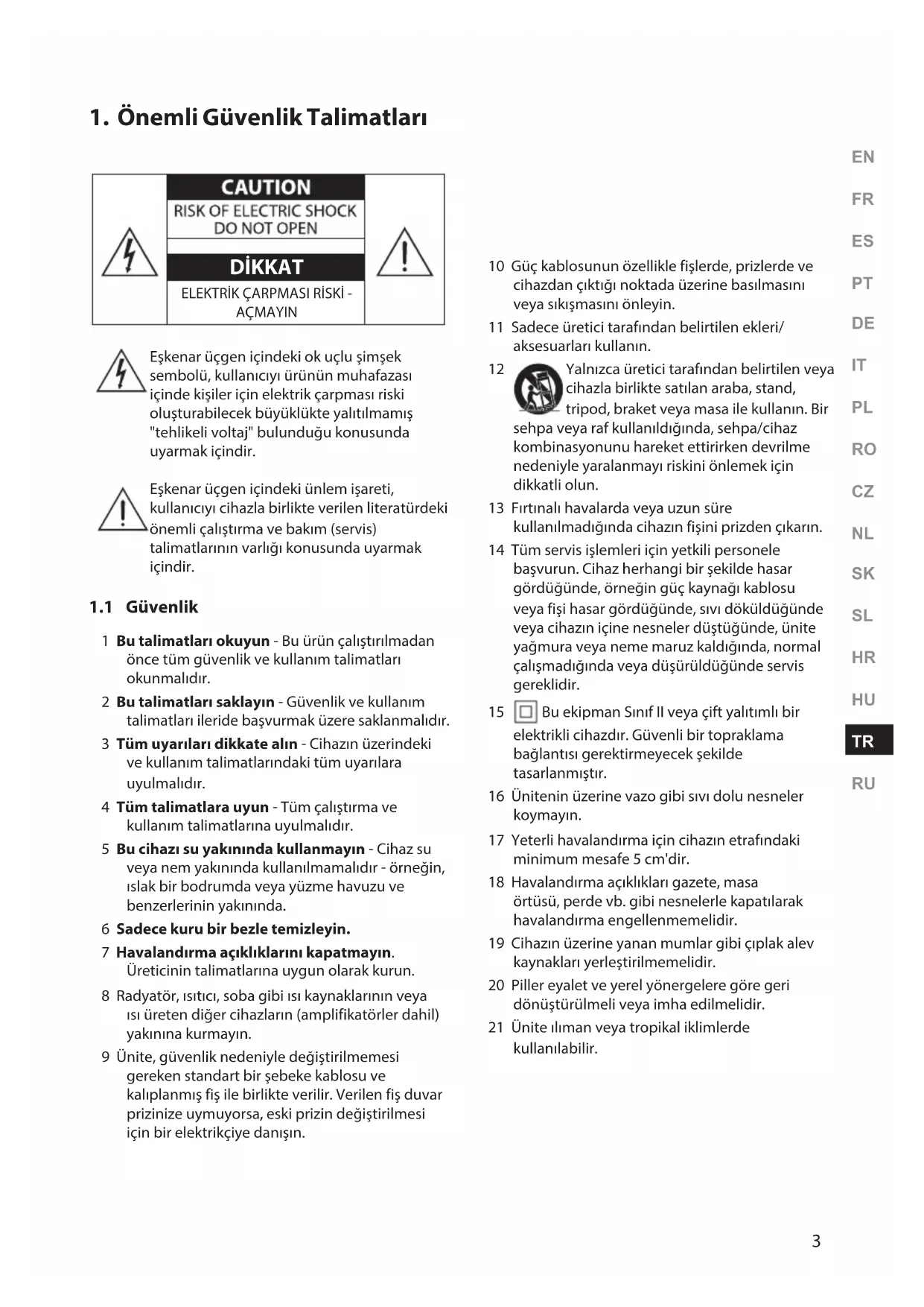 1 Bu talimatları okuyun - Bu ürün çalıştırılmadan önce tüm güvenlik ve kullanım talimatları okunmalıdır.2 Bu talimatları saklayın - Güvenlik ve kullanım talimatları ileride başvurmak üzere saklanmalıdır.3 Tüm uyarıları dikkate alın - Cihazın üzerindeki ve kullanım talimatlarındaki tüm uyarılara uyulmalıdır.4 Tüm talimatlara uyun - Tüm çalıştırma ve kullanım talimatlarına uyulmalıdır.5 Bu cihazı su yakınında kullanmayın - Cihaz su veya nem yakınında kullanılmamalıdır - örneğin, ıslak bir bodrumda veya yüzme havuzu ve benzerlerinin yakınında.6 Sadece kuru bir bezle temizleyin.7 Havalandırma açıklıklarını kapatmayın. Üreticinin talimatlarına uygun olarak kurun.8 Radyatör, ısıtıcı, soba gibi ısı kaynaklarının veya ısı üreten diğer cihazların (amplifikatörler dahil) yakınına kurmayın.9 Ünite, güvenlik nedeniyle değiştirilmemesi gereken standart bir şebeke kablosu ve kalıplanmış fiş ile birlikte verilir. Verilen fiş duvar prizinize uymuyorsa, eski prizin değiştirilmesi için bir elektrikçiye danışın.