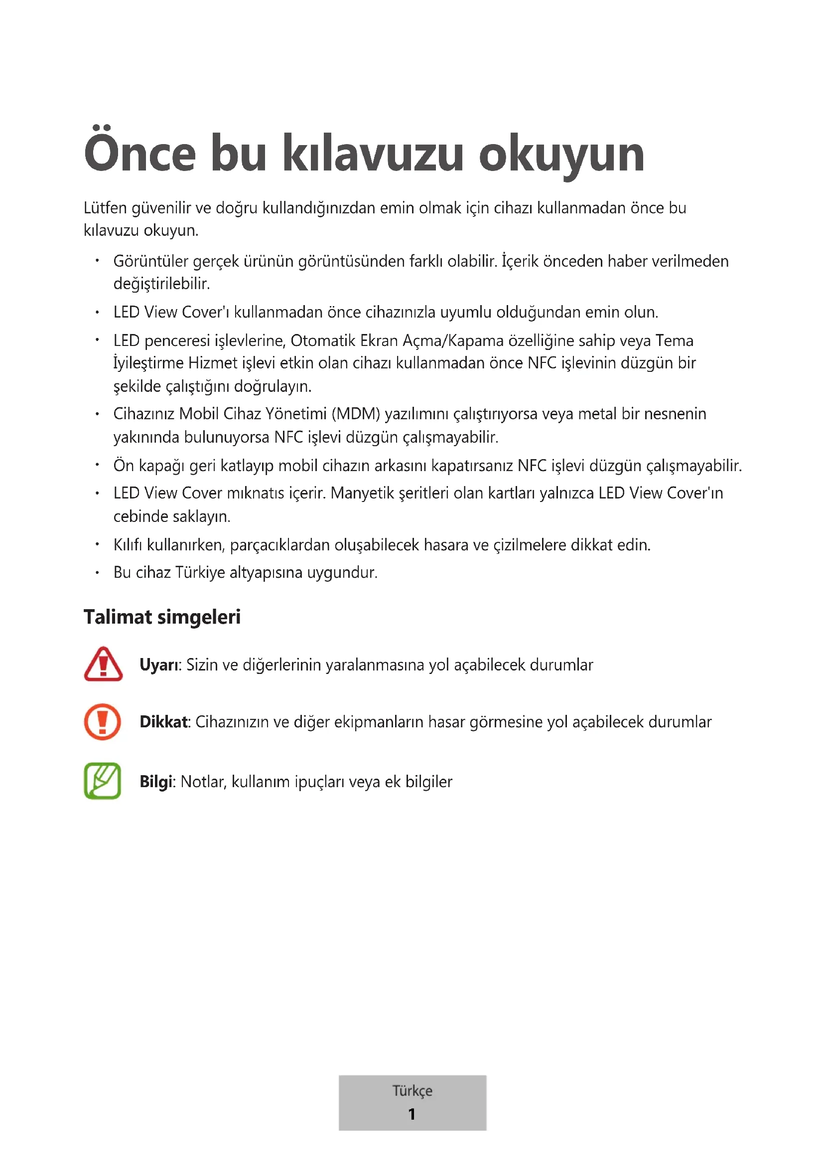 LED penceresi işlevlerine, Otomatik Ekran Açma/Kapama özelliğine sahip veya Tema İyileştirme Hizmet işlevi etkin olan cihazı kullanmadan önce NFC işlevinin düzgün bir şekilde çalıştığını doğrulayın.