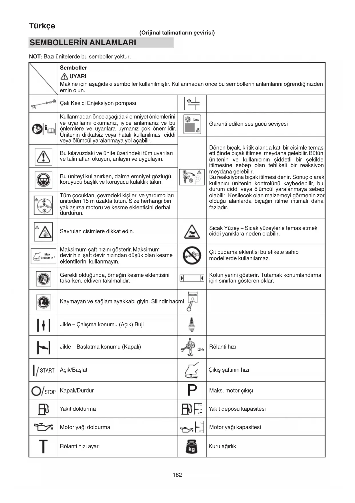 NOT: Bazı ünitelerde bu semboller yoktur. Semboller UYARI Makine için aşağıdaki semboller kullanılmıştır. Kullanmadan önce bu sembollerin anlamlarını öğrendiğinizden emin olun. Çalı Kesici Enjeksiyon pompası Kullanmadan önce aşağıdaki emniyet önlemlerini ve uyarılarını okumanız, iyice anlamanız ve bu önlemlere ve uyarılara uymanız çok önemlidir. Ünitenin dikkatsiz veya hatalı kullanılması ciddi veya ölümcül yaralanmaya yol açabilir. Garanti edilen ses gücü seviyesi Dönen bıçak, kritik alanda katı bir cisimle temas ettiğinde bıçak itilmesi meydana gelebilir. Bütün ünitenin ve kullanıcının şiddetli bir şekilde itilmesine sebep olan tehlikeli bir reaksiyon meydana gelebilir. Bu reaksiyona bıçak itilmesi denir. Sonuç olarak kullanıcı ünitenin kontrolünü kaybedebilir, bu durum ciddi veya ölümcül yaralanmaya sebep olabilir. Kesilecek olan malzemeyi görmenin zor olduğu alanlarda bıçağın itilme ihtimali daha fazladır. Bu kılavuzdaki ve ünite üzerindeki tüm uyarıları ve talimatları okuyun, anlayın ve uygulayın. Bu üniteyi kullanırken, daima emniyet gözlüğü, koruyucu başlık ve koruyucu kulaklık takın. Tüm çocukları, çevredeki kişileri ve yardımcıları üniteden 15 m uzakta tutun. Size herhangi biri yaklaşırsa motoru ve kesme eklentisini derhal durdurun. Savrulan cisimlere dikkat edin. Sıcak Yüzey – Sıcak yüzeylerle temas etmek ciddi yanıklara neden olabilir. min