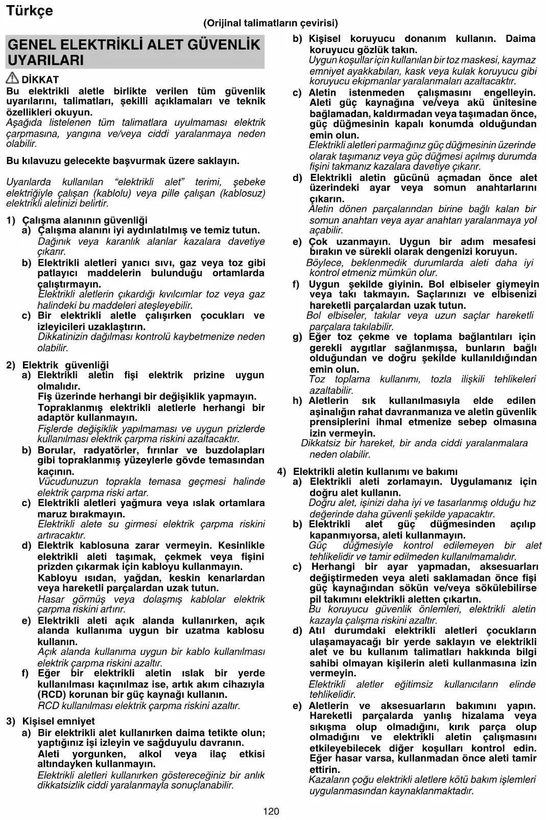 a) Elektrikli aleti zorlamayın. Uygulamanız için doğru alet kullanın. Doğru alet, işinizi daha iyi ve tasarlanmış olduğu hız değerinde daha güvenli şekilde yapacaktır. b) Elektrikli alet güç düğmesinden açılıp kapanmıyorsa, aleti kullanmayın. Güç düğmesiyle kontrol edilemeyen bir alet tehlikelidir ve tamir edilmeden kullanılmamalıdır. c) Herhangi bir ayar yapmadan, aksesuarları değiştirmeden veya aleti saklamadan önce fi şi güç kaynağından sökün ve/veya sökülebilirse pil takımını elektrikli aletten çıkartın. Bu koruyucu güvenlik önlemleri, elektrikli aletin kazayla çalışma riskini azaltır. d) Atı l durumdaki elektrikli aletleri çocukların ulaşamayacağı bir yerde saklayın ve elektrikli alet ve bu kullanım talimatları hakkında bilgi sahibi olmayan kişilerin aleti kullanmasına izin vermeyin. Elektrikli aletler eğitimsiz kullanıcıların elinde tehlikelidir. e) Aletlerin ve aksesuarların bakımını yapın. Hareketli parçalarda yanlış hizalama veya sıkışma olup olmadığını, kırık parça olup olmadığını ve elektrikli aletin çalışmasını etkileyebilecek diğer koşulları kontrol edin. Eğer hasar varsa, kullanmadan önce aleti tamir ettirin. Kazaların çoğu elektrikli aletlere kötü bakım işlemleri uygulanması ndan kaynaklanmaktadır. GENEL ELEKTRİKLİ ALET GÜVENLİK UYARILARI DİKKAT Bu elektrikli aletle birlikte verilen tüm güvenlik uyarılarını, talimatları, şekilli açıklamaları ve teknik özellikleri okuyun. Aşağıda listelenen tüm talimatlara uyulmaması elektrik çarpmasına, yangına ve/veya ciddi yaralanmaya neden olabilir. Bu kılavuzu gelecekte başvurmak üzere saklayın. Uyarılarda kullanılan “elektrikli alet” terimi, şebeke elektriğiyle çalışan (kablolu) veya pille çalışan (kablosuz) elektrikli aletinizi belirtir.