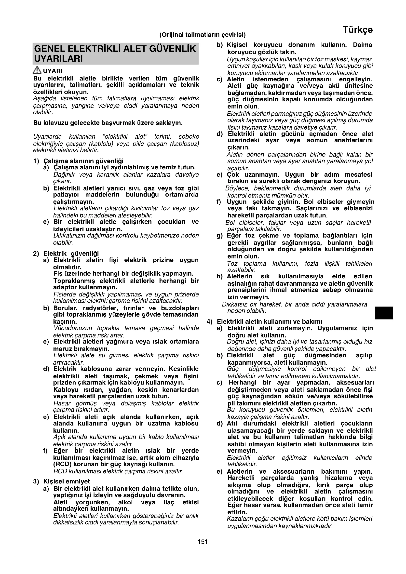 a) Elektrikli aleti zorlamayın. Uygulamanız için doğru alet kullanın. Doğru alet, işinizi daha iyi ve tasarlanmış olduğu hız değerinde daha güvenli şekilde yapacaktır. b) Elektrikli alet güç düğmesinden açılıp kapanmıyorsa, aleti kullanmayın. Güç düğmesiyle kontrol edilemeyen bir alet tehlikelidir ve tamir edilmeden kullanılmamalıdır. c) Herhangi bir ayar yapmadan, aksesuarları değiştirmeden veya aleti saklamadan önce fi şi güç kaynağından sökün ve/veya sökülebilirse pil takımını elektrikli aletten çıkartın. Bu koruyucu güvenlik önlemleri, elektrikli aletin kazayla çalışma riskini azaltır. d) Atı l durumdaki elektrikli aletleri çocukların ulaşamayacağı bir yerde saklayın ve elektrikli alet ve bu kullanım talimatları hakkında bilgi sahibi olmayan kişilerin aleti kullanmasına izin vermeyin. Elektrikli aletler eğitimsiz kullanıcıların elinde tehlikelidir. e) Aletlerin ve aksesuarların bakımını yapın. Hareketli parçalarda yanlış hizalama veya sıkışma olup olmadığını, kırık parça olup olmadığını ve elektrikli aletin çalışmasını etkileyebilecek diğer koşulları kontrol edin. Eğer hasar varsa, kullanmadan önce aleti tamir ettirin. Kazaların çoğu elektrikli aletlere kötü bakım işlemleri uygulanması ndan kaynaklanmaktadır. GENEL ELEKTRİKLİ ALET GÜVENLİK UYARILARI UYARI Bu elektrikli aletle birlikte verilen tüm güvenlik uyarılarını, talimatları, şekilli açıklamaları ve teknik özellikleri okuyun. Aşağıda listelenen tüm talimatlara uyulmaması elektrik çarpmasına, yangına ve/veya ciddi yaralanmaya neden olabilir. Bu kılavuzu gelecekte başvurmak üzere saklayın. Uyarılarda kullanılan “elektrikli alet” terimi, şebeke elektriğiyle çalışan (kablolu) veya pille çalışan (kablosuz) elektrikli aletinizi belirtir.