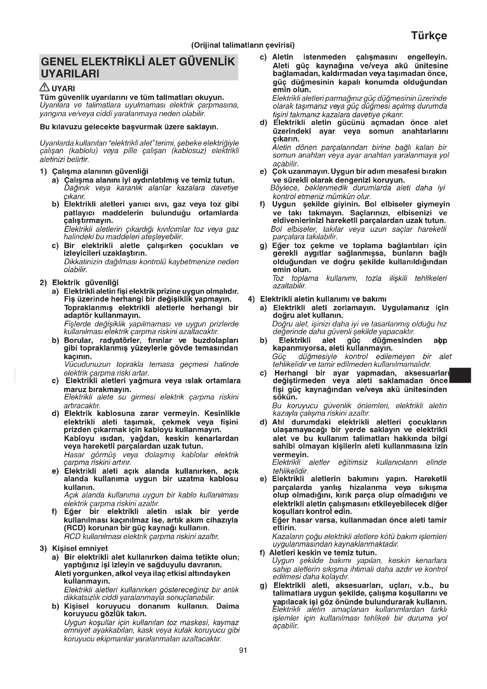 a) Elektrikli aleti zorlamayın. Uygulamanız için doğru alet kullanın. Doğru alet, işinizi daha iyi ve tasarlanmış olduğu hız değerinde daha güvenli şekilde yapacaktır. b) Elektrikli alet güç düğmesinden açı lıp kapanmıyorsa, aleti kullanmayın. Güç düğmesiyle kontrol edilemeyen bir alet tehlikelidir ve tamir edilmeden kullanılmamalıdır. c) Herhangi bir ayar yapmadan, aksesuarları değiştirmeden veya aleti saklamadan önce fi şi güç kaynağından ve/veya akü ünitesinden sökün. Bu koruyucu güvenlik önlemleri, elektrikli aletin kazayla çalışma riskini azaltır. d) Atıl durumdaki elektrikli aletleri çocukların ulaşamayacağı bir yerde saklayın ve elektrikli alet ve bu kullanım talimatları hakkında bilgi sahibi olmayan kişilerin aleti kullanmasına izin vermeyin. Elektrikli aletler eğitimsiz kullanıcıların elinde tehlikelidir. e) Elektrikli aletlerin bakımını yapın. Hareketli parçalarda yanlış hizalanma veya sıkışma olup olmadığını , kırık parça olup olmadığını ve elektrikli aletin çalışmasını etkileyebilecek diğer koşulları kontrol edin. Eğer hasar varsa, kullanmadan önce aleti tamir ettirin. Kazaların çoğu elektrikli aletlere kötü bakım işlemleri uygulanmasından kaynaklanmaktadır. f) Aletleri keskin ve temiz tutun. Uygun şekilde bakımı yapılan, keskin kenarlara sahip aletlerin sıkışma ihtimali daha azdır ve kontrol edilmesi daha kolaydır. g) Elektrikli aleti, aksesuarları, uçları, v.b., bu talimatlara uygun şekilde, çalışma koşullarını ve yapılacak işi göz önünde bulundurarak kullanın. Elektrikli aletin amaçlanan kullanımlardan farklı işlemler için kullanılması tehlikeli bir duruma yol açabilir. GENEL ELEKTRİKLİ ALET GÜVENLİK UYARILARI UYARI Tüm güvenlik uyarılarını ve tüm talimatları okuyun. Uyarılara ve talimatlara uyulmaması elektrik çarpmasına, yangına ve/veya ciddi yaralanmaya neden olabilir. Bu kılavuzu gelecekte başvurmak üzere saklayın. Uyarılarda kullanılan “elektrikli alet” terimi, şebeke elektriğiyle çalışan (kablolu) veya pille çalışan (kablosuz) elektrikli aletinizi belirtir.